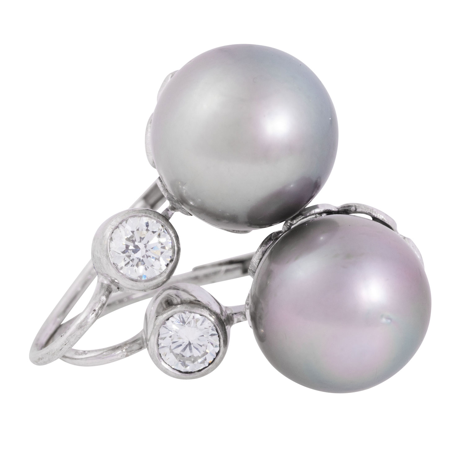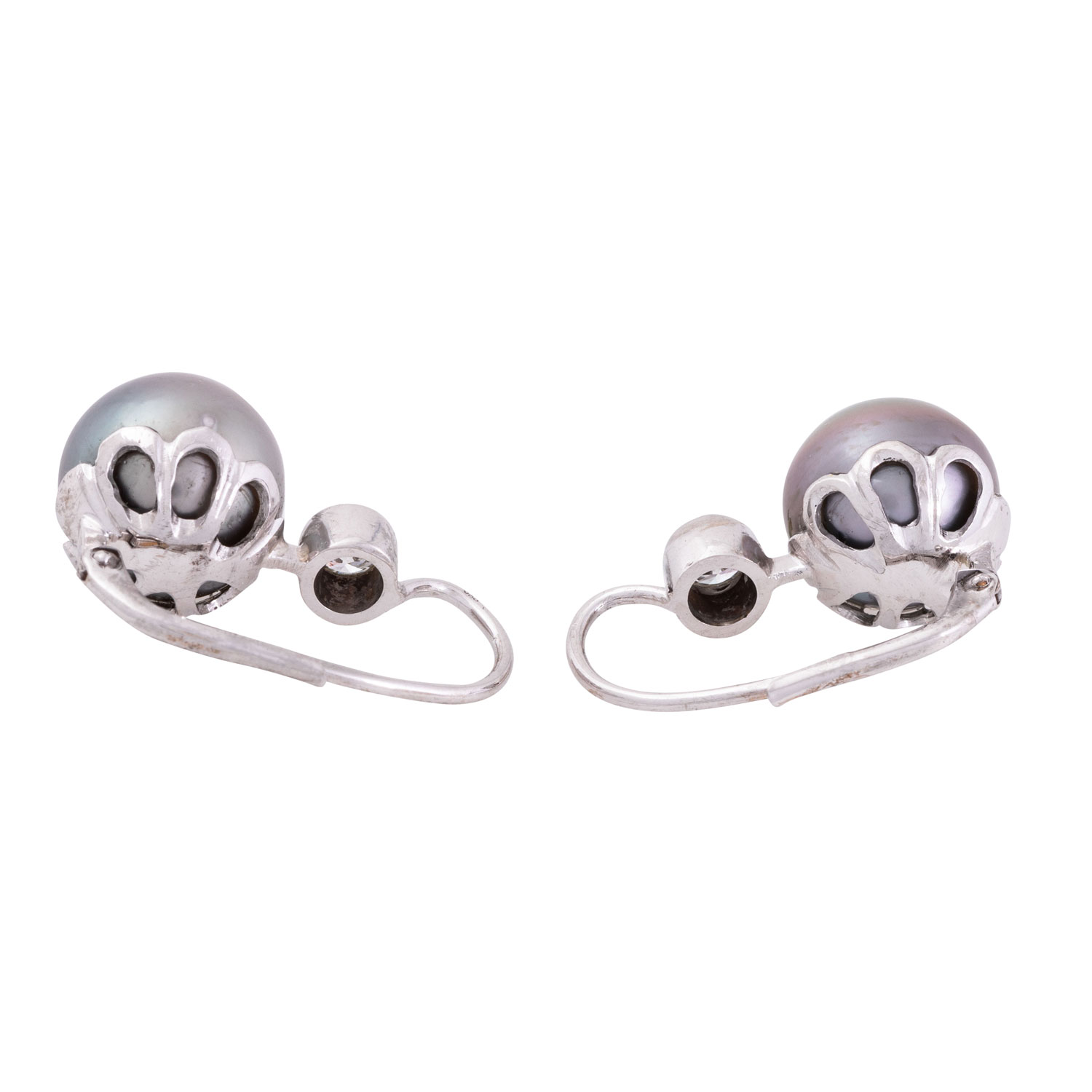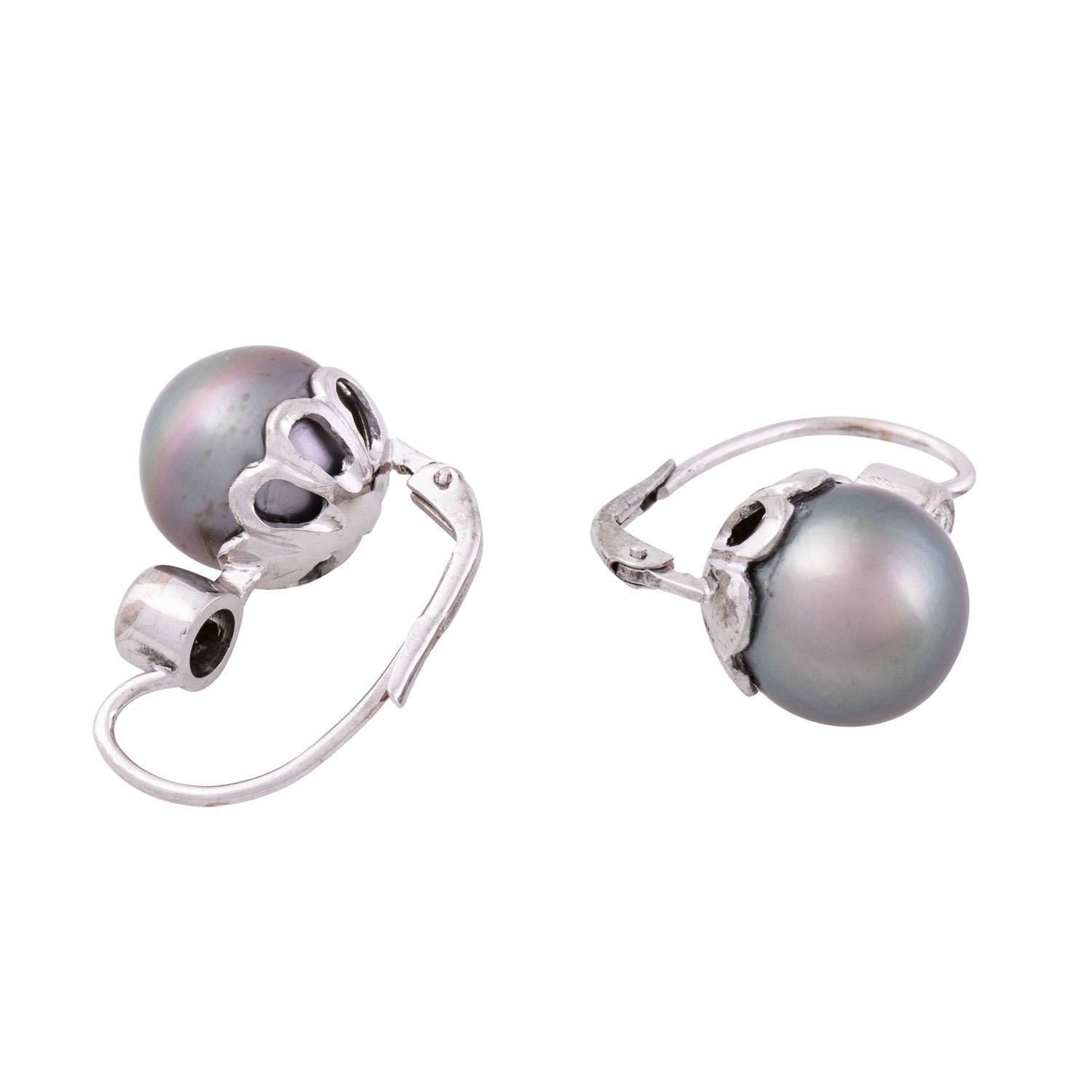 Pair of earrings set with silver-grey tahitian-cultured pearls, dia.: approx. 10 - 10,5 mm, slight signs of growth and 2 brilliant-cut diamonds totalling approx. 0.45 ct, approx. TIW (K-L)/VS2, 14K WG, 21st century, mint condition.