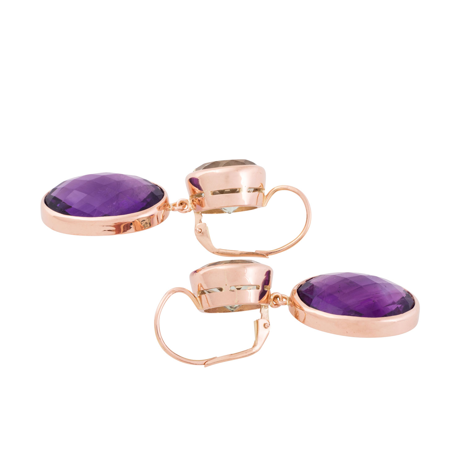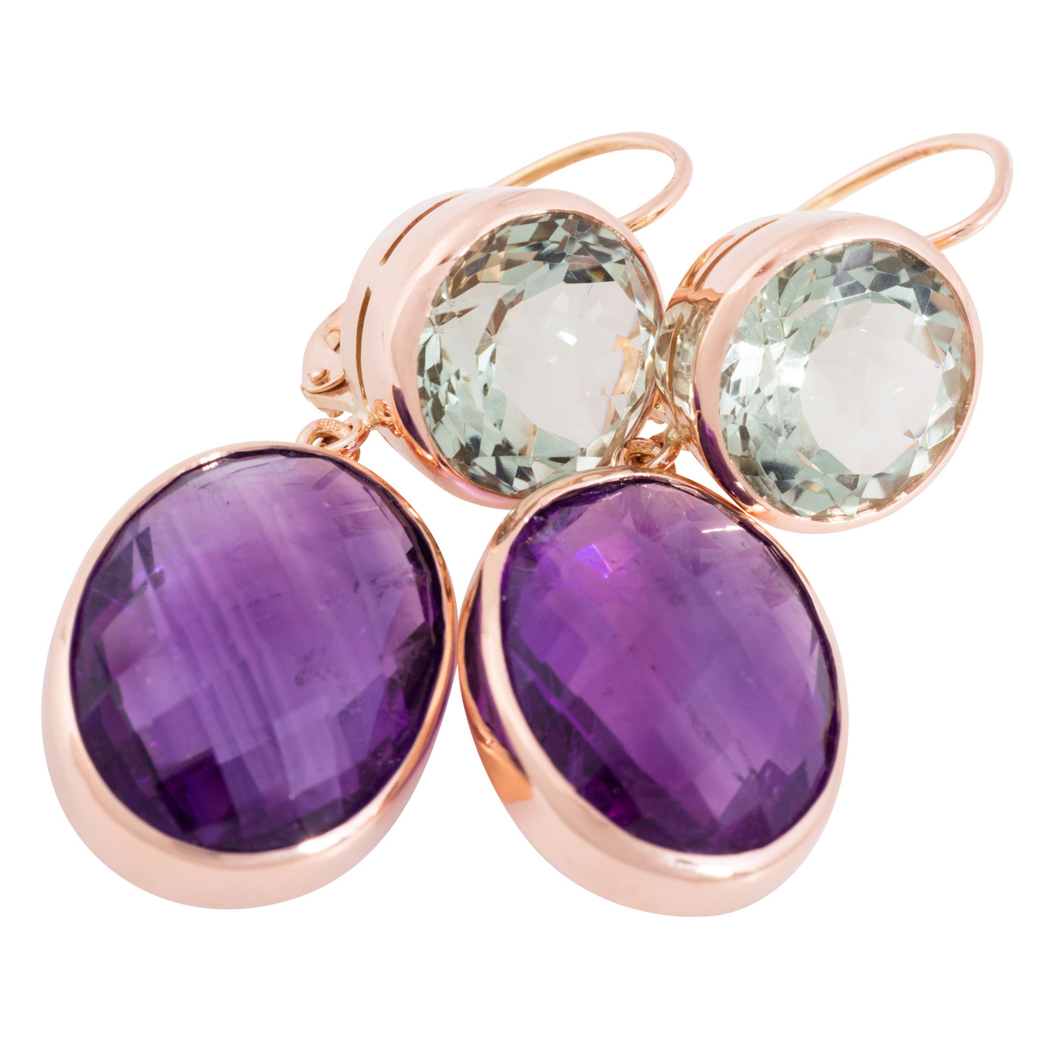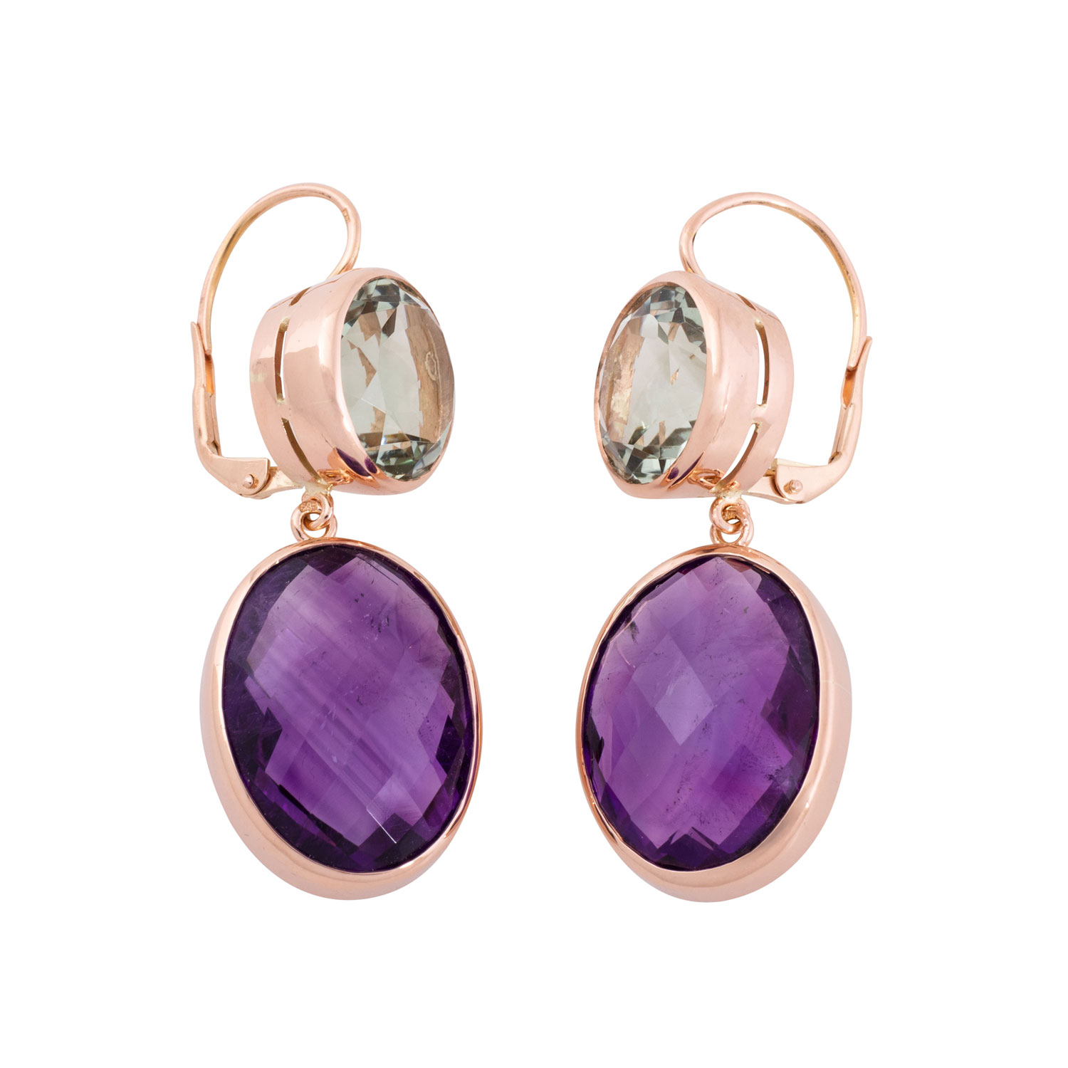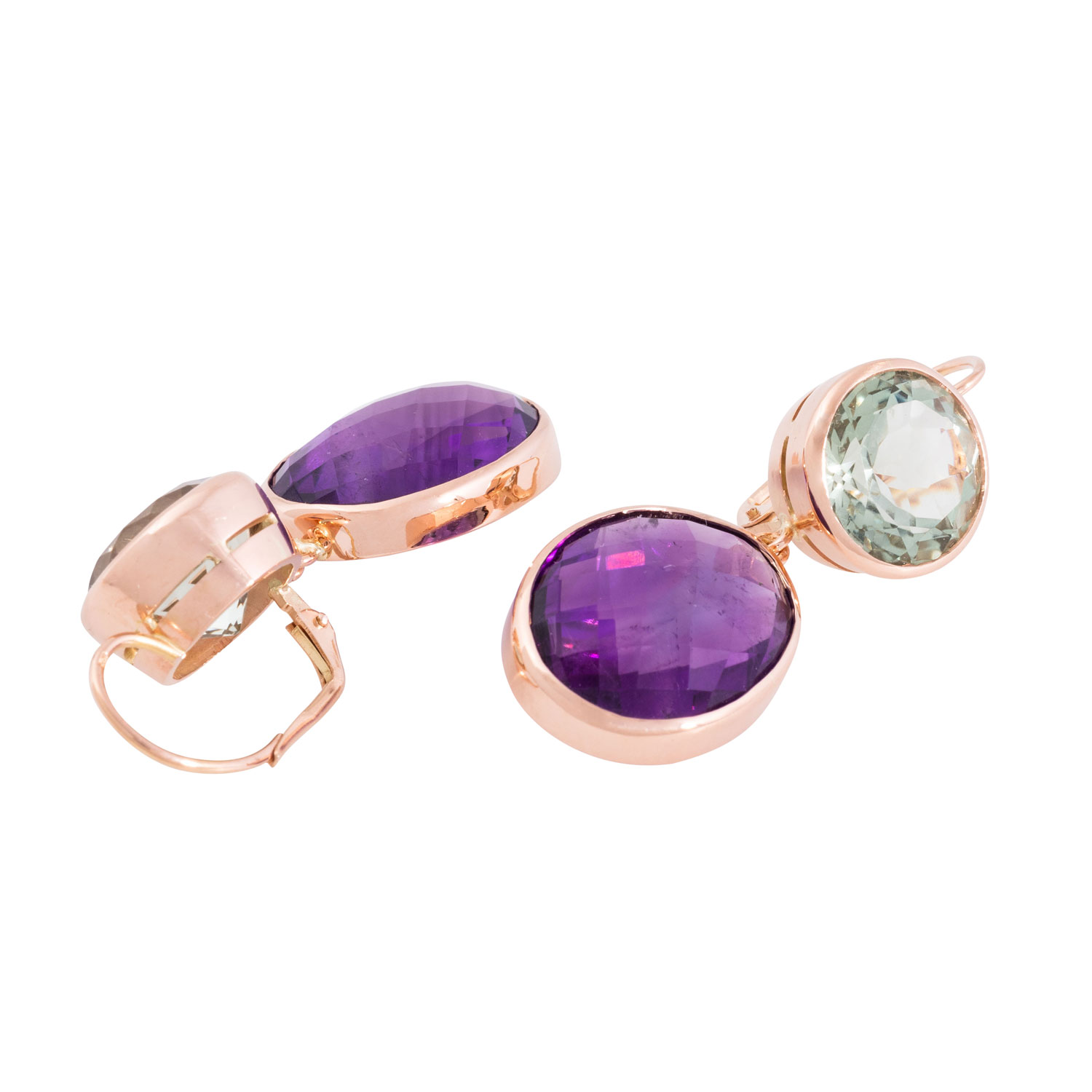 Pair earrings set with round-cut prasiolites, d.: approx. 12 mm an 2 oval-cut amethysts approx. 20 x 15 mm, 14K rsg, 16.0 g, 21st century, mint condition.