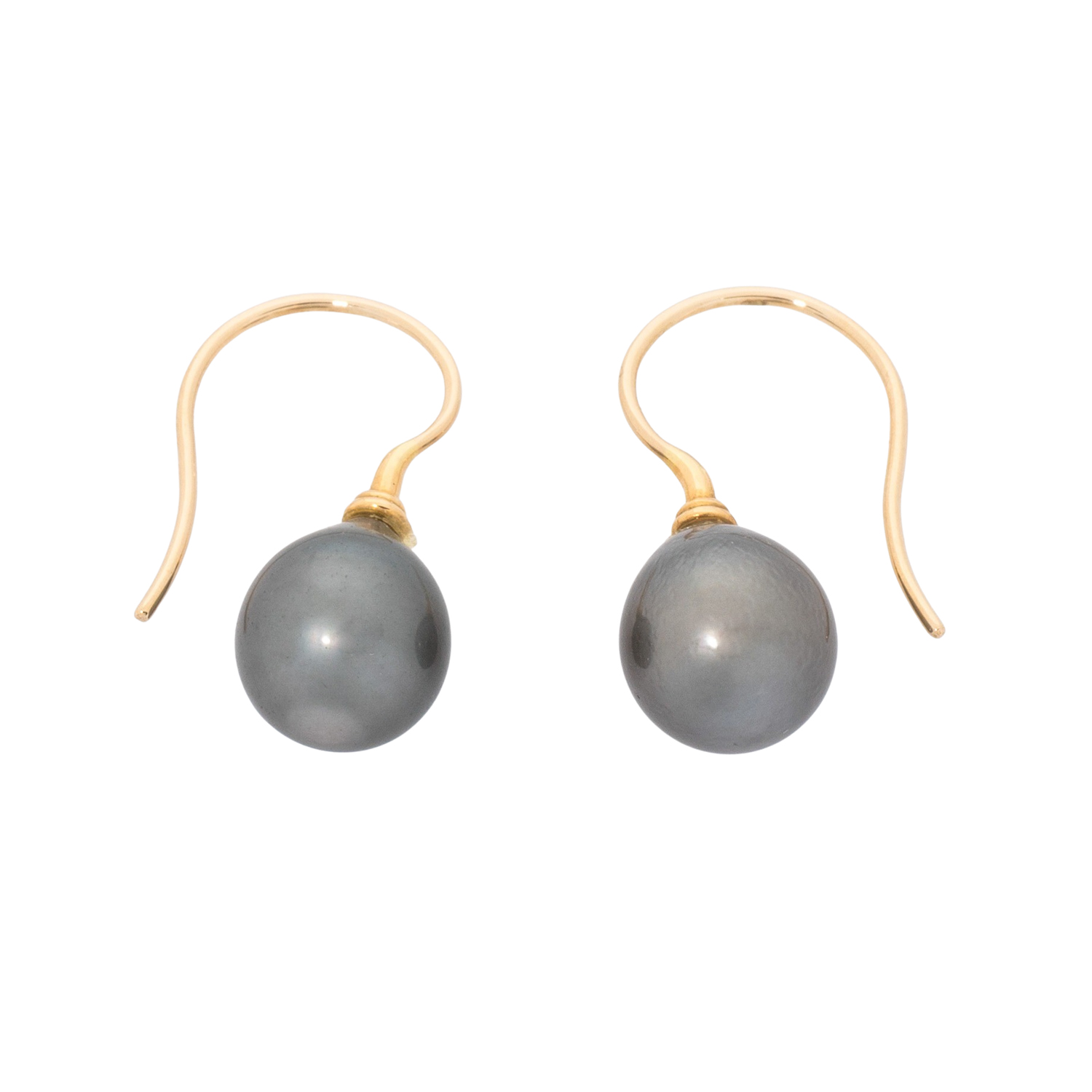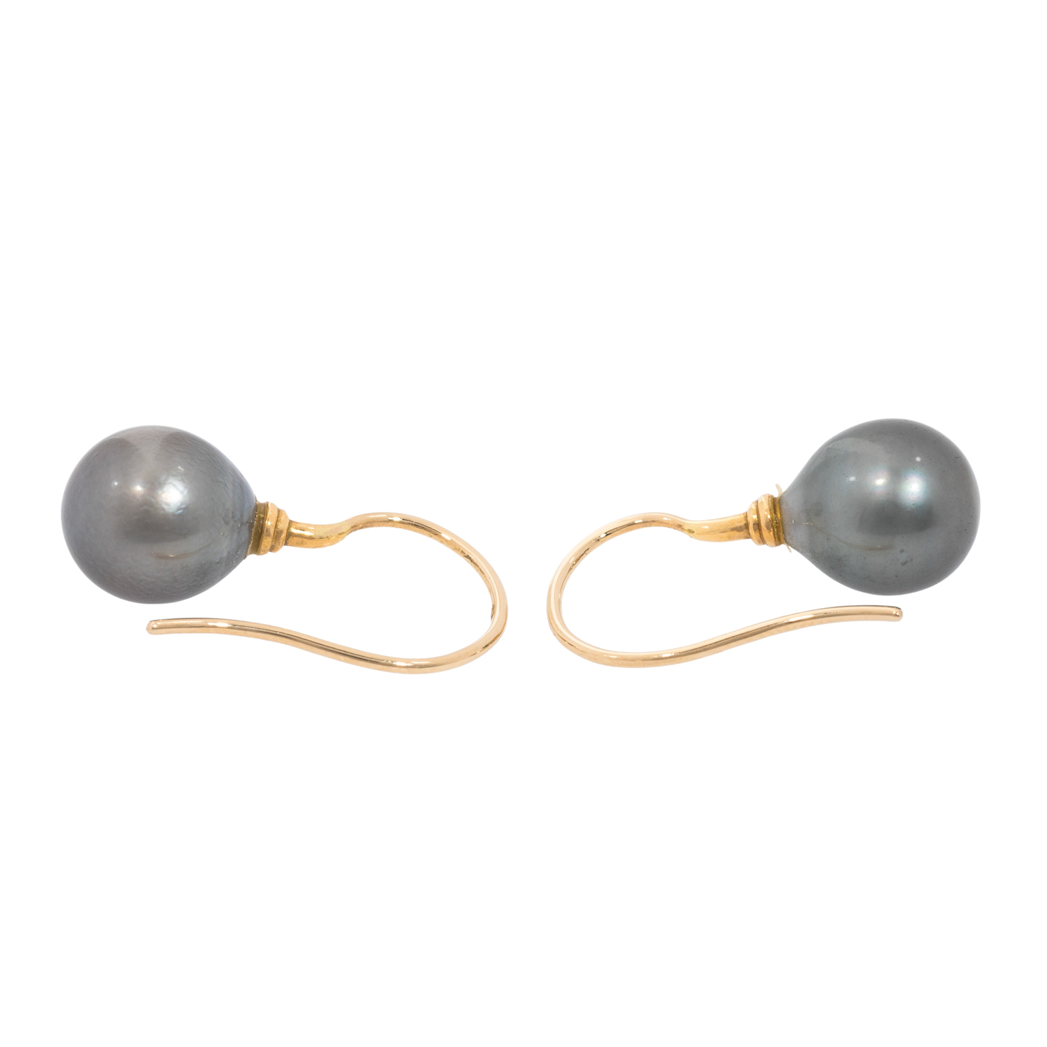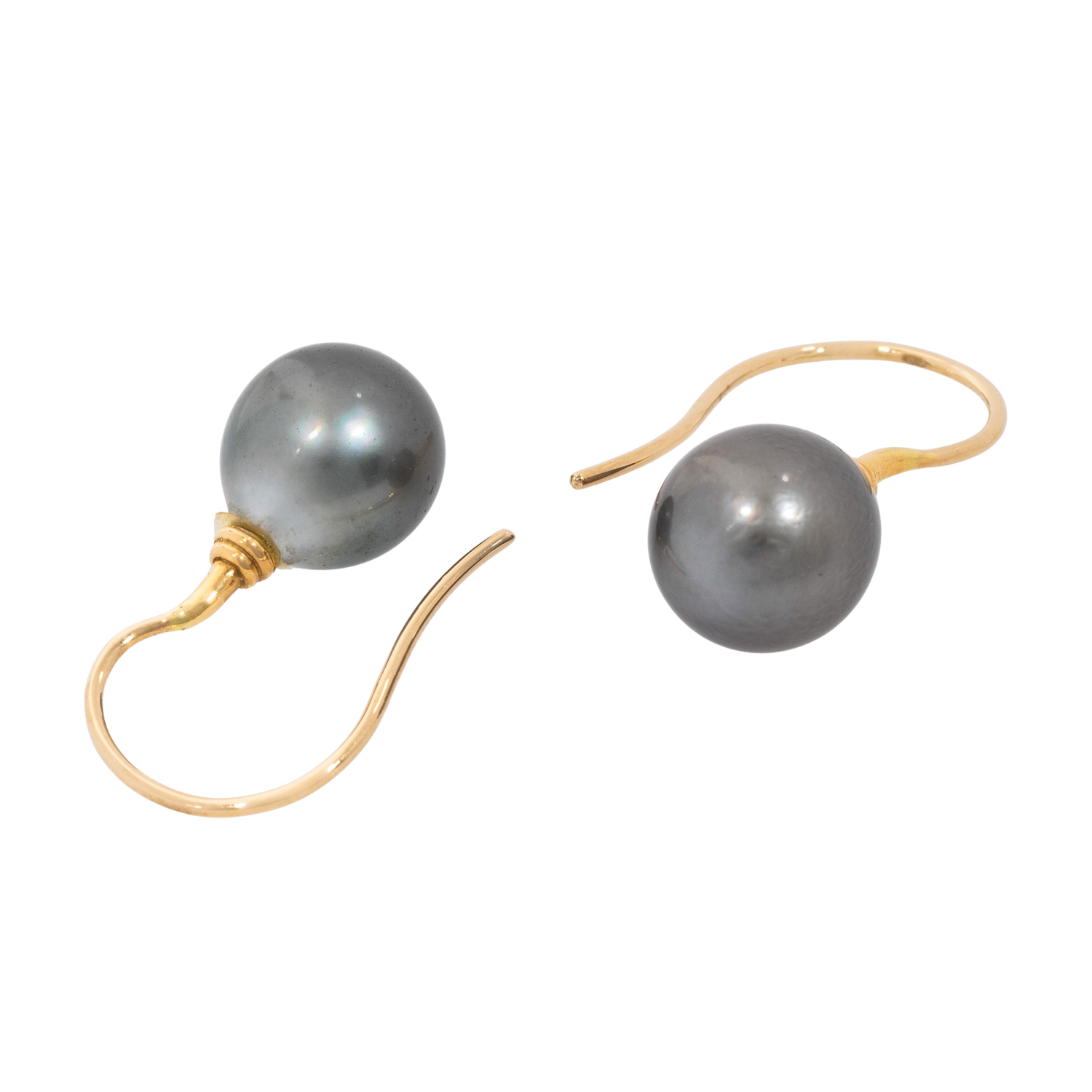 Pair of earrings with Tahitian cultured pearls ca. 10,5x9,5 mm, 18K YG, 4,1g. Length ca. 2,4 cm, 20th/21st century, minor signs of wear.
