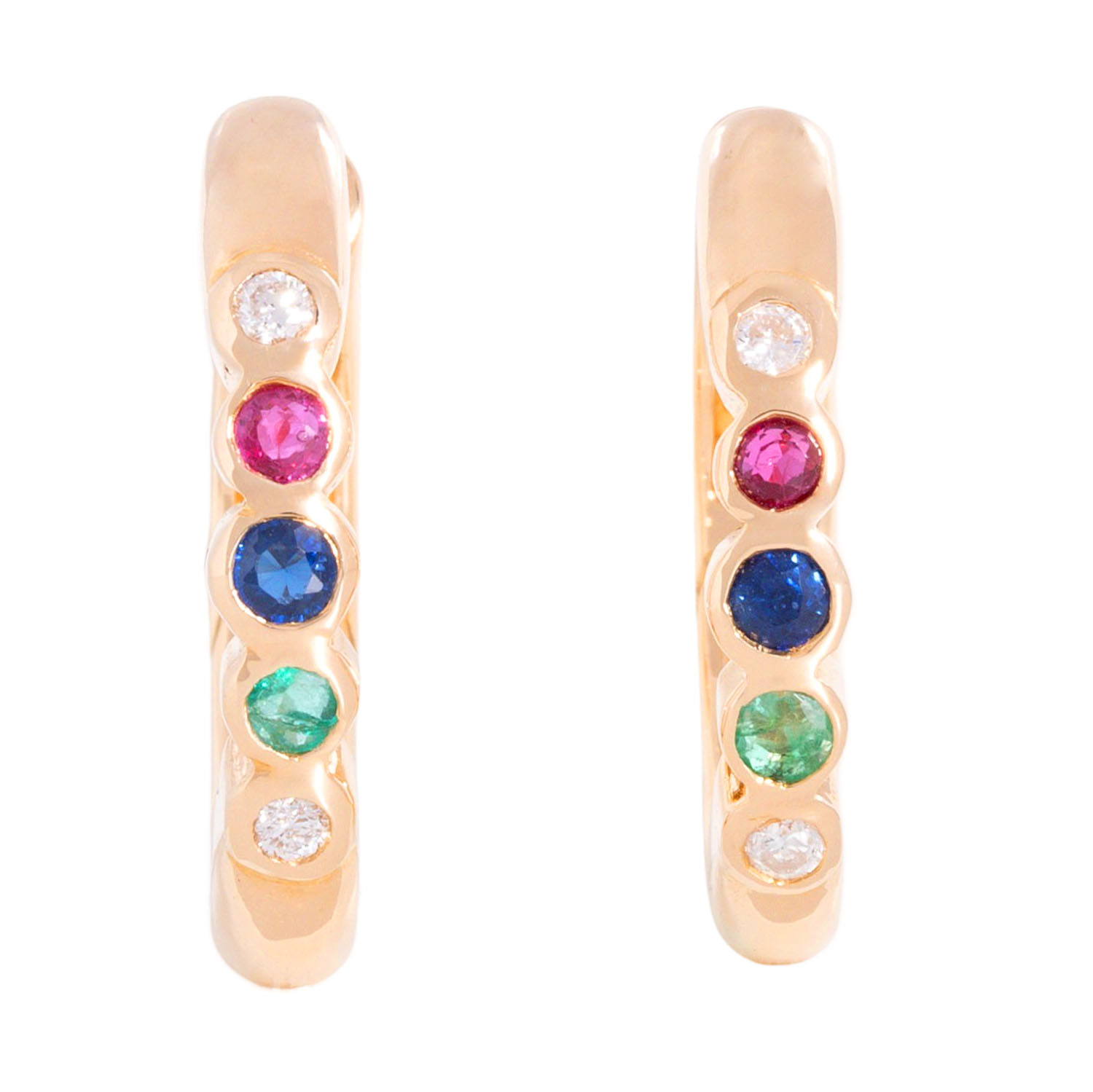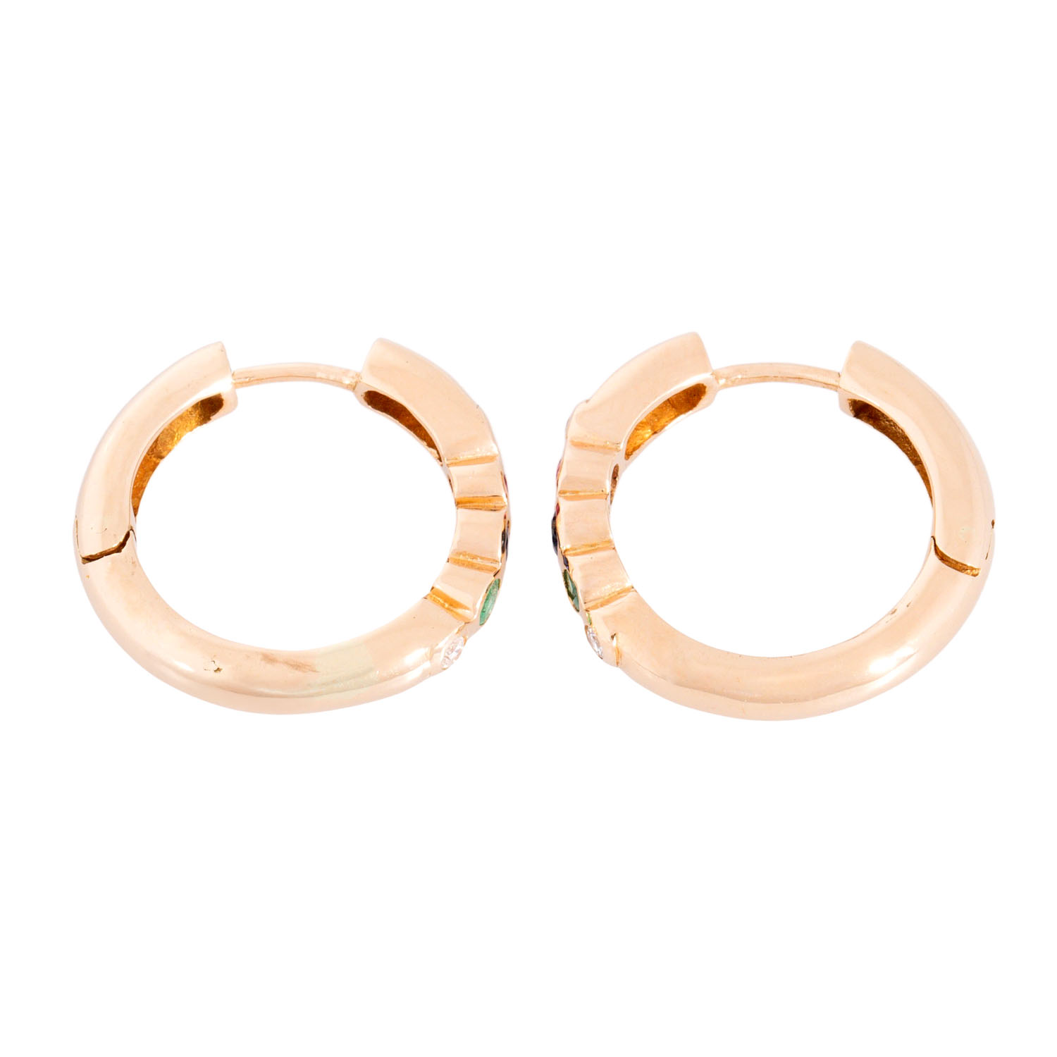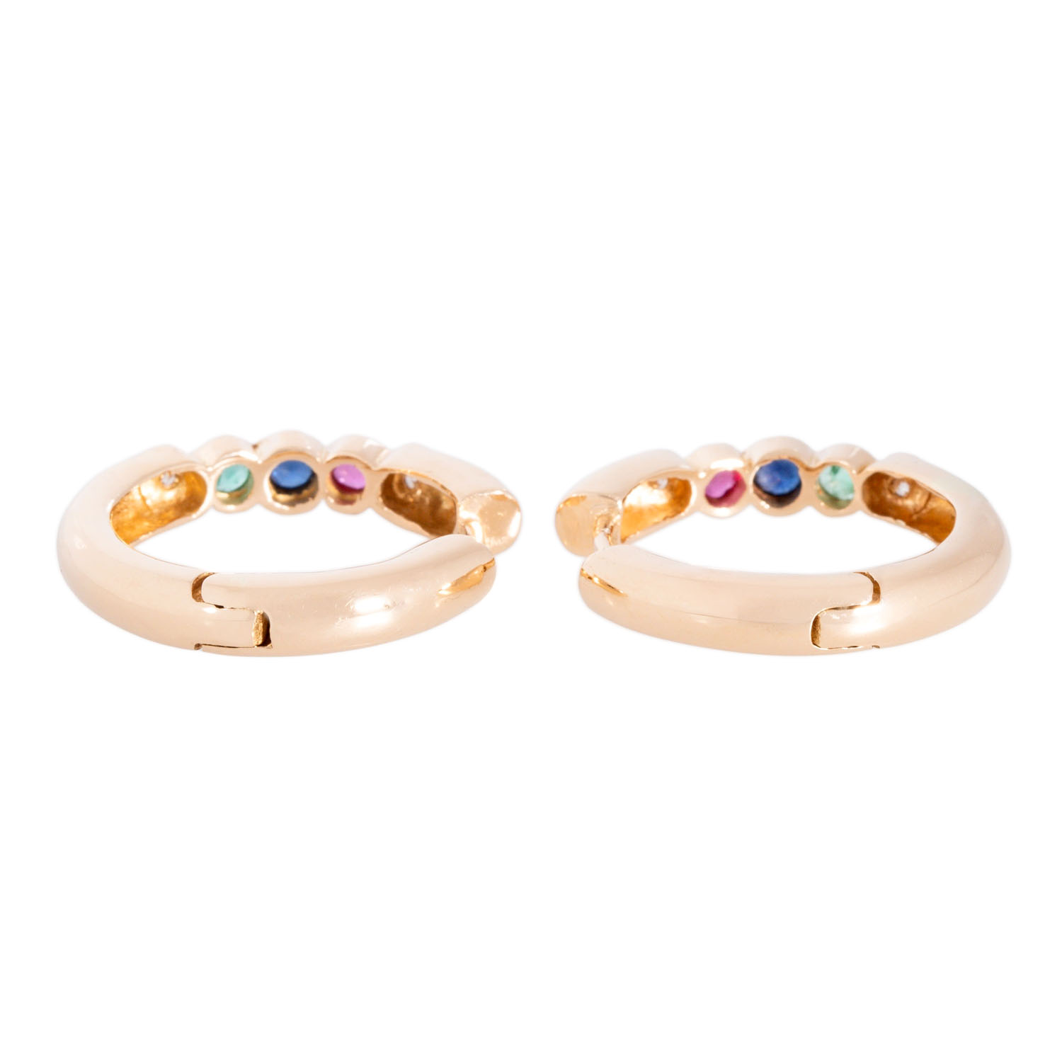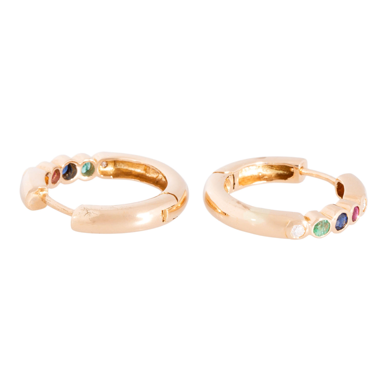 Pair of folding hoop earrings with 4 brilliant cut diamonds, totalling ap. 0.16 ct, 2 sapphires, 2 rubies, 2 emeralds, D: ap. 2 mm, 14K yellow gold, 6.8 g, L x W: 22 x 14 mm, 1 emerald chipped, late 20th century, minor signs of wear.