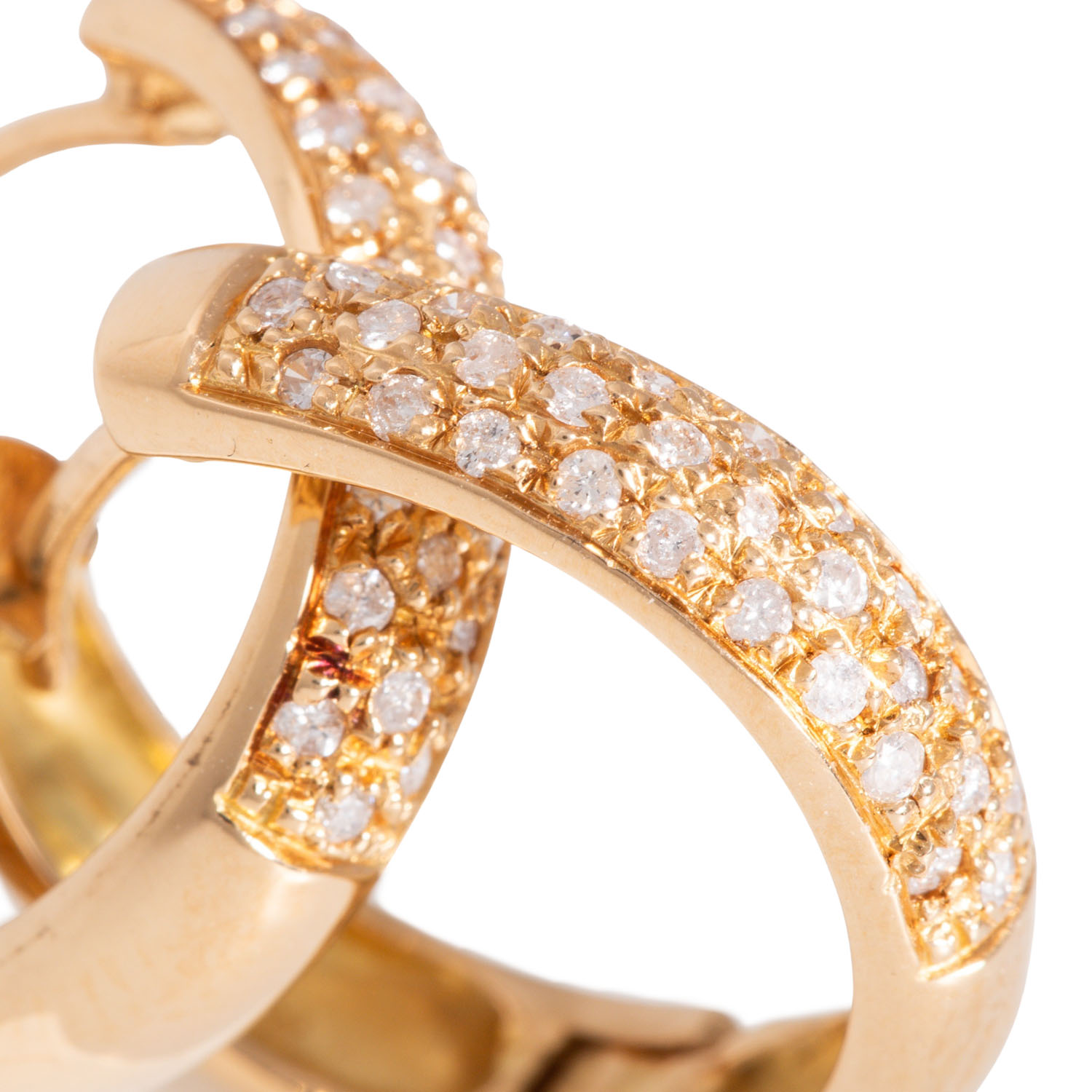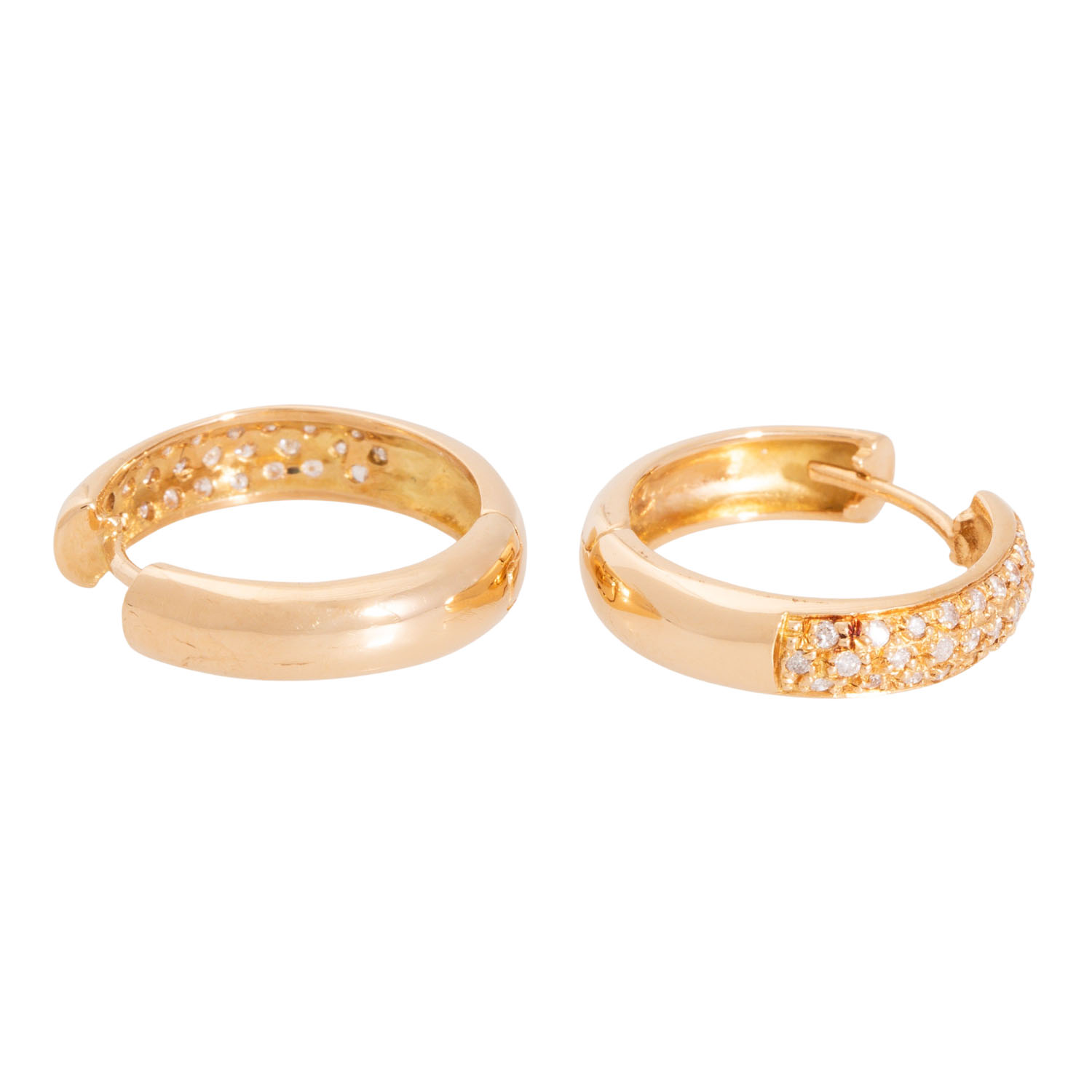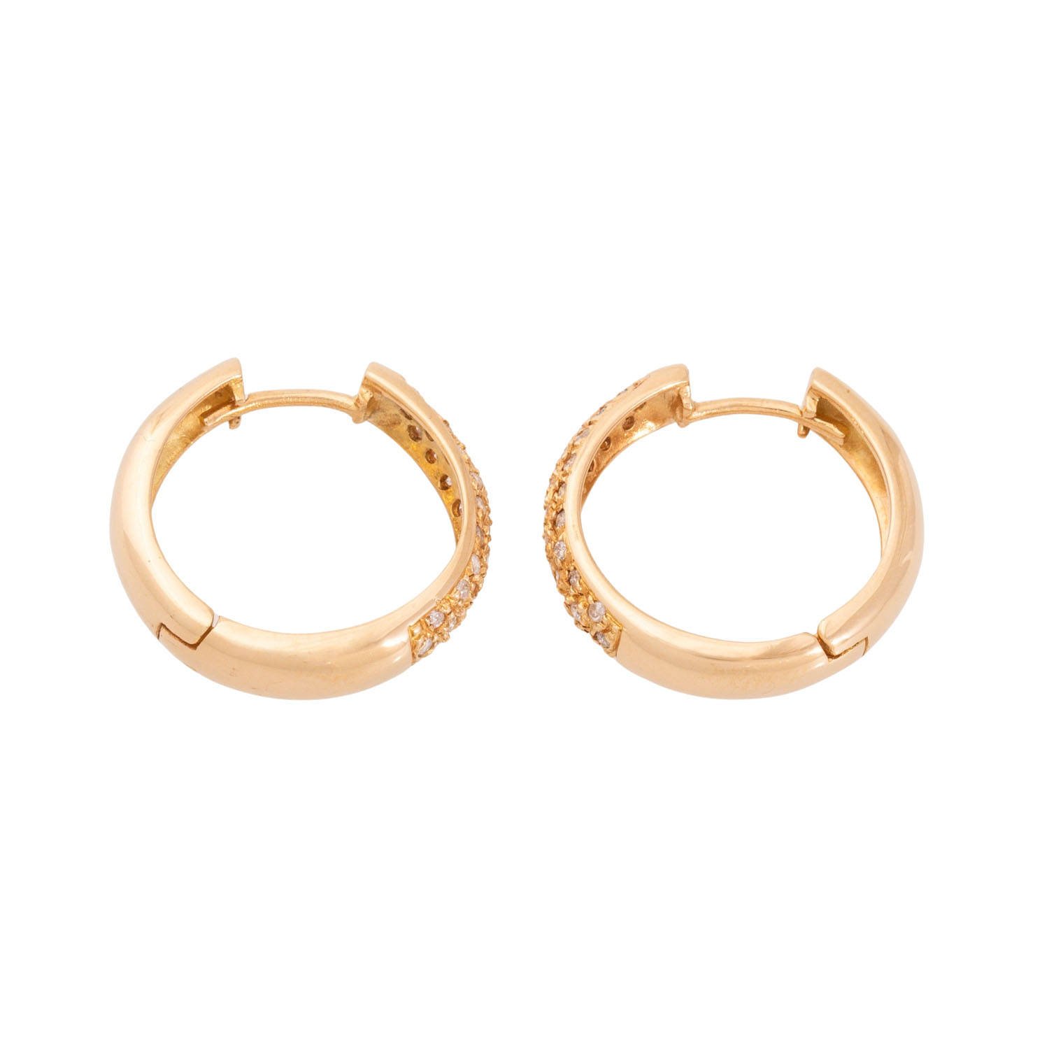 Pair of folding hoop earrings with 56 brilliant cut diamonds, totalling ap. 0.5 ct, medium colour, low clarity, 18K yellow gold, 7.1 g, L x W: ap. 20 x 5 mm, some stones with naturals at the surface, late 20th century, minor signs of wear.