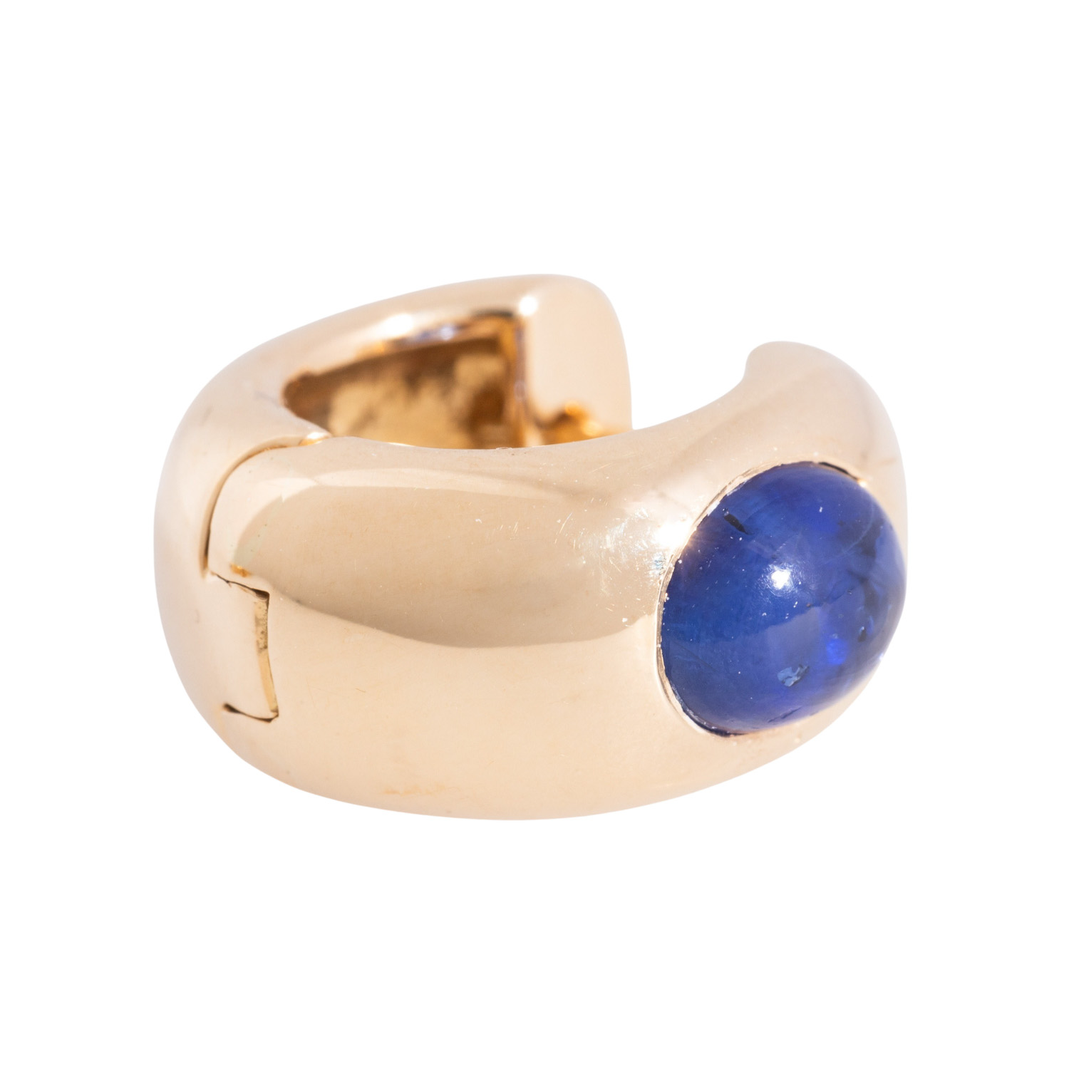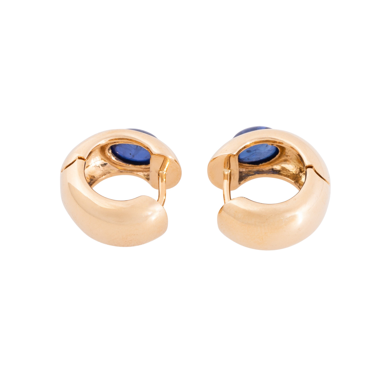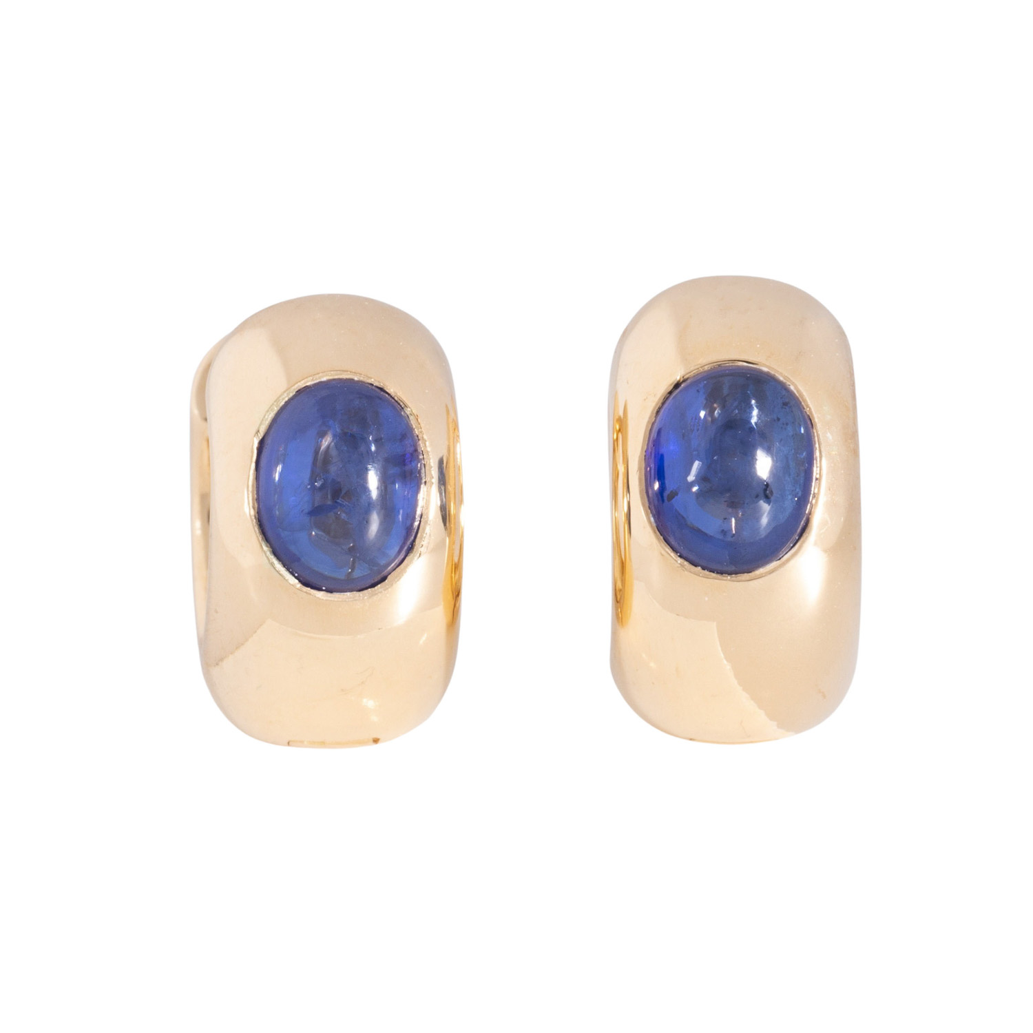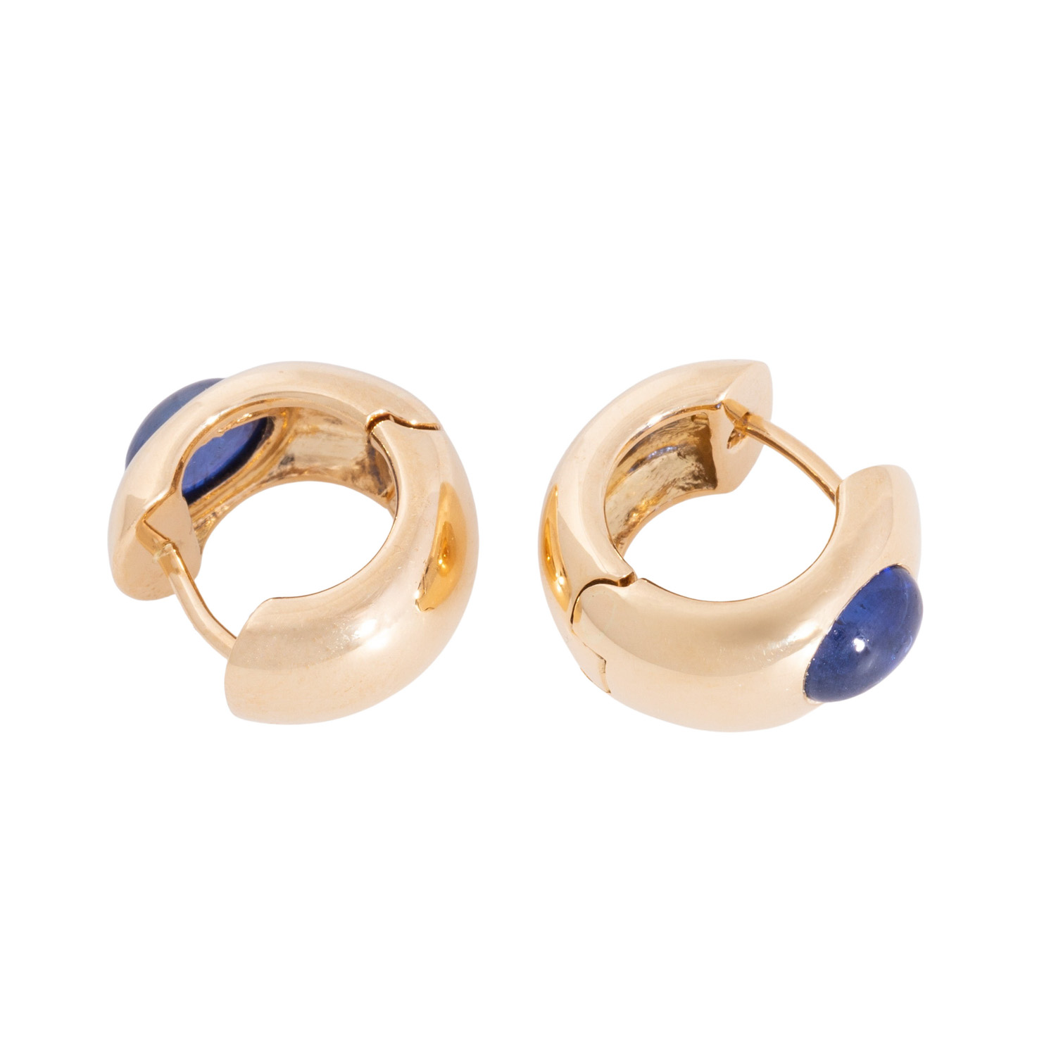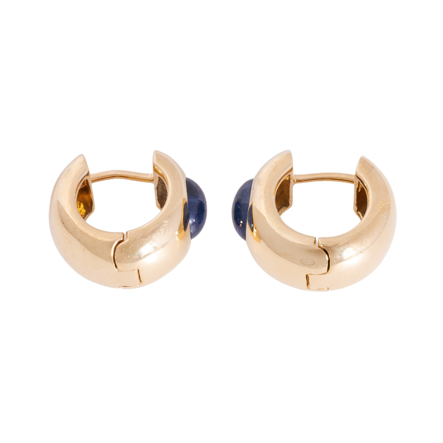 Pair of hoop earrings with 2 sapphire cabochons, oval-cut ca. 6,3 x 5,1 mm, yellow gold 18K, 10 g, D: 9,3 mm, W: ca. 7,8 mm, late 20th century, minimal signs of wear, with hallmark.