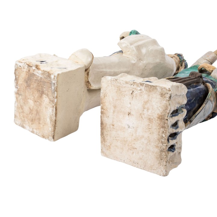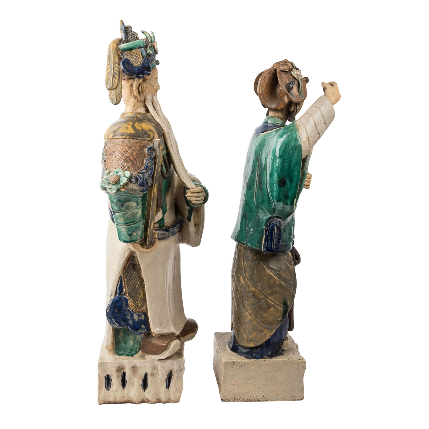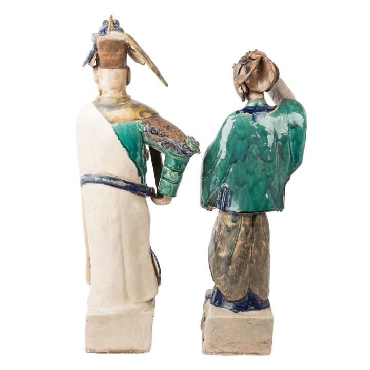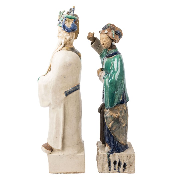 2.) Lu, the god of fortune, H: 83 cm. Each is made of light beige shards, partly colored glazed, with a particularly beautiful lagoon green and cobalt blue flowing glaze. Signs of age and various damages, especially to the male figure Lu. The figure Lan Caihe originally held something in her hands, presumably one of her attributes, which is missing.