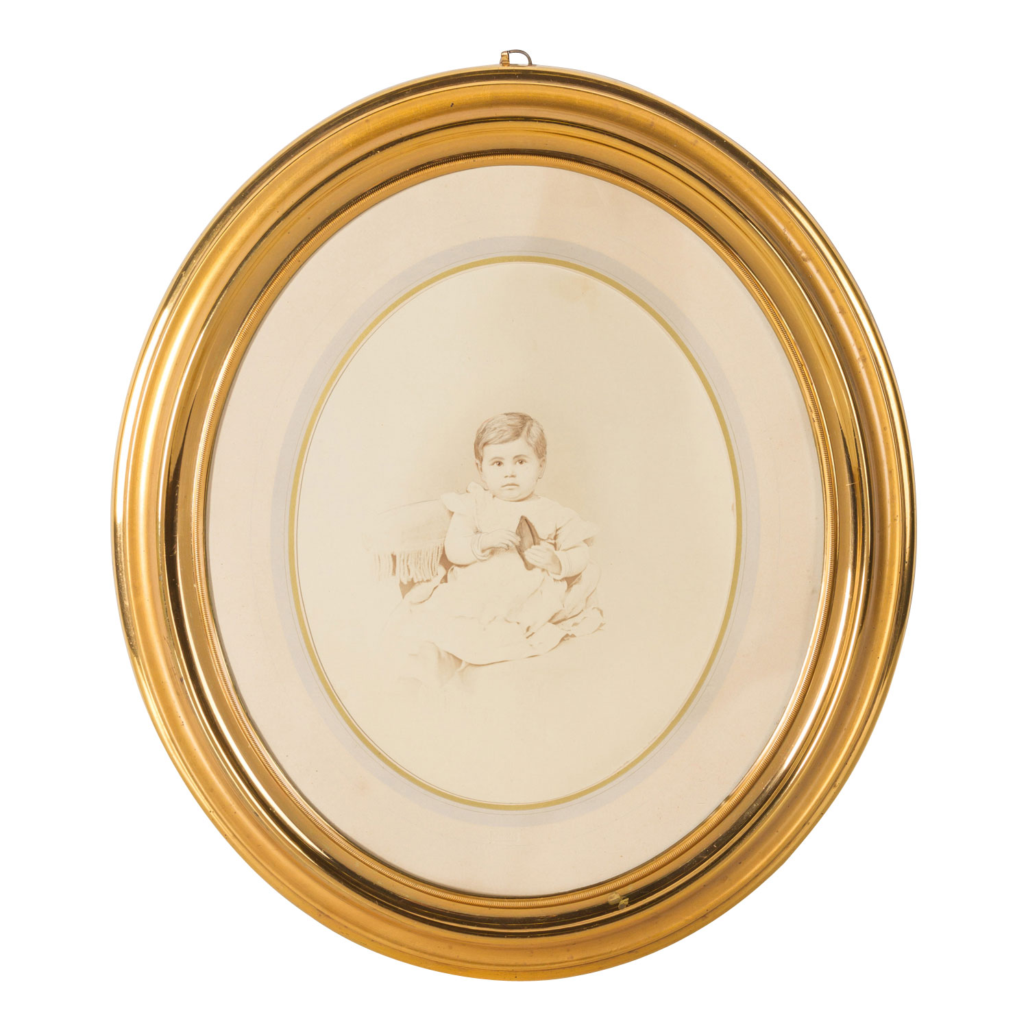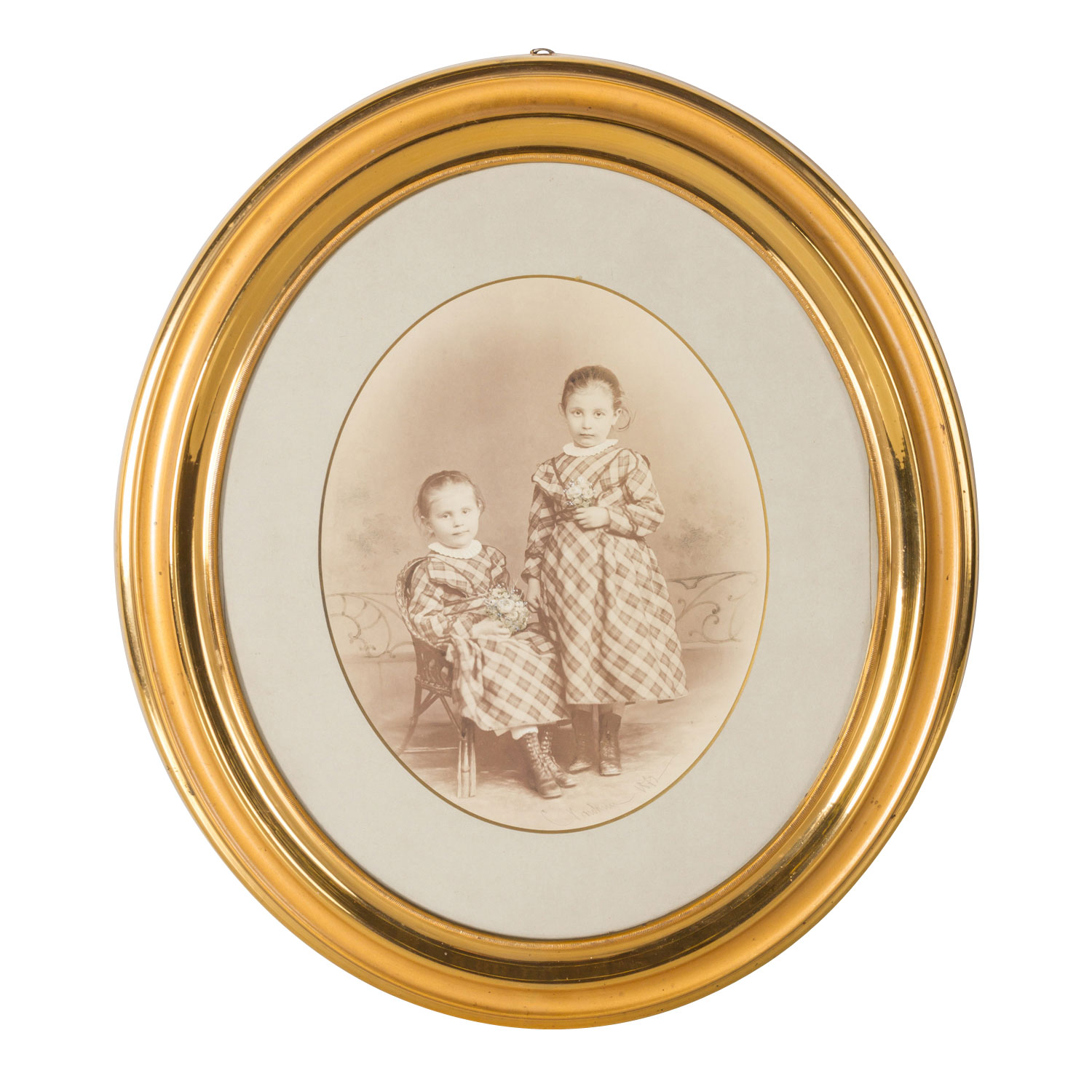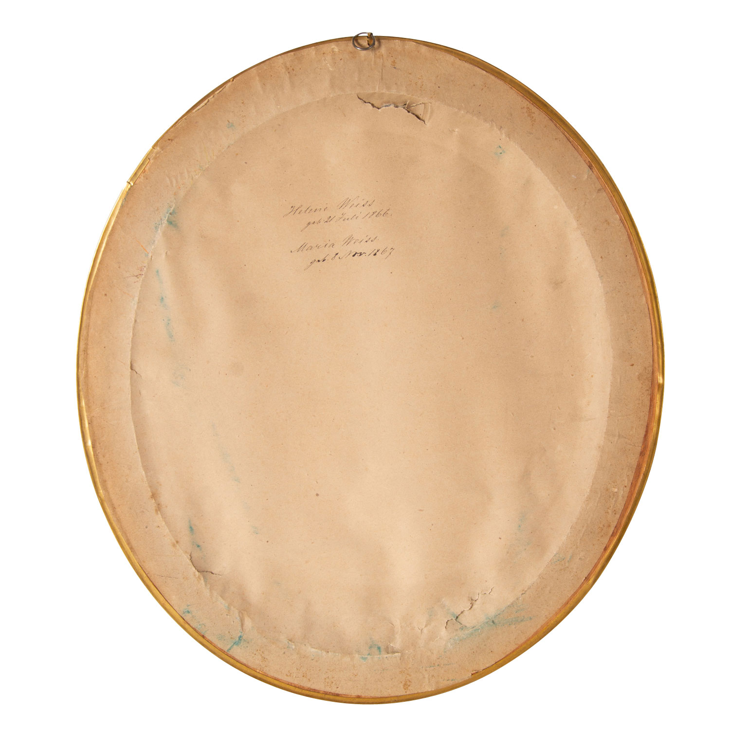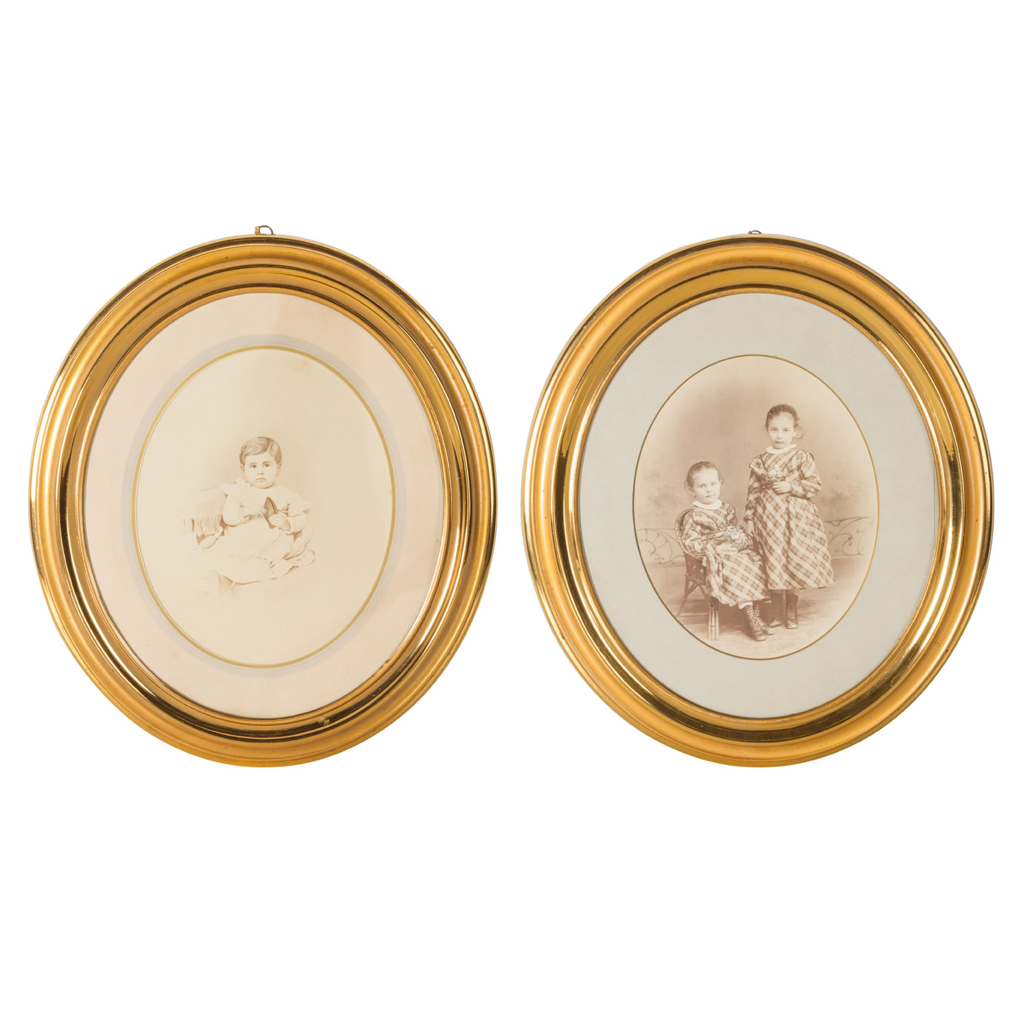 A PAIR OF OVAL BRASS FRAMES with photographs, German c. 1870, polished and matted sheet brass, on wood, each with a photograph of a child, 1x signed 'C. Buchner 1872', names of the sitters on the reverse: Helene, Maria and Anna Weiß, HxW: light dimensions approx. 34x28 cm each, outer dimensions approx. 43x38 cm each. Slight signs of age and stains.