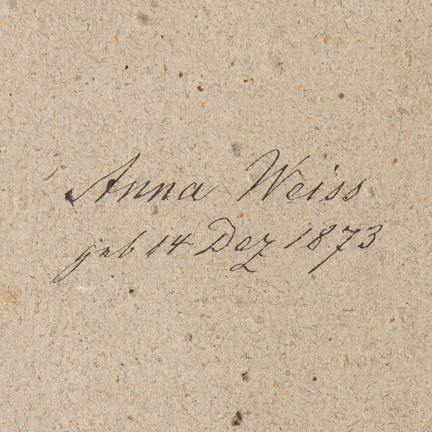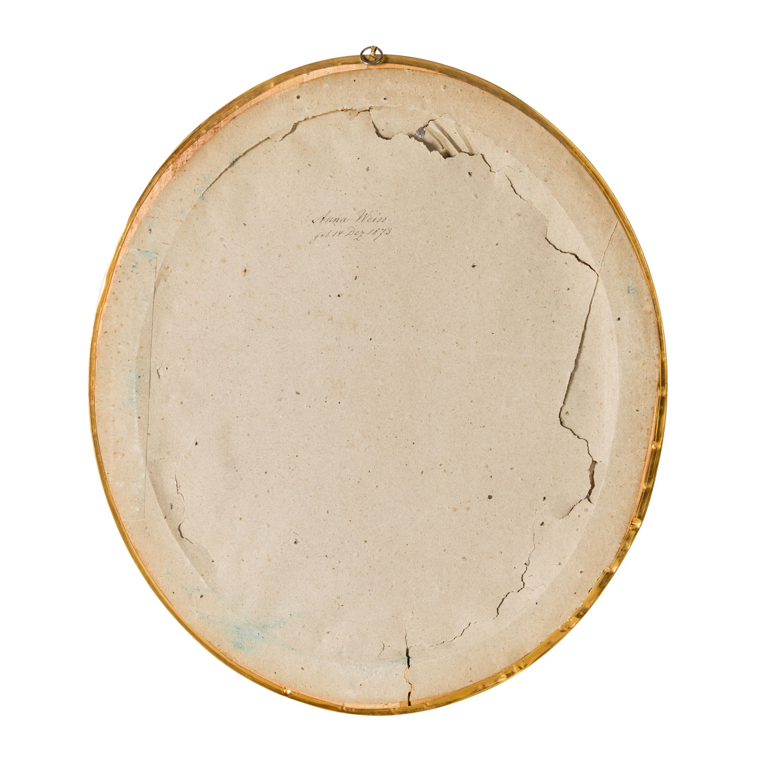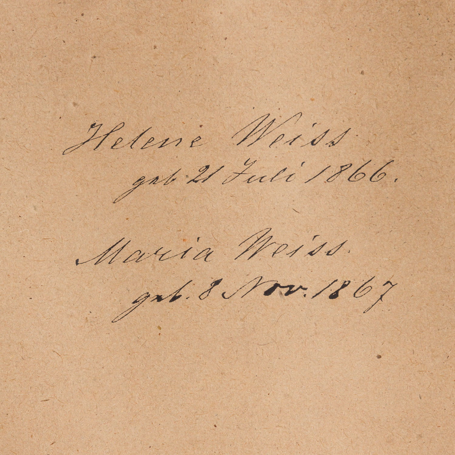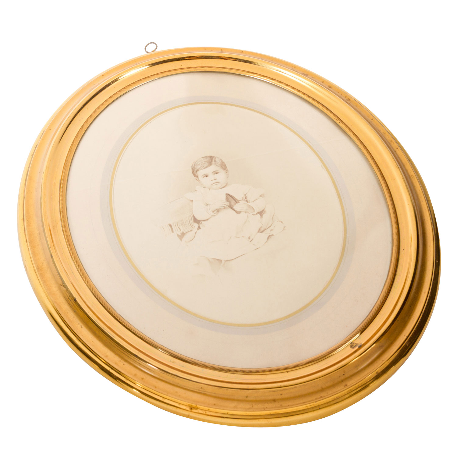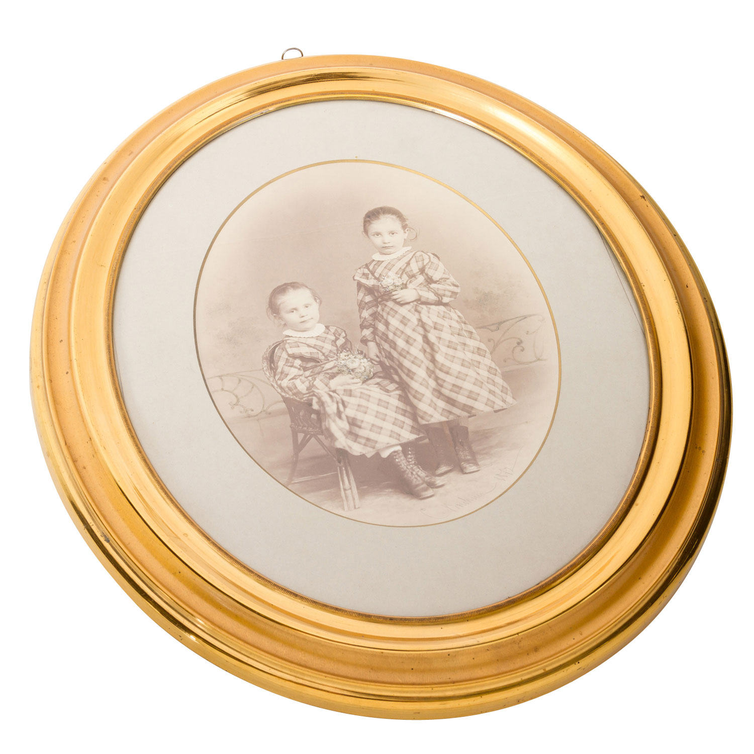 A PAIR OF OVAL BRASS FRAMES with photographs, German c. 1870, polished and matted sheet brass, on wood, each with a photograph of a child, 1x signed 'C. Buchner 1872', names of the sitters on the reverse: Helene, Maria and Anna Weiß, HxW: light dimensions approx. 34x28 cm each, outer dimensions approx. 43x38 cm each. Slight signs of age and stains.