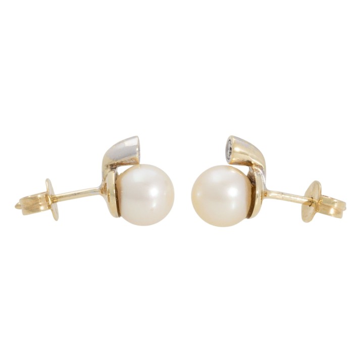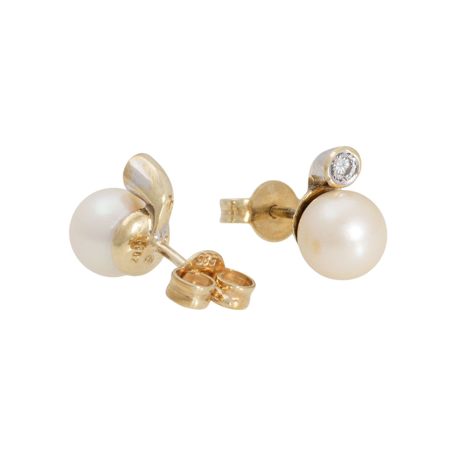 Pair of earstuds with 2 brilliant cut diamonds, totalling ap. 0.08 ct, good colour and clarity, 2 white cultured akoya pearls, D: 6.8 mm, good lustre, 14K yellow gold, 2.5 g, late 20th century, minimal signs of wear.