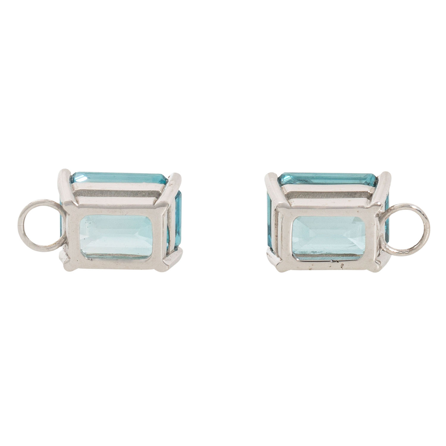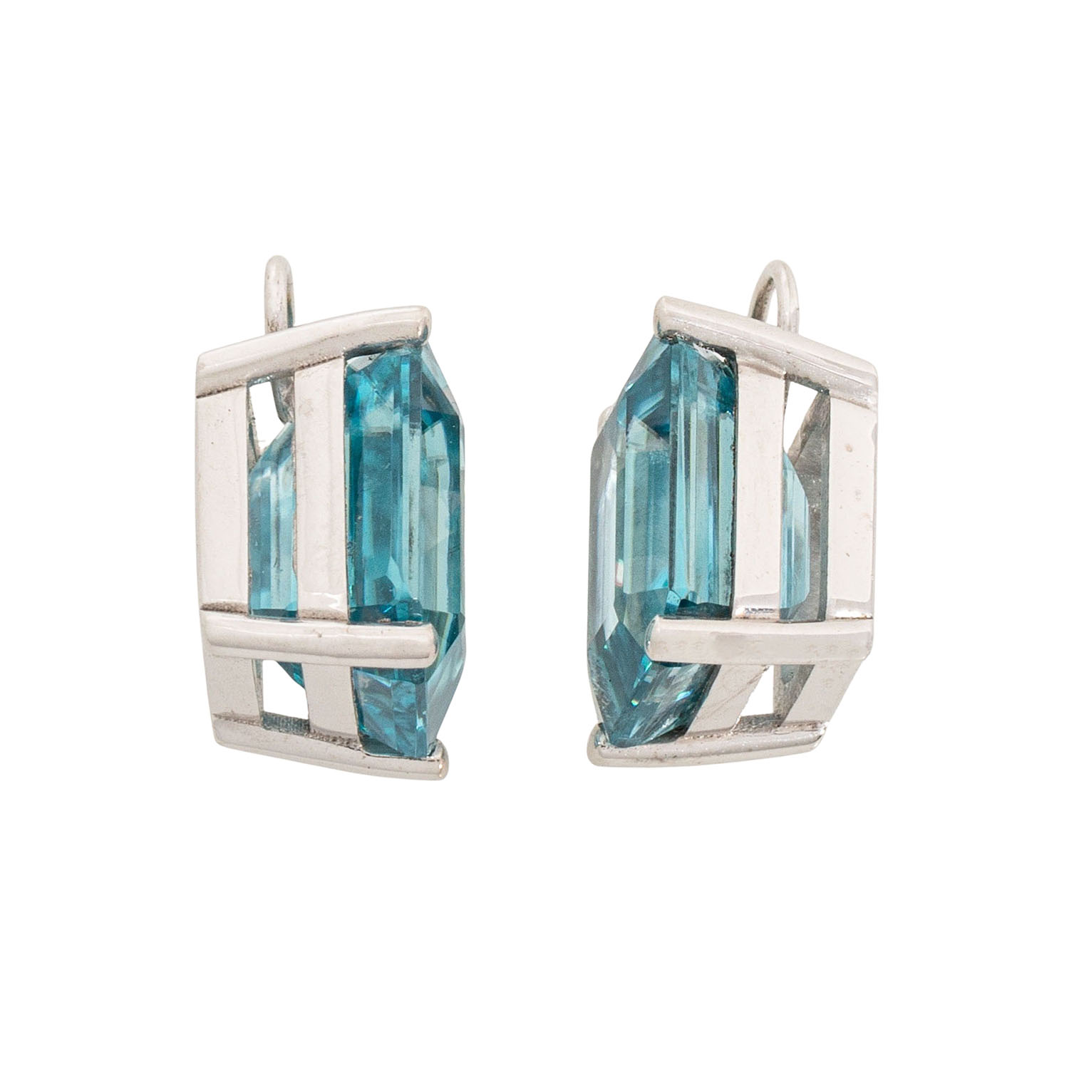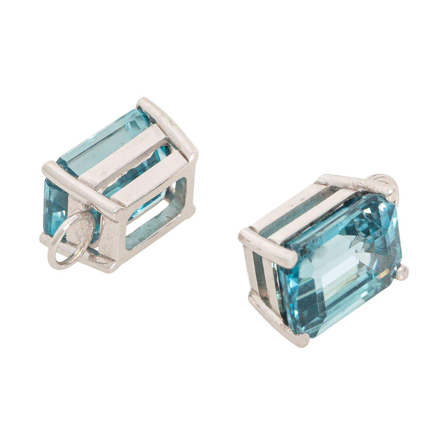 Pair of earring pendants with 2 blue natural zircons tot. ca. 7,8 ct. with vivid brillance . WG 18 K. 3,2 g. High jewelry craftsmenship.