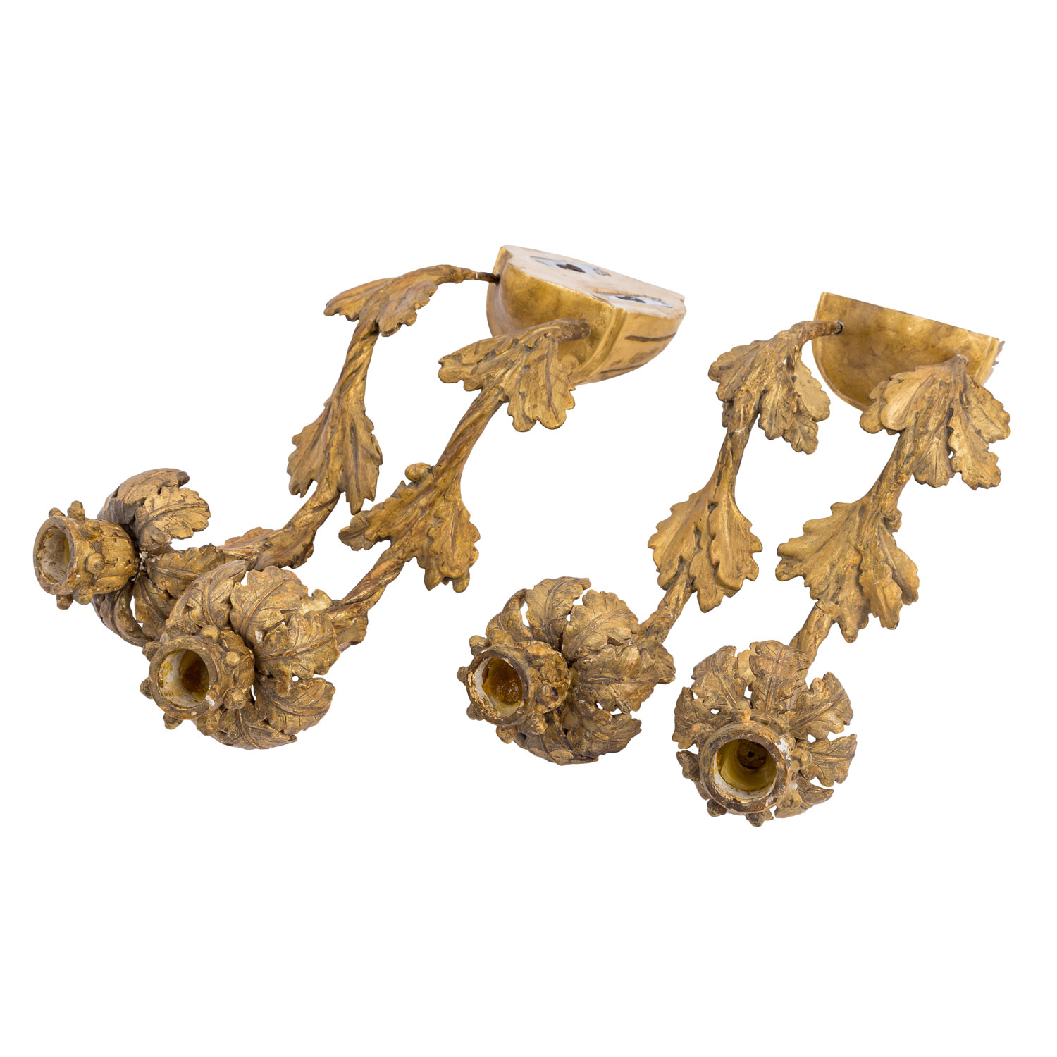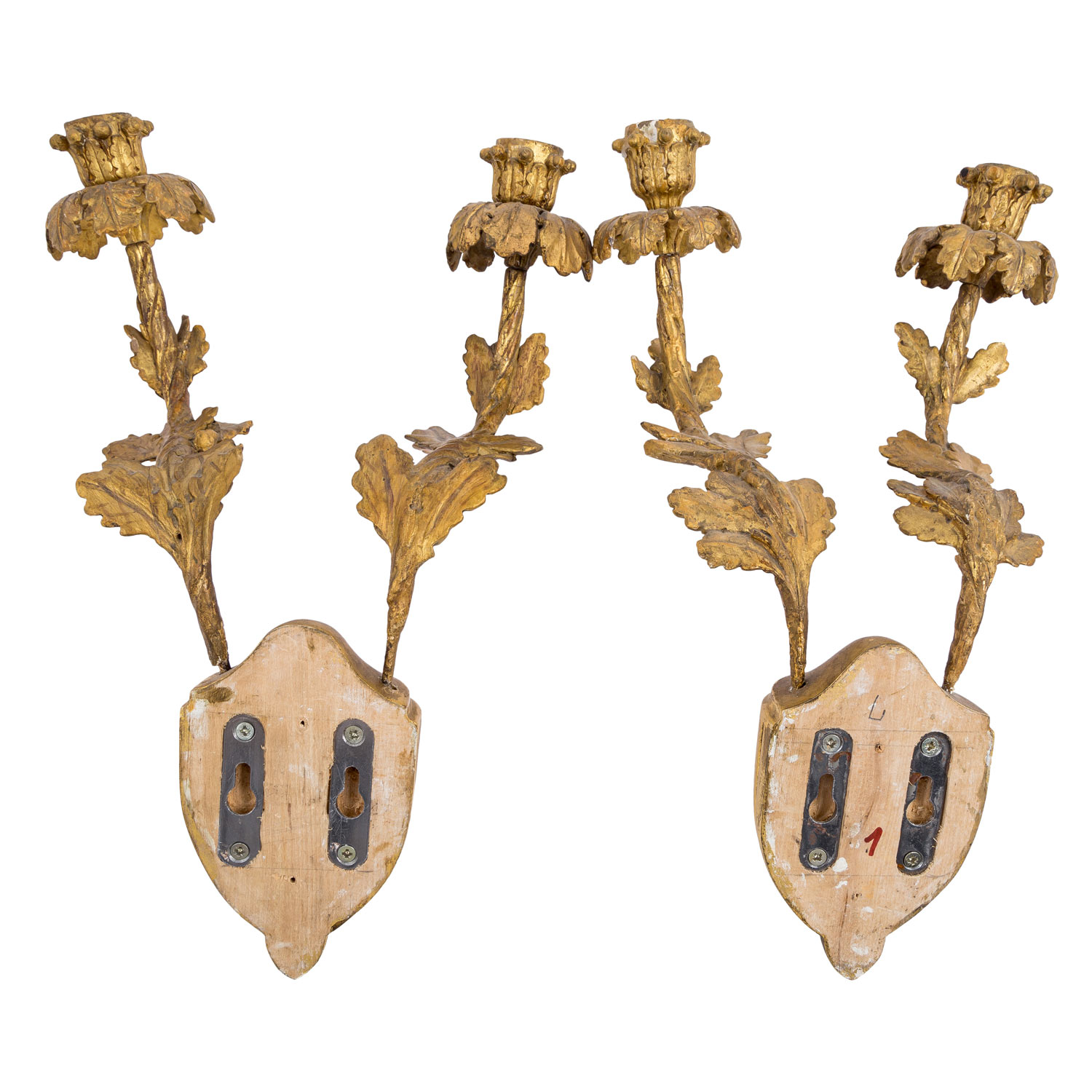 PAIR OF SCONCES IN BAROQUE STYLE, 20th century, carved and gilded wood/mass, HxW: approx. 50/45 cm. Traces of age, partially dam.