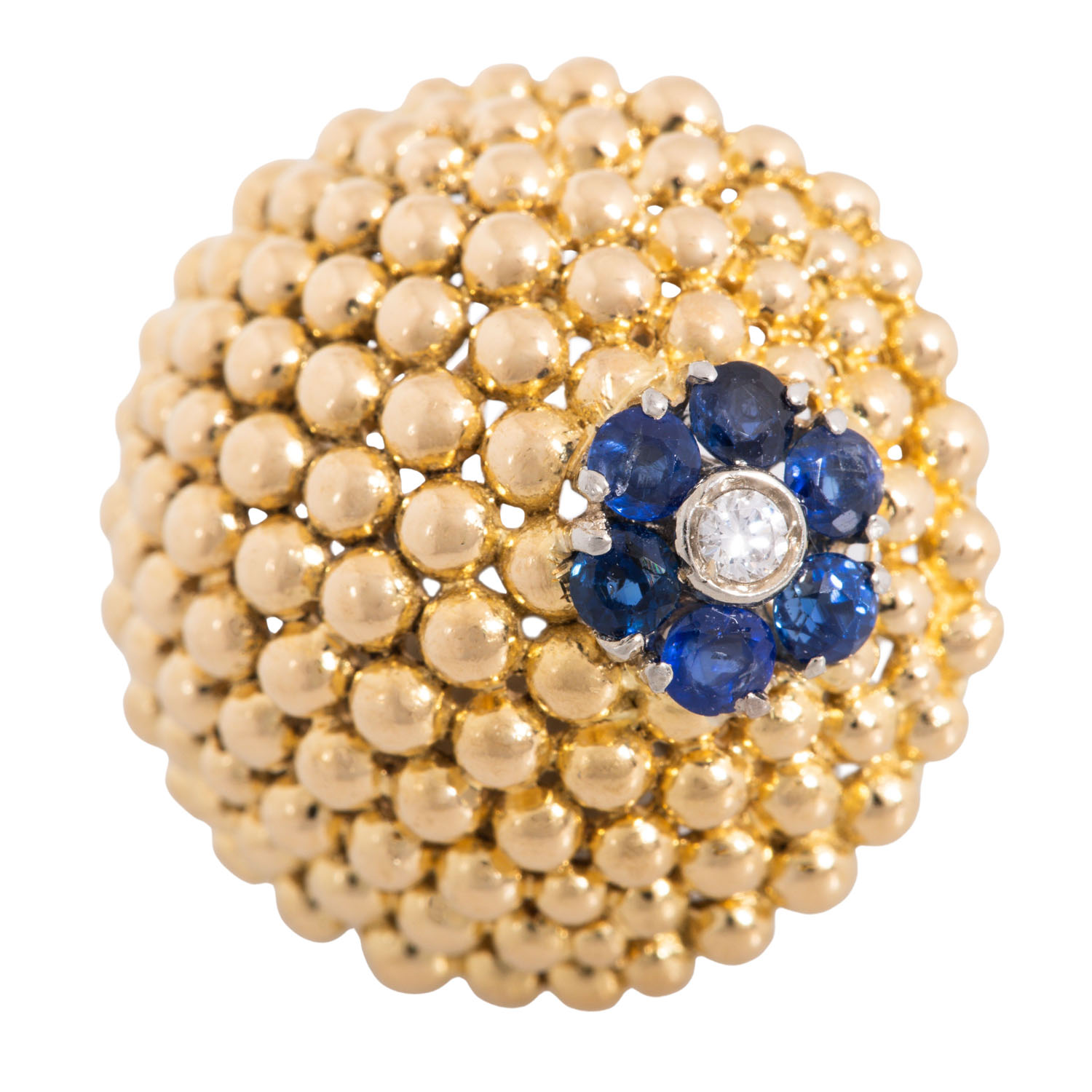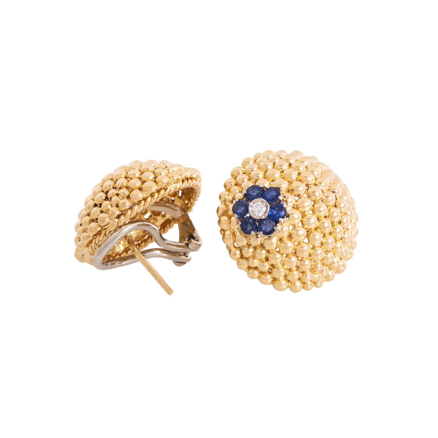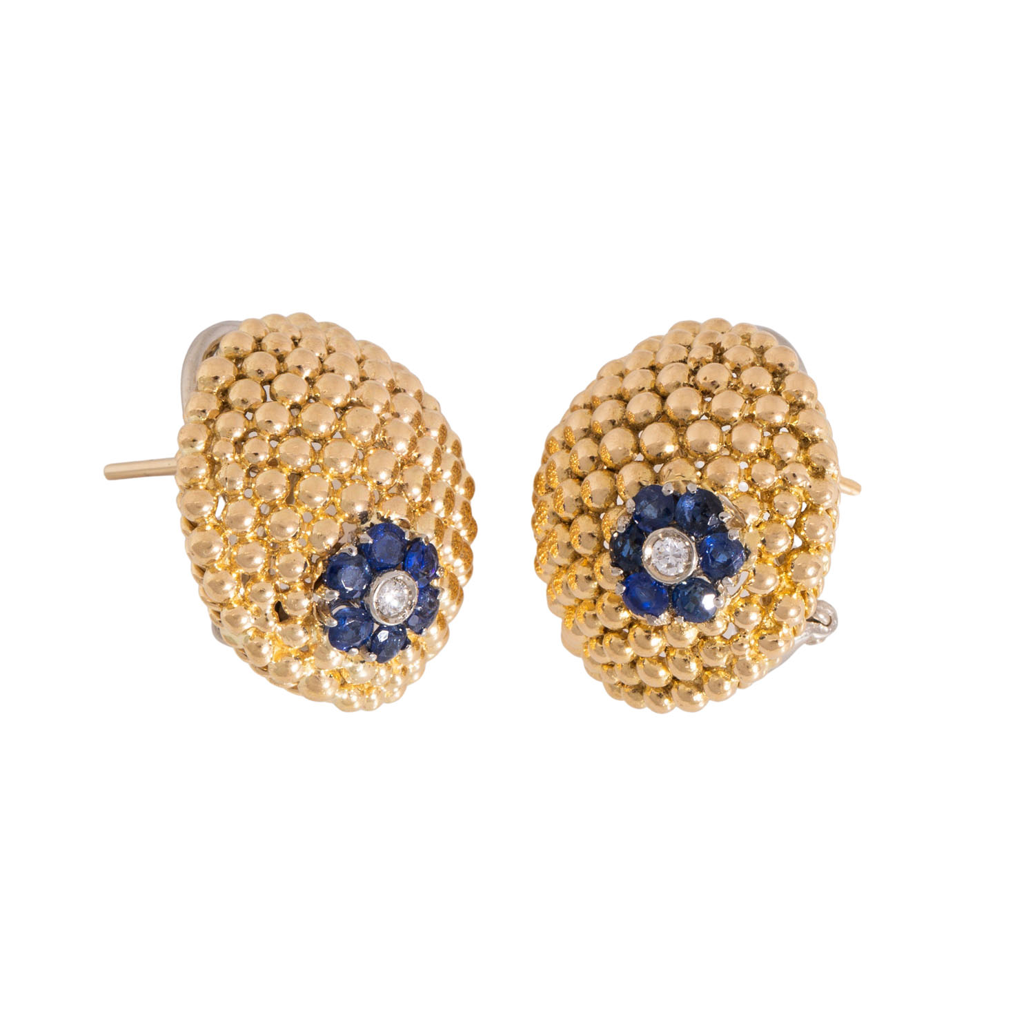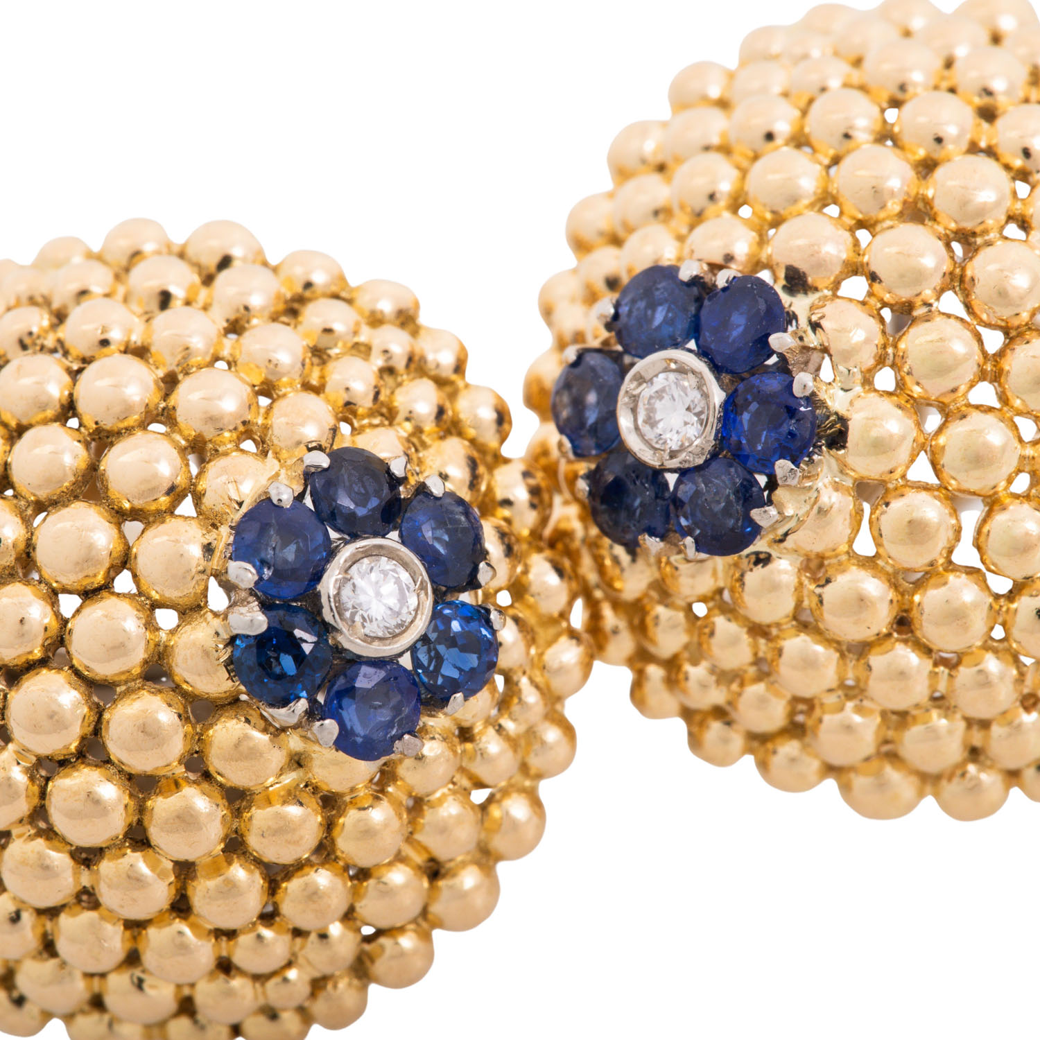 Pair earrings with 12 sapphires and 2 brilliant-cut diamonds, totalling approx. 0.07 ct, RW (F-G)/VS, round-cut sapphire, approx. 0.90 ct, treated, 2 stones chipped, 18K yellow gold/white gold, 16.7 g, D: approx. 21.4 mm, 2nd half of the 20th century, good condition, with Italian hallmarks.