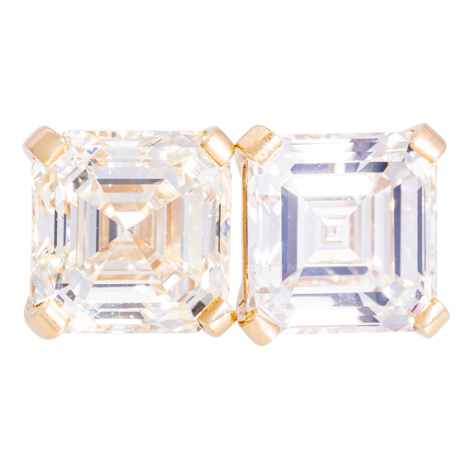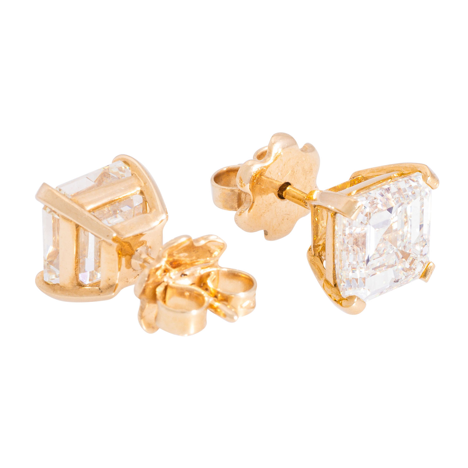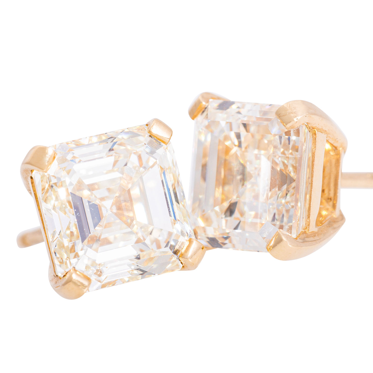 Pair of stud earrings with 2 square-cut emerald diamonds, 1 x 3.02 ct, TIN (N)/ IF and 1 x 3.08 ct, TIN (M)/VS1, YG 18K, 4.5 g, 21. GIA certificates no.: 7466865780 and 2225192450 enclosed.