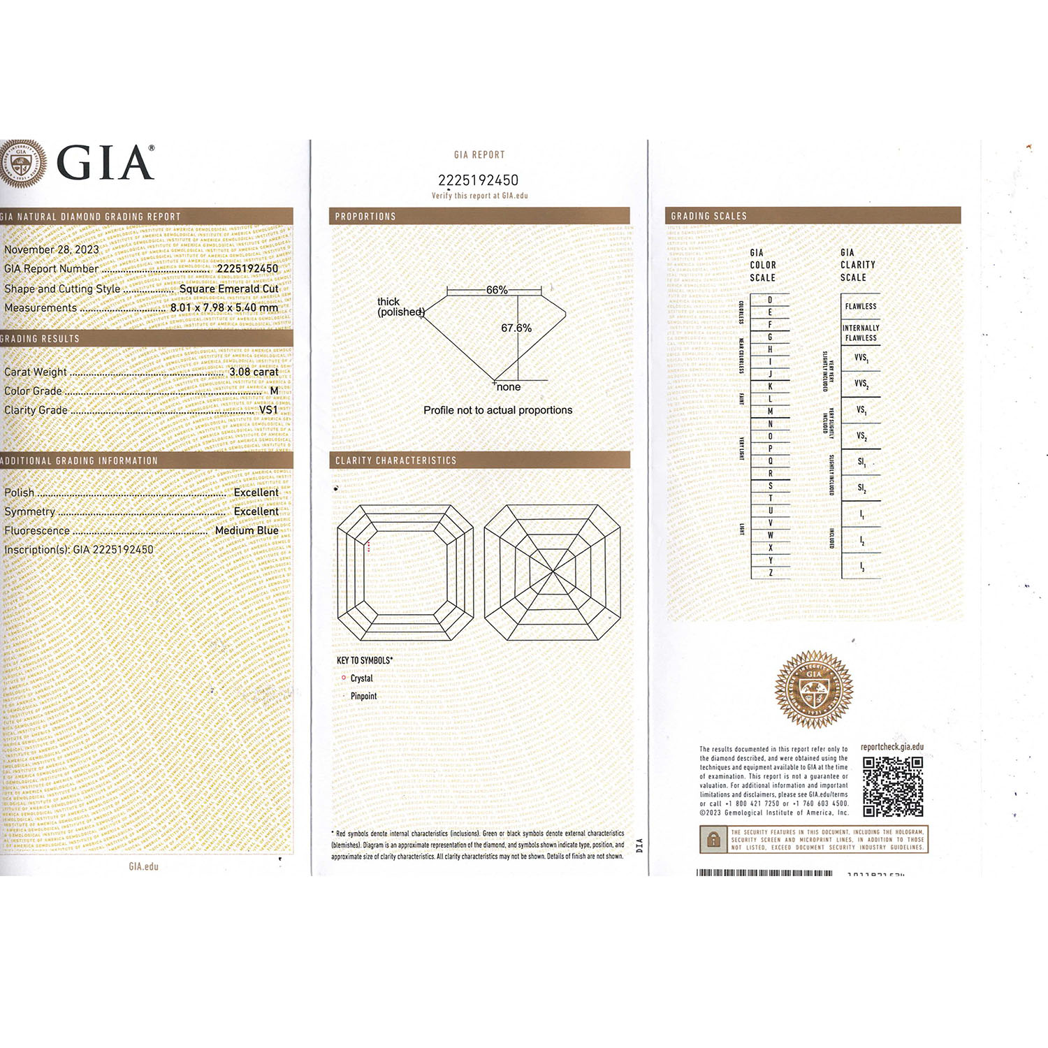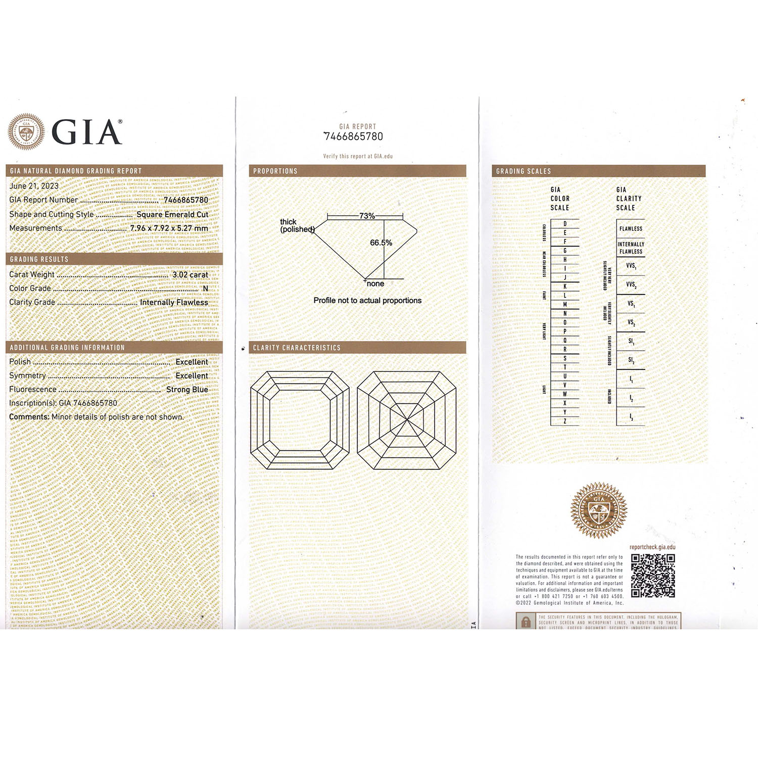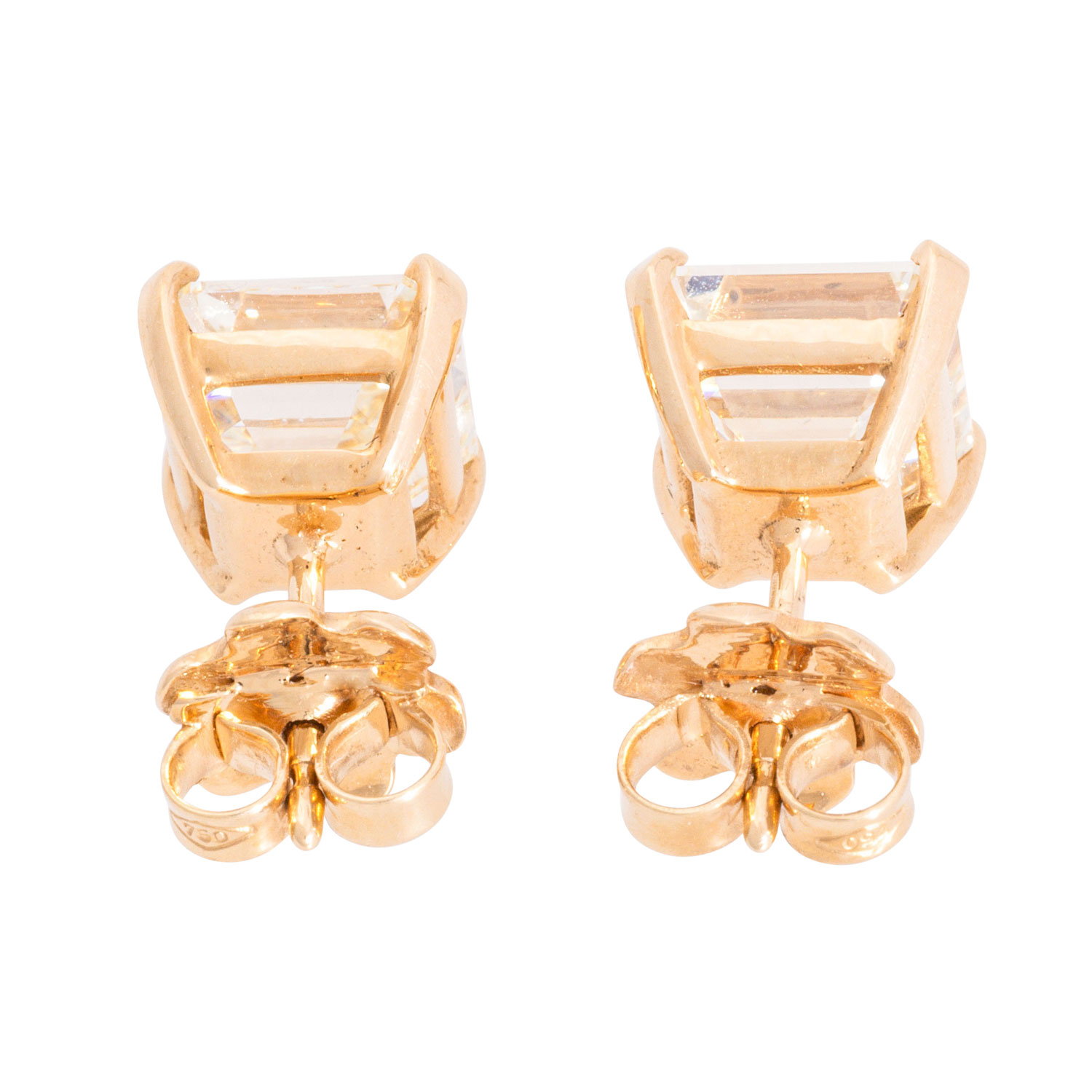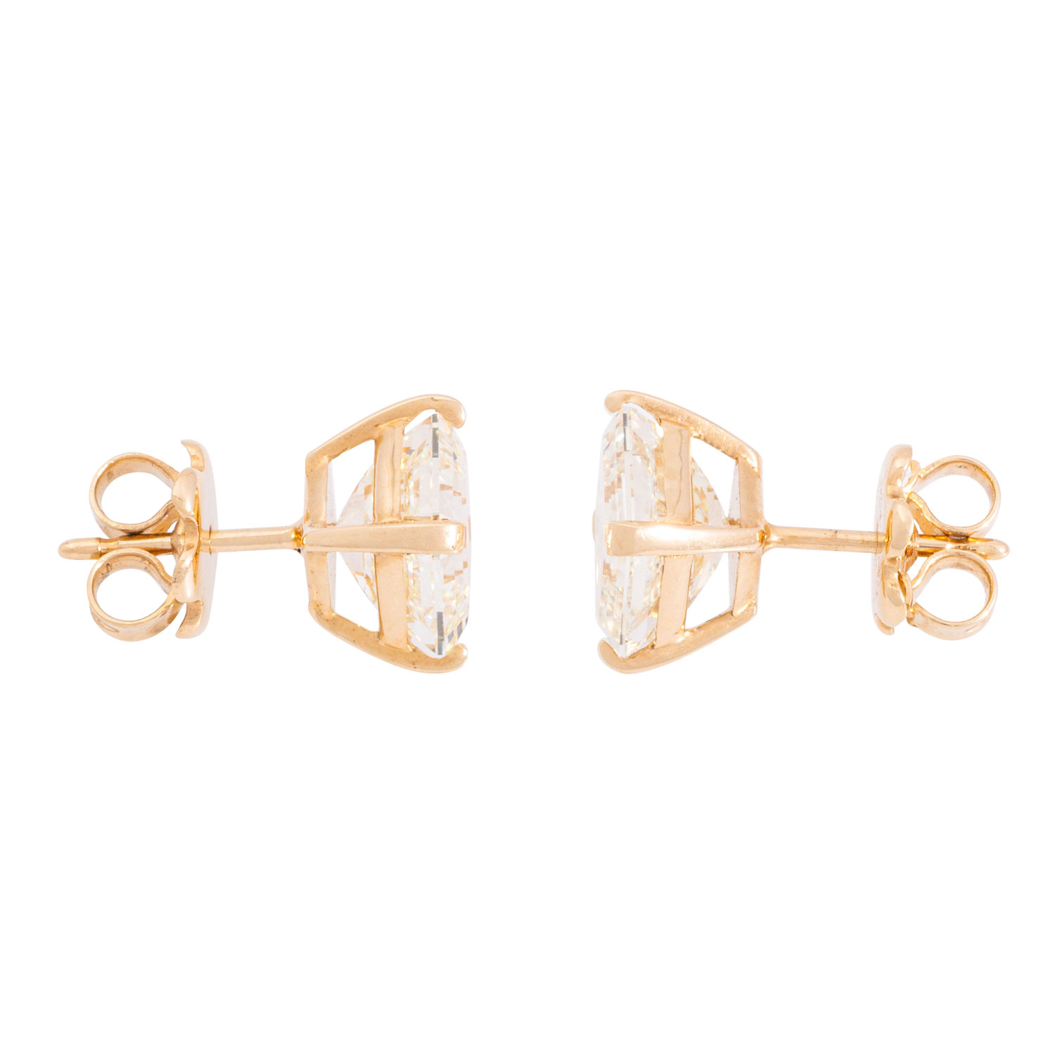 Pair of stud earrings with 2 square-cut emerald diamonds, 1 x 3.02 ct, TIN (N)/ IF and 1 x 3.08 ct, TIN (M)/VS1, YG 18K, 4.5 g, 21. GIA certificates no.: 7466865780 and 2225192450 enclosed.