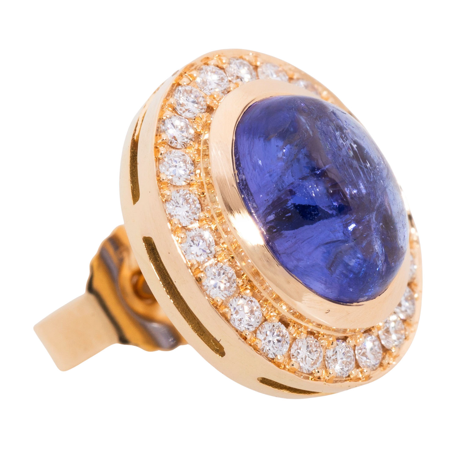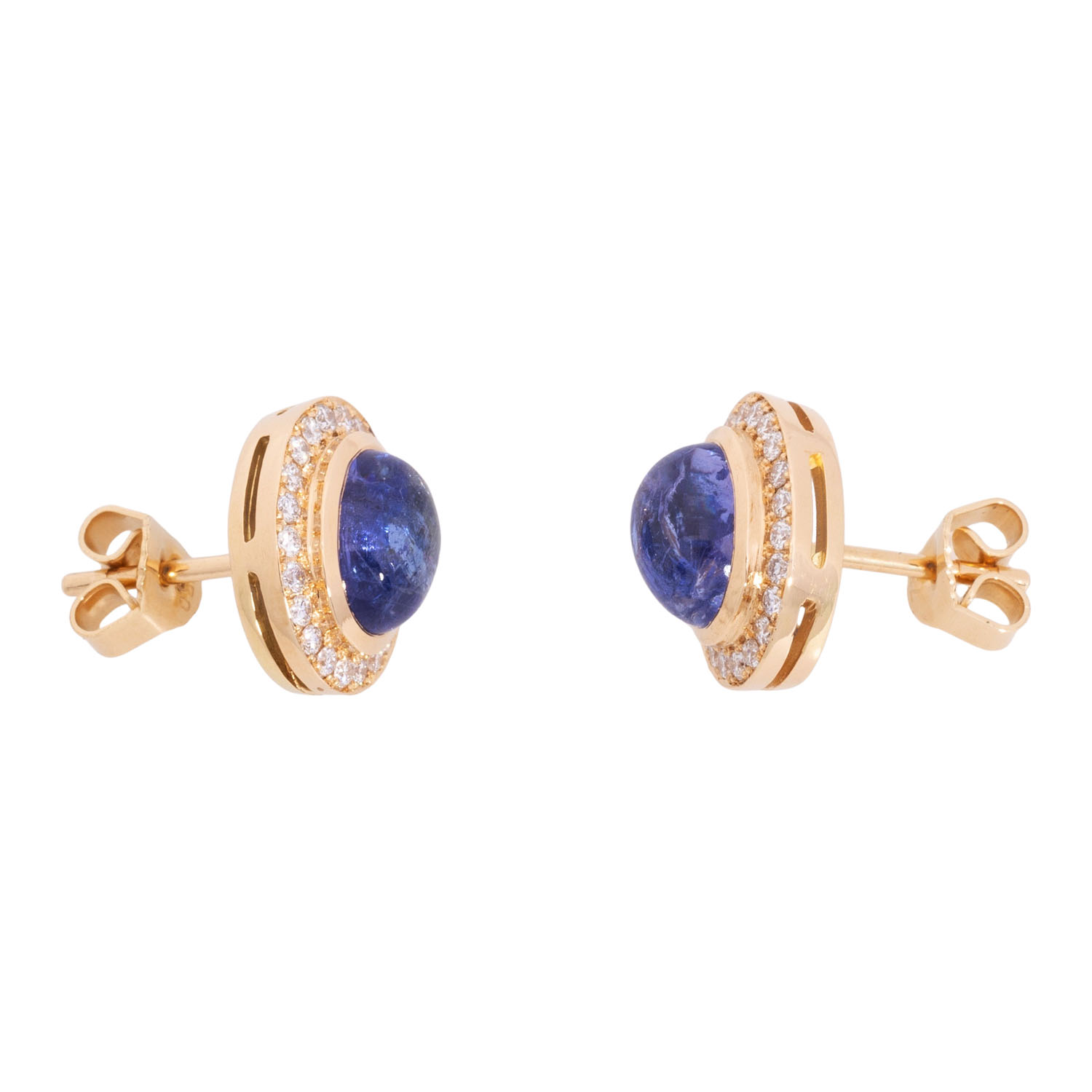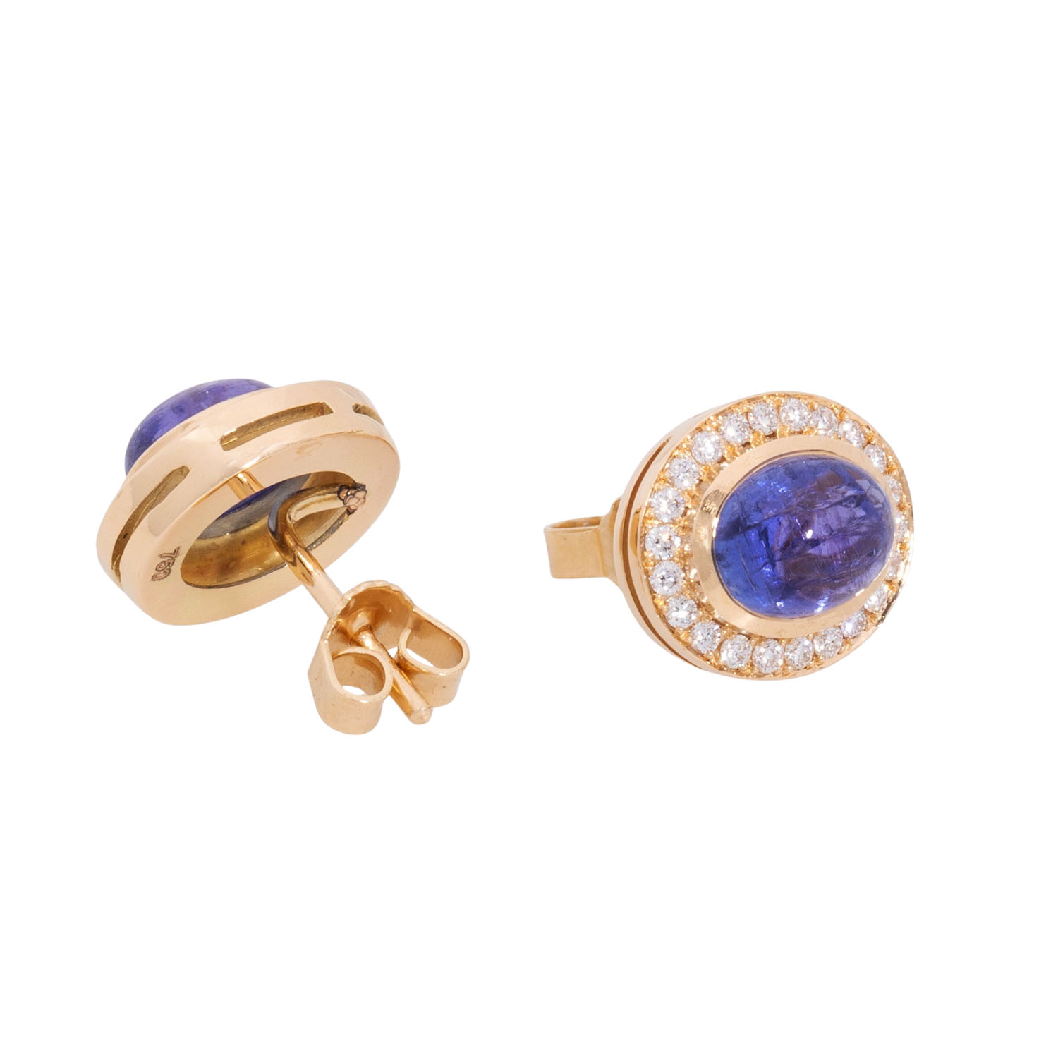 Pair of stud earrings with 2 cabochon-cut tanzanites totalling 4.10 ct, surrounded by brilliant-cut diamonds totalling 0.41 ct, FW (G)VS-SI, GG 18K, 6.3 g, L x W 12 x 11 mm, 21st century, mint condition, jeweller's quality.