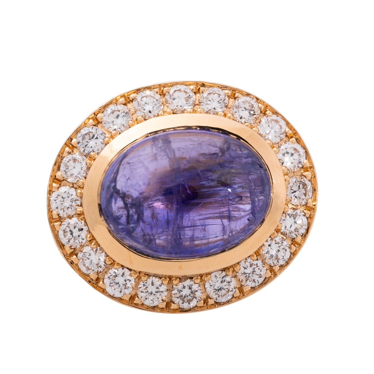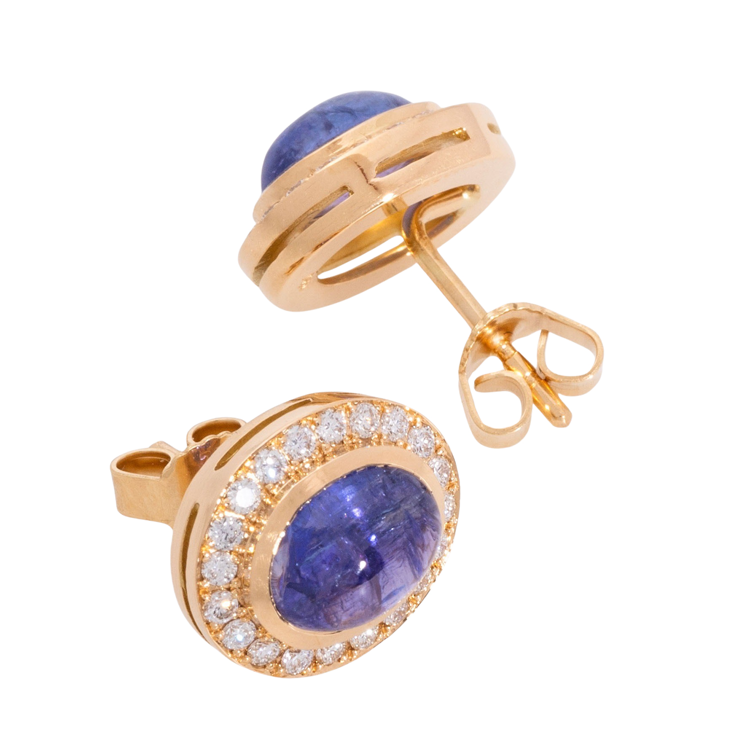 Pair of stud earrings with 2 cabochon-cut tanzanites totalling 3.60 ct, surrounded by brilliant-cut diamonds totalling 0.48 ct, RW (G)/VS-SI, YG 18K, 6.3g, L x W 12.8 x 11 mm, 21st century, jeweller's quality. Mint condition.
