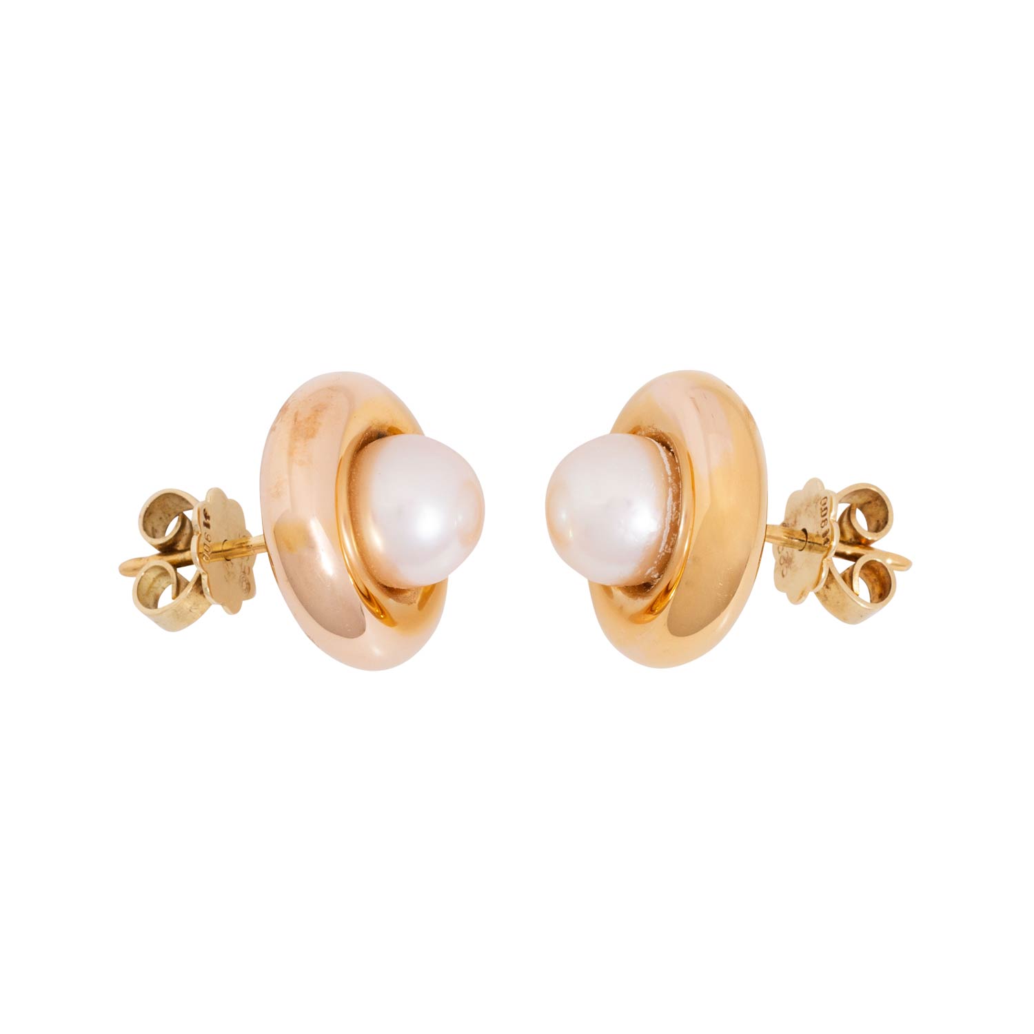 Pair of earstuds with 2 white cultured Akoya pearls, D, 7.3 mm, good lustre, 14K yellow gold, 5.6 g, D: 14.3 mm, late 20th century, minimal signs of wear.