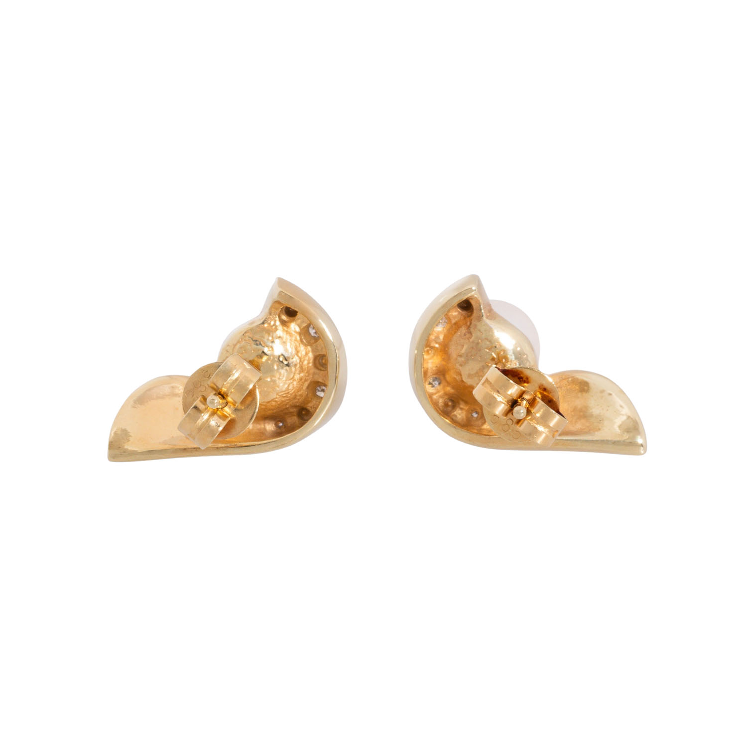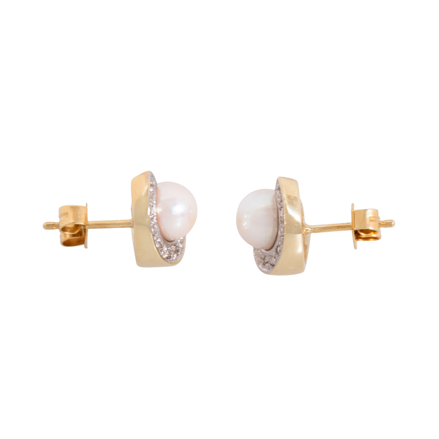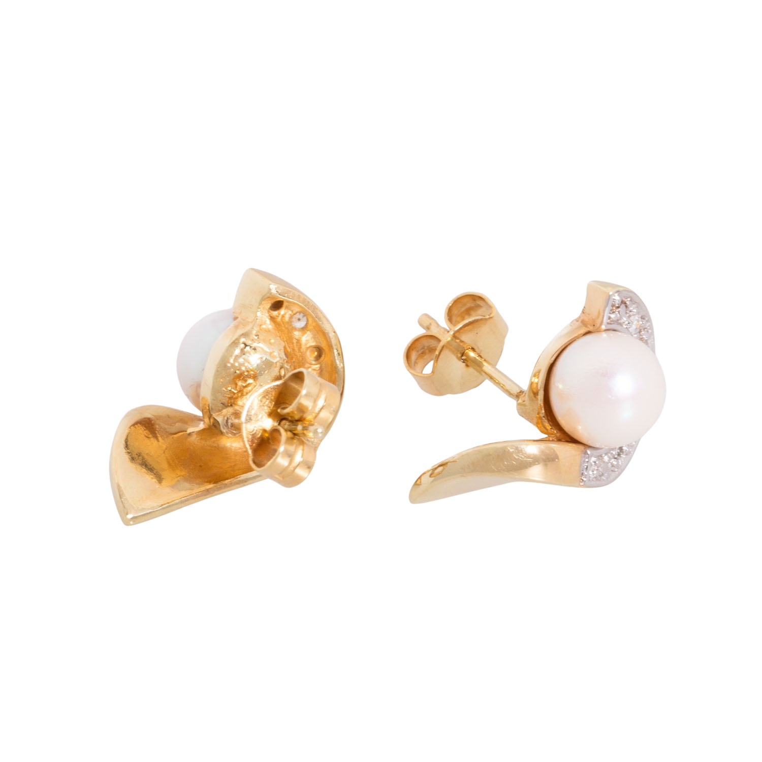 Pair of ear studs with cultured Akoya pearls ca. 6.5 mm, nice lustre, 6 single-cut diamonds totalling ca.0.06 ct, good colour and clarity, 14K yellow gold, 5.8 g, 21st century, minimal signs of wear.