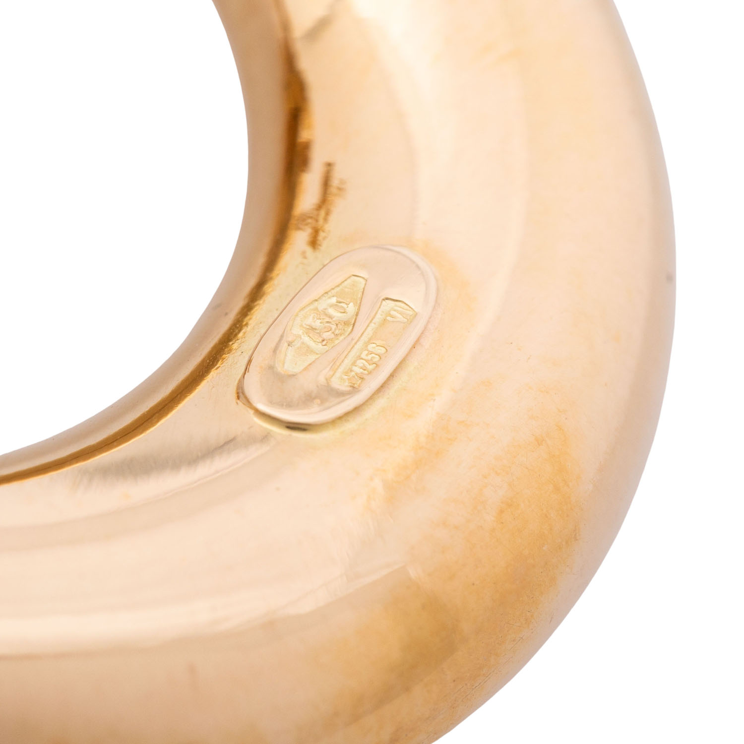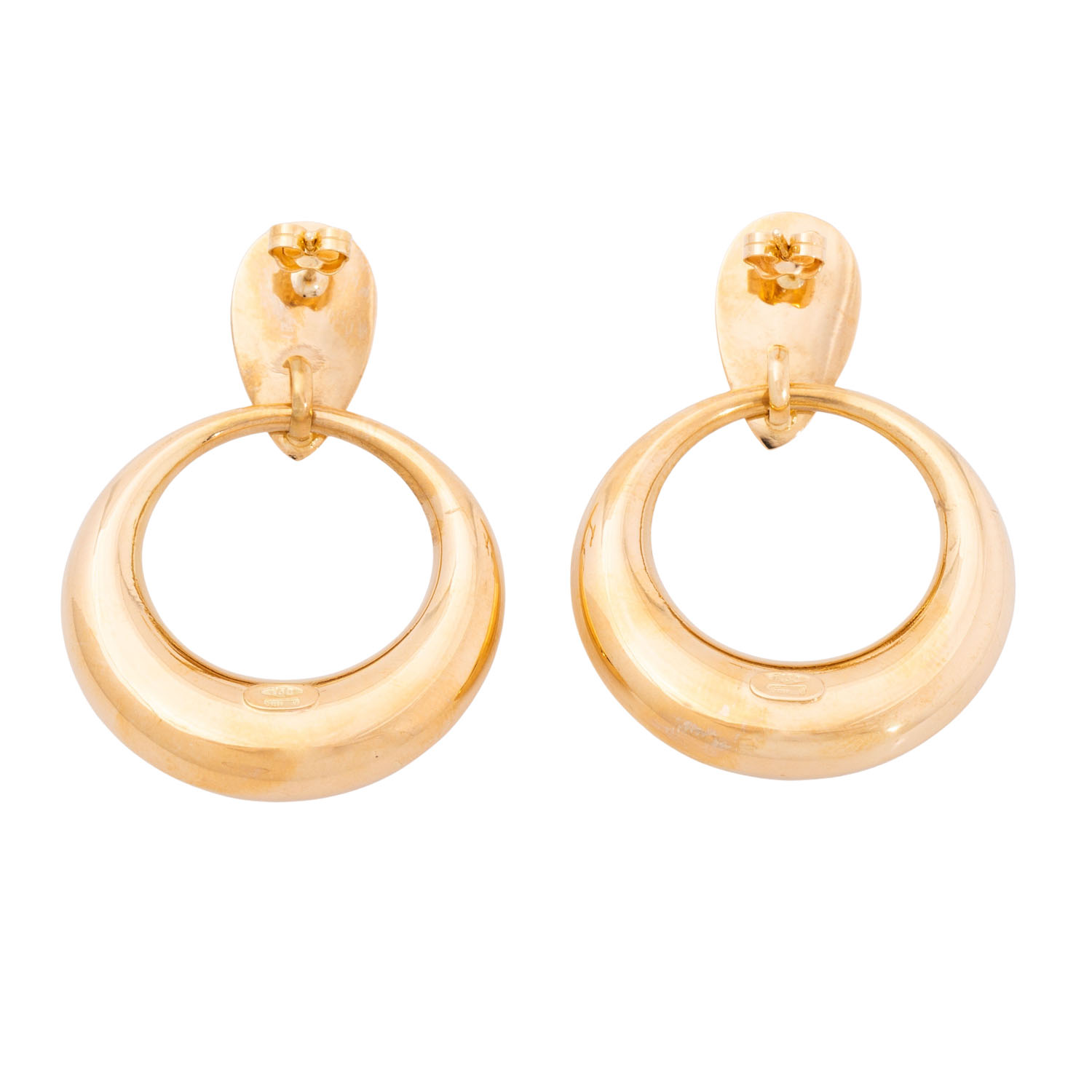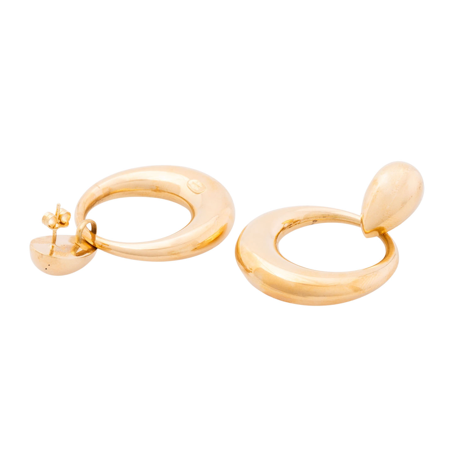 Pair of earstuds with mounted rings, highly polished, 18K yellow gold, 14.6 g, L x W: 48 x 34 mm, 20th/21st century, minimal signs of wear.