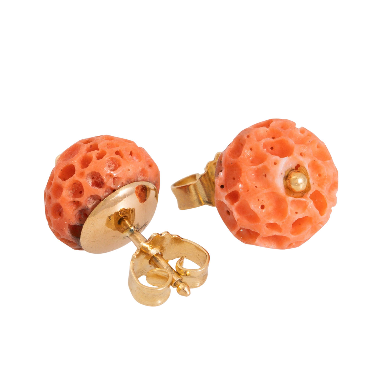 Pair of stud earrings with coral beads ca. 1 cm, 18K yellow gold, 2.2 g, late 20th century, minimal signs of wear, NO SHIPPING OUTSIDE THE EU!