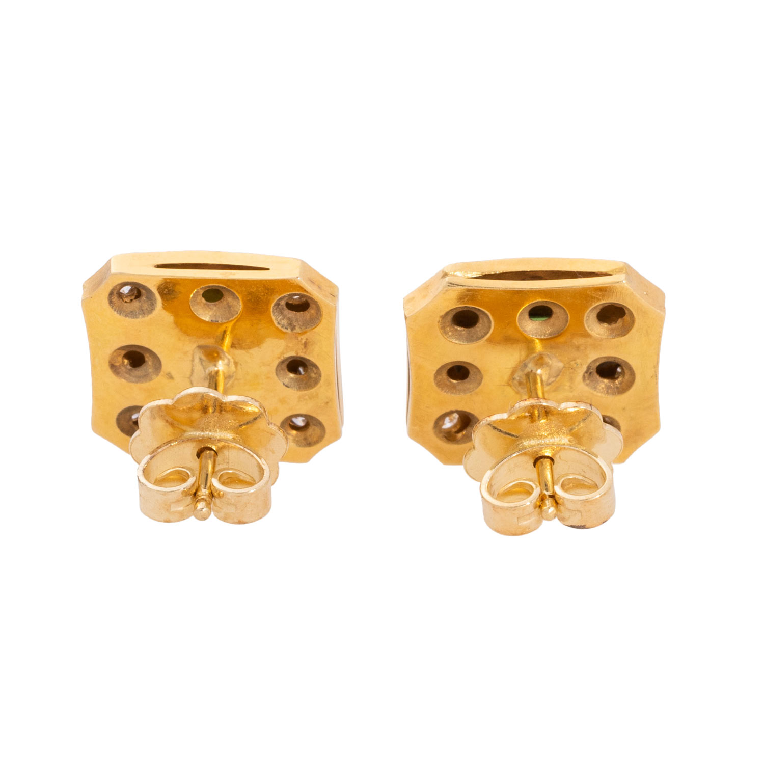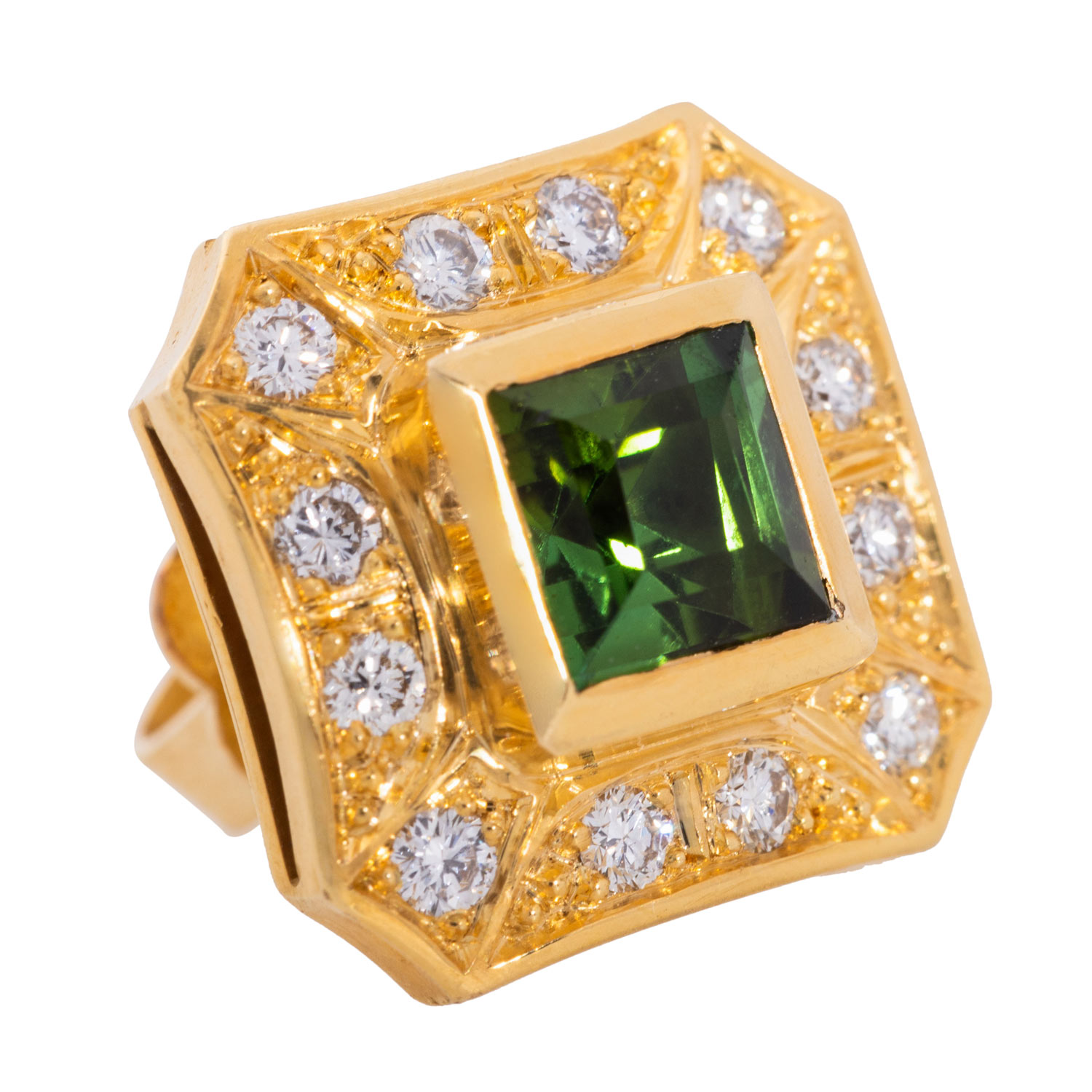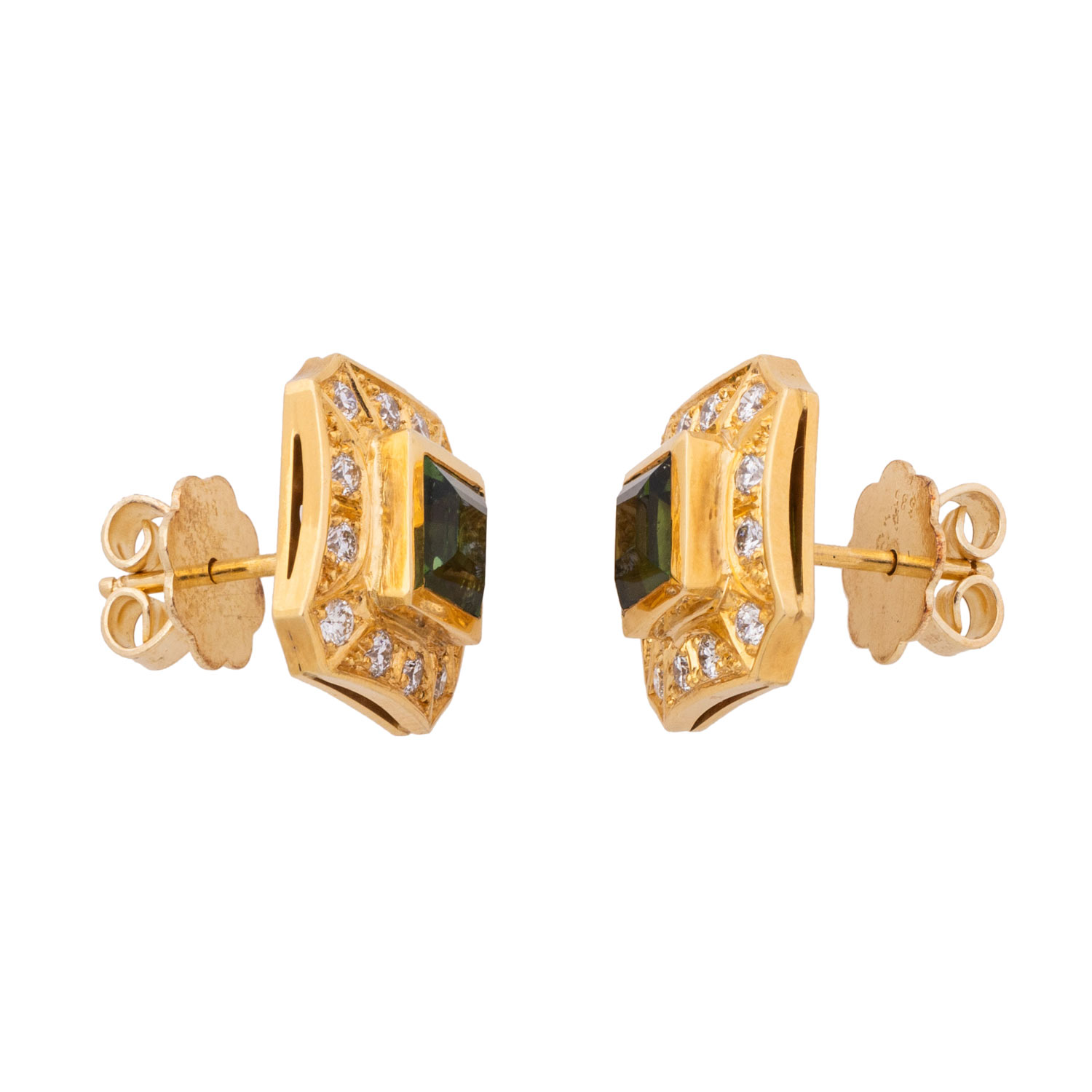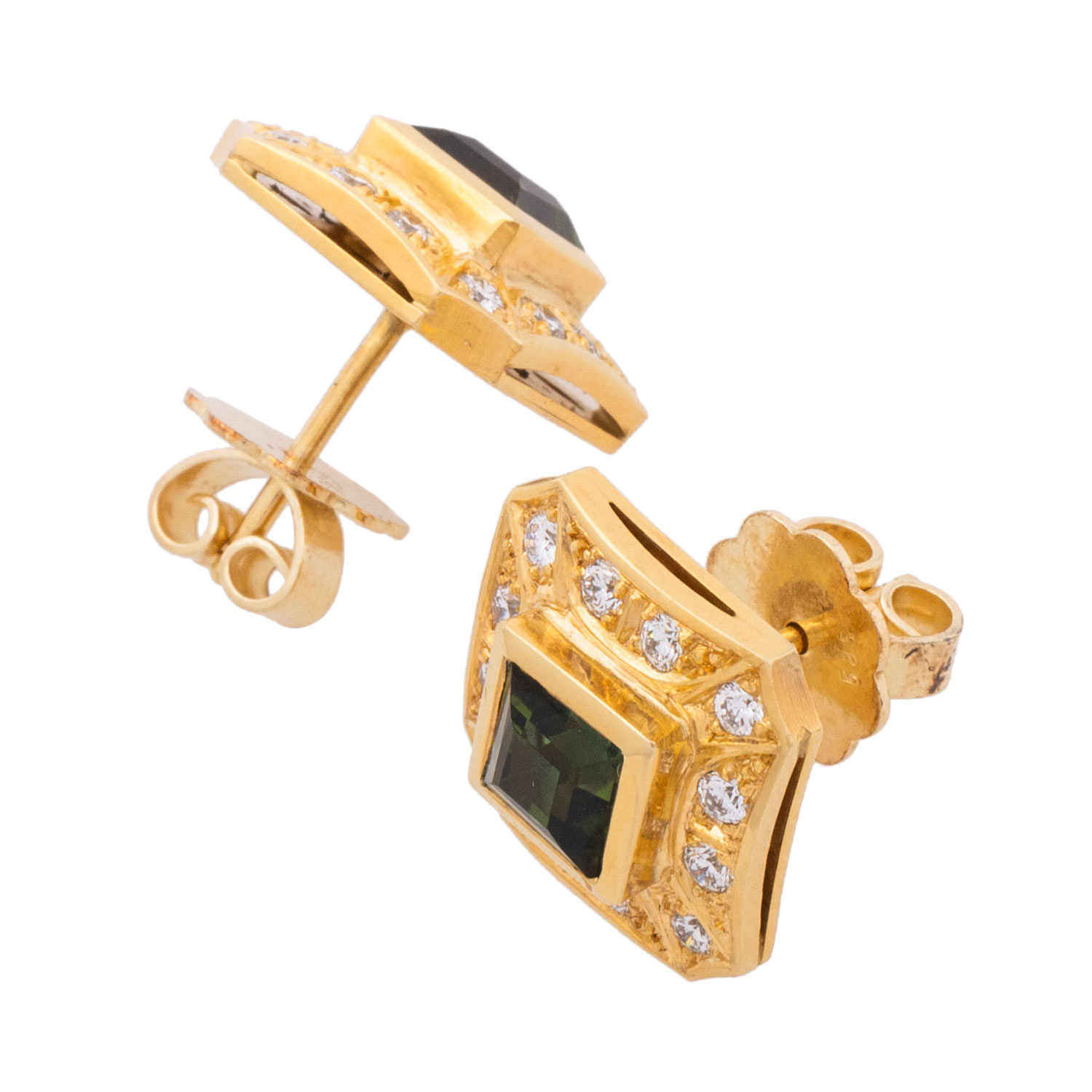 Pair of earring with green tourmalines totalling ca. 1,1 ct and brilliant- cut diamonds totalling ca. 0,53 ct, good colour and clarity. 14K YG, 7,6g, ca. 1,2x1,2 cm. 20th/ 21st century, minor signs of wear.
