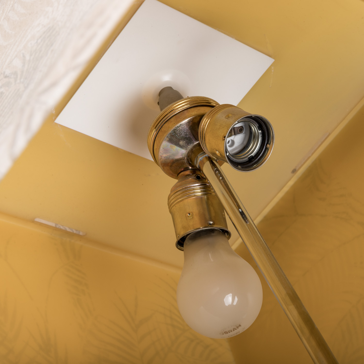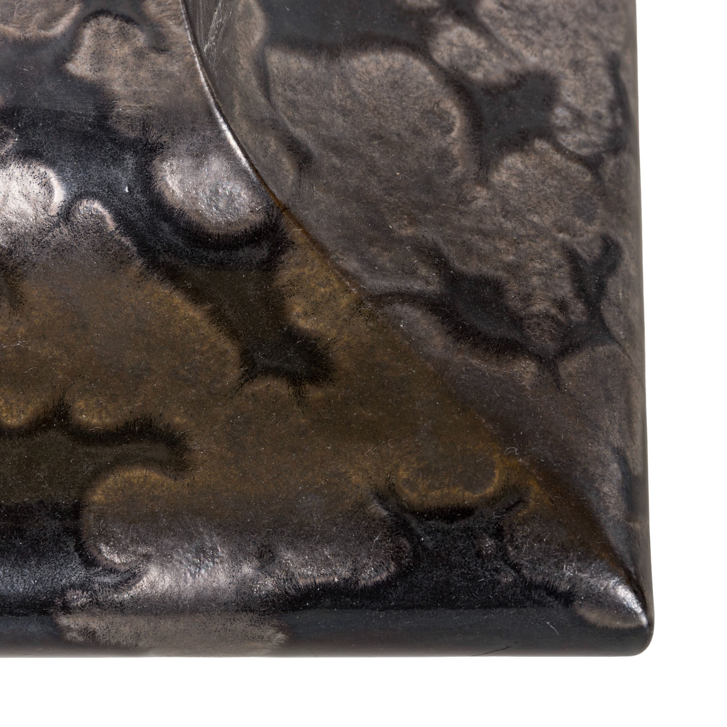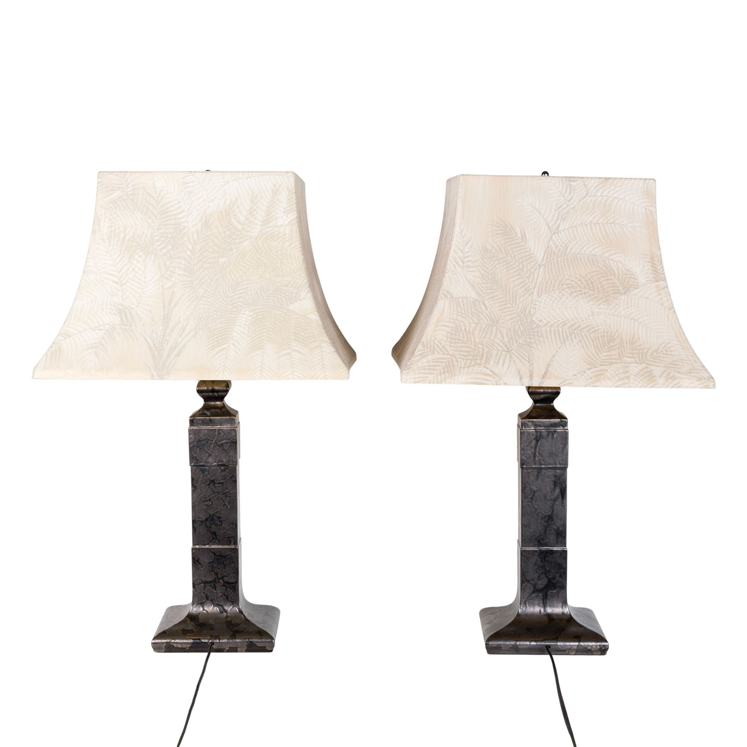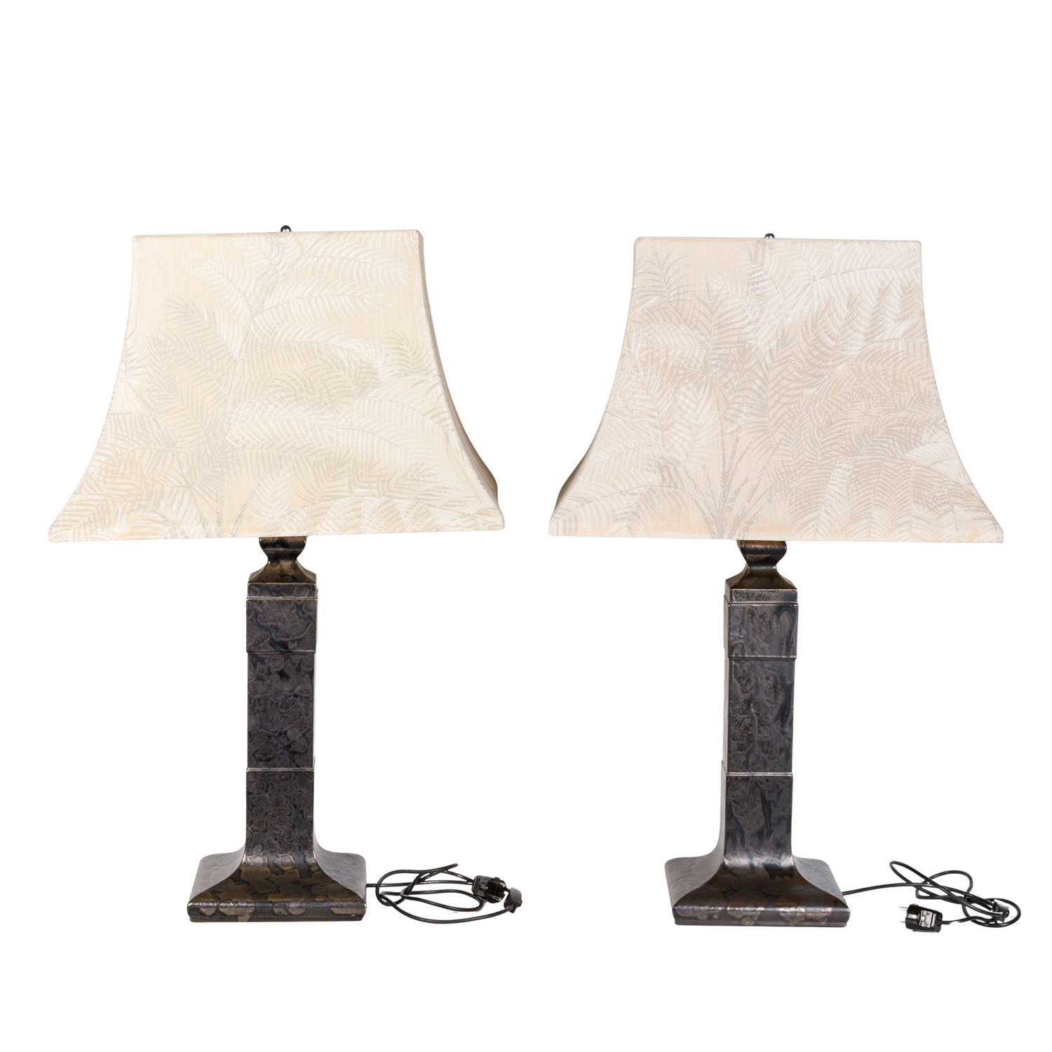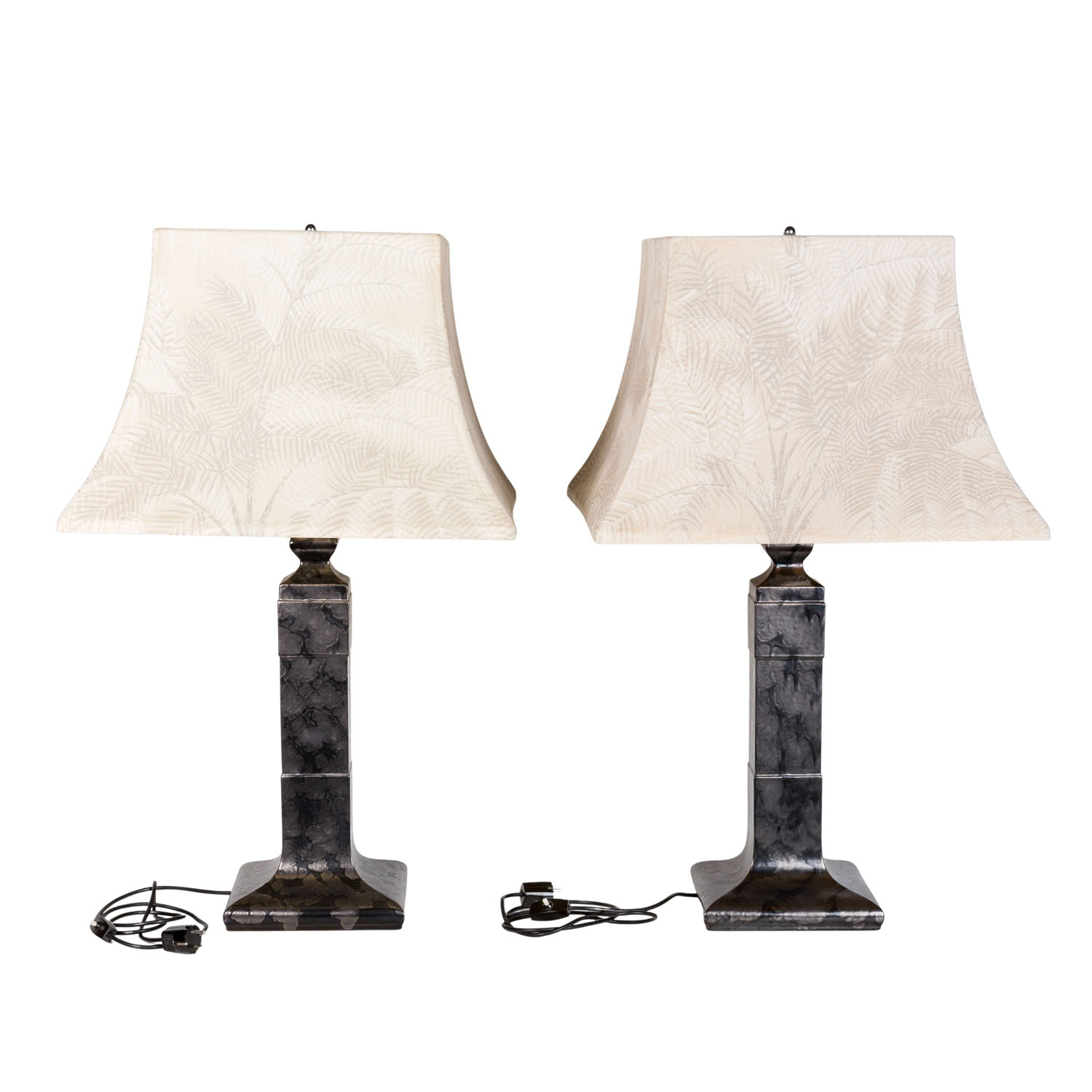 80s table lamps with four-pass ceramic base, glazed in dark silver marbled color, plastic shade with silk covering. HxWxD with shade: 90/55/55 cm. Functional, some slight signs of age and use. Acquired at Licht+Wohnen in Karlsruhe.