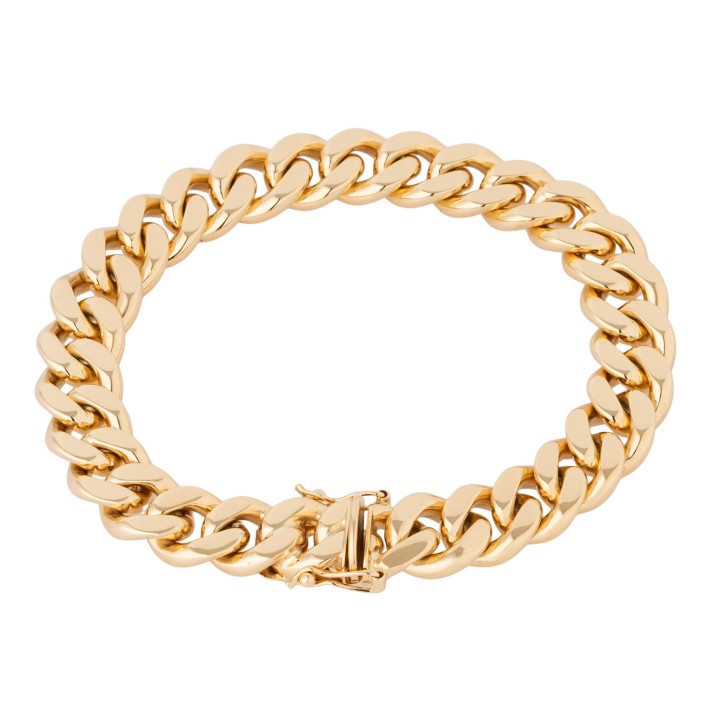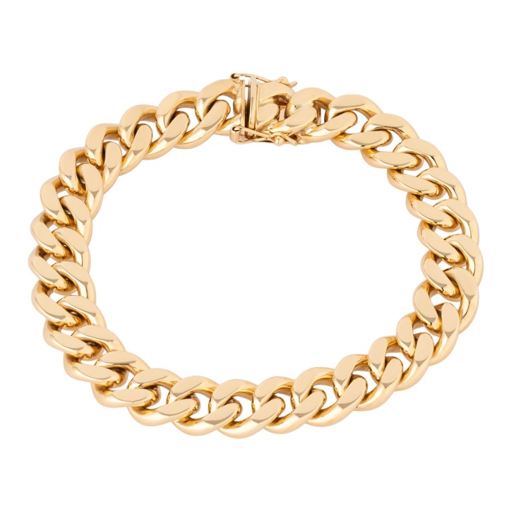Curb link bracelet, 18K yellow gold, 74 g, L: ca. 19.5 cm, W: ca. 1 cm, late 20th century, minor signs of wear, box clasp with 2 safety catches.