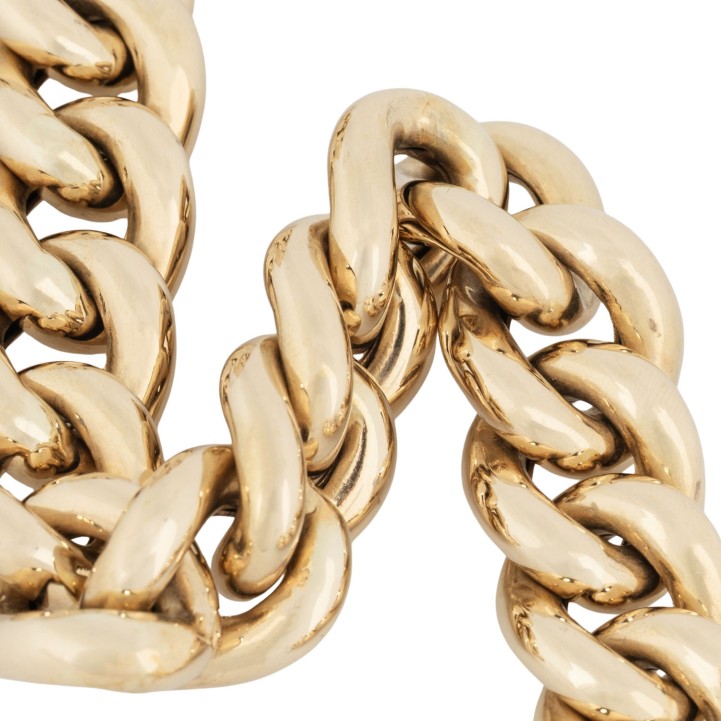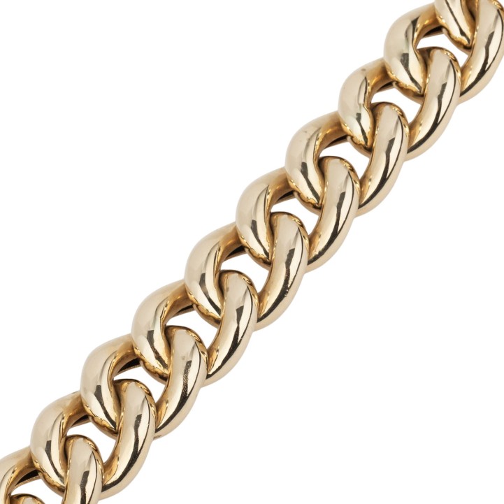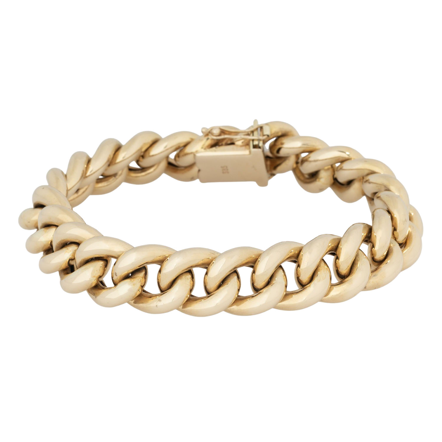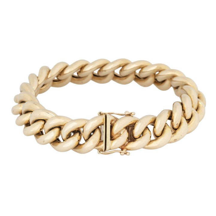 Curb link bracelet, 14 K yellow gold, 34,6 g, L: ca. 19 cm, W: ca. 1,2 cm, 20th/21st century, minorl signs of wear, box clasp with 2 safety catches,