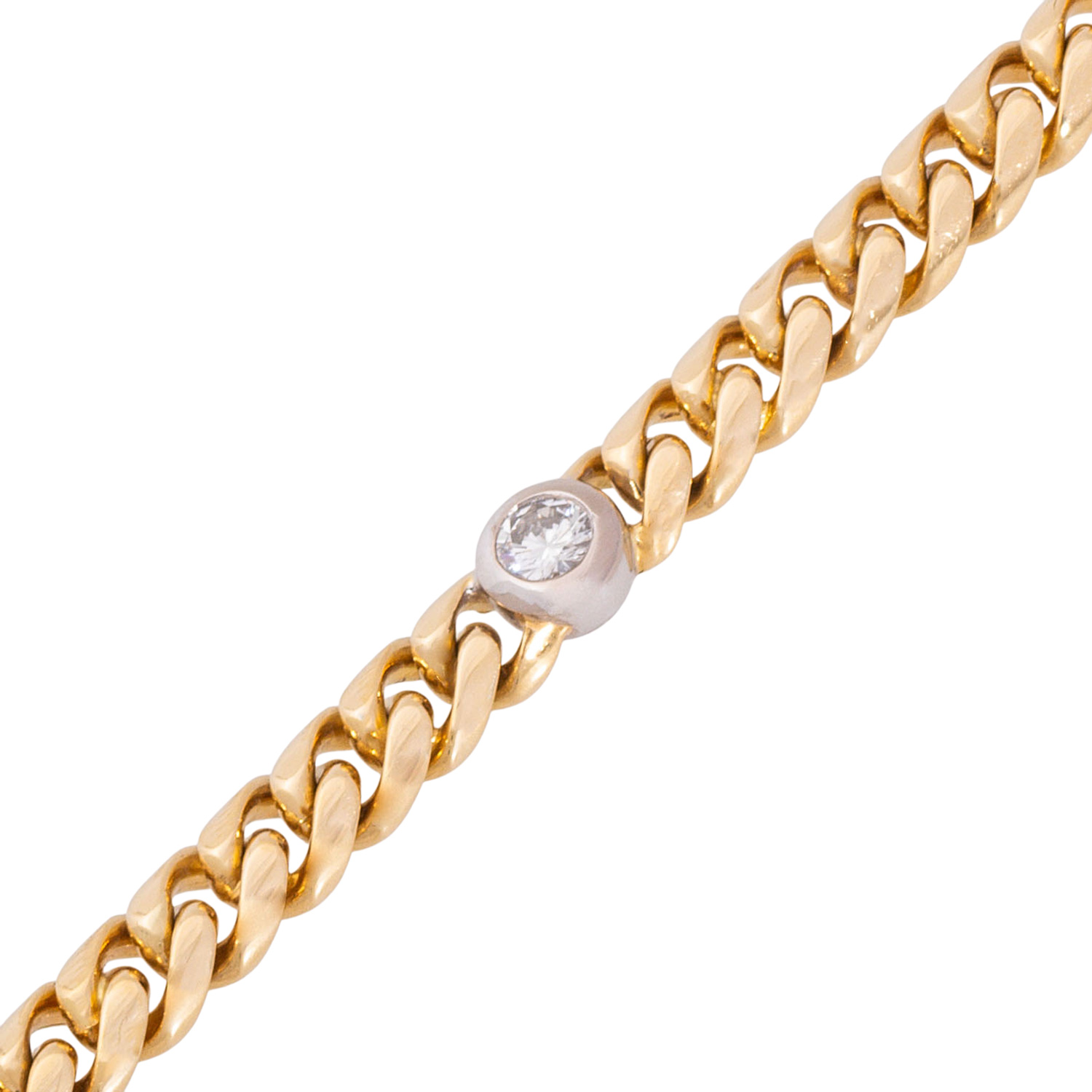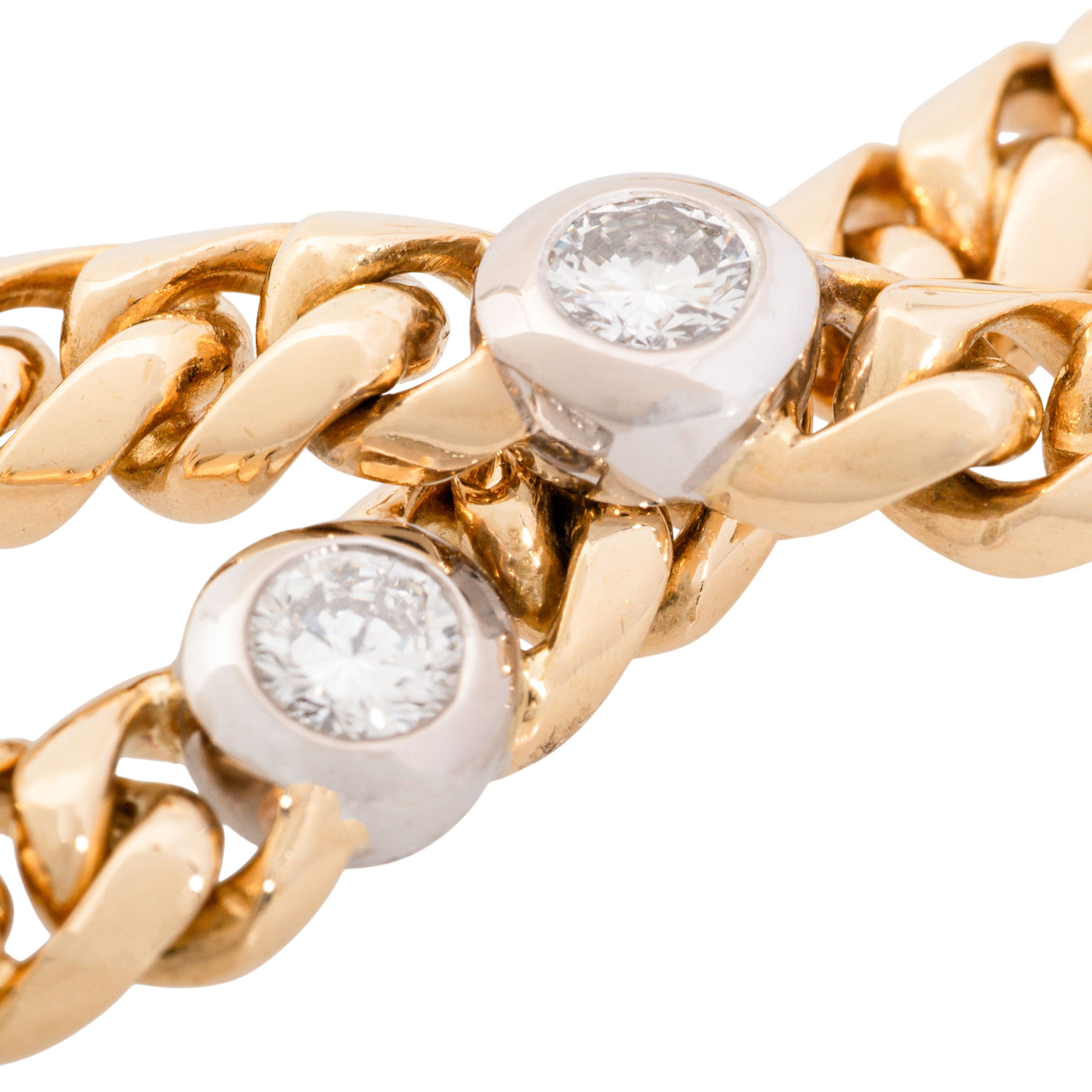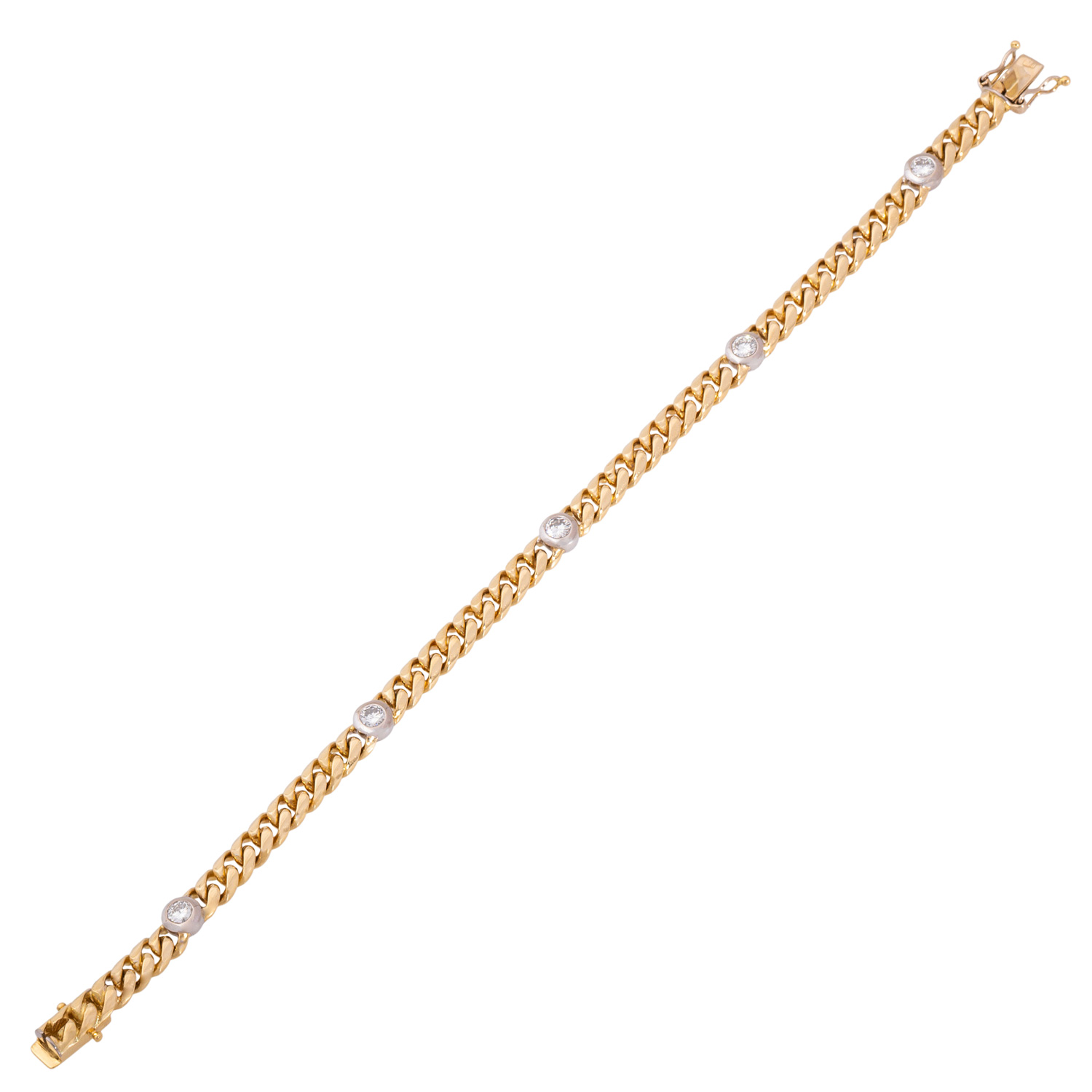 Curb link bracelet with 5 brilliant cut diamonds, totalling ap. 0.70 ct, WHITE (H)/VS, 18K yellow and white gold, L: 18.5 cm, W: 5 mm, box clasp with 2 safety catches, late 20th century, minimal signs of wear.