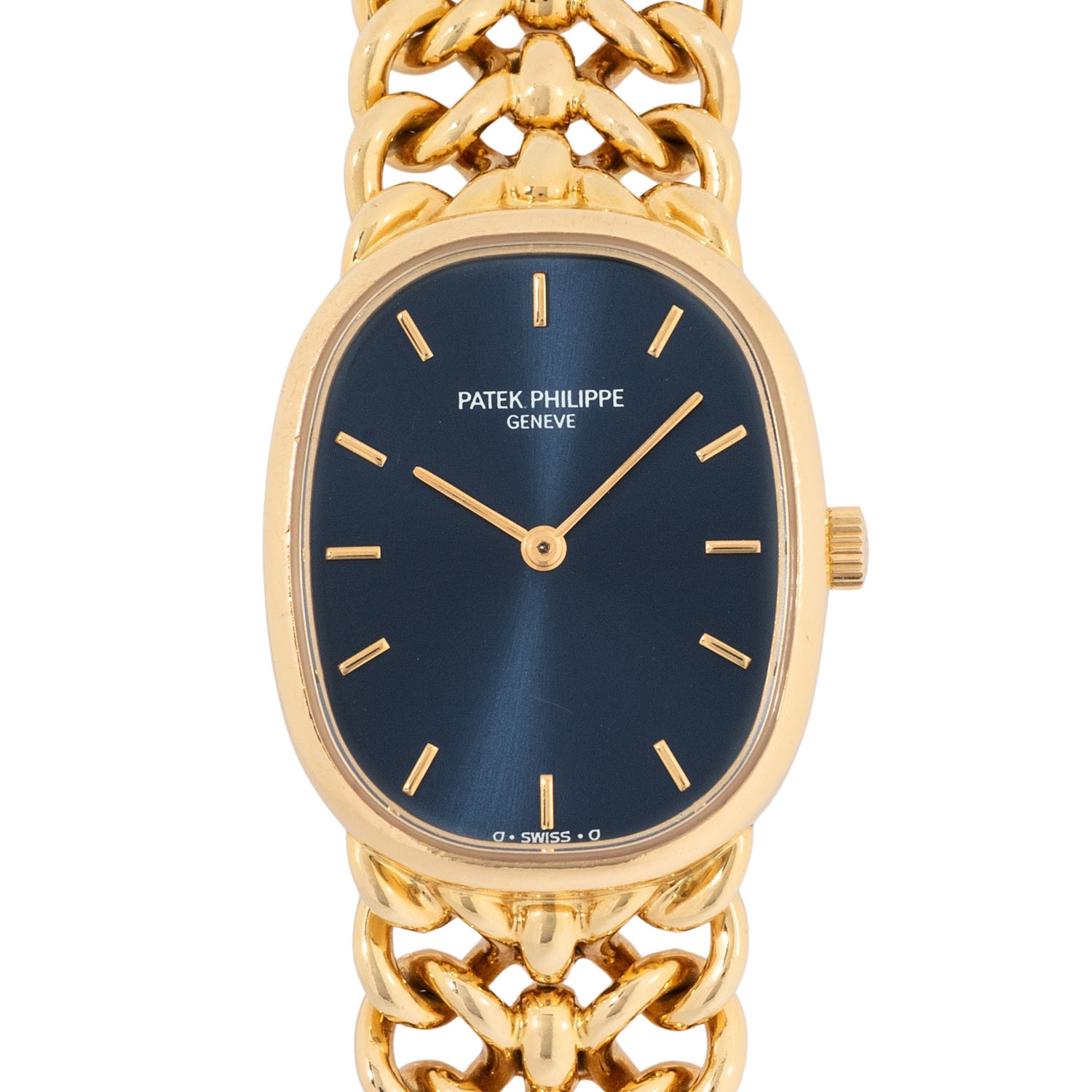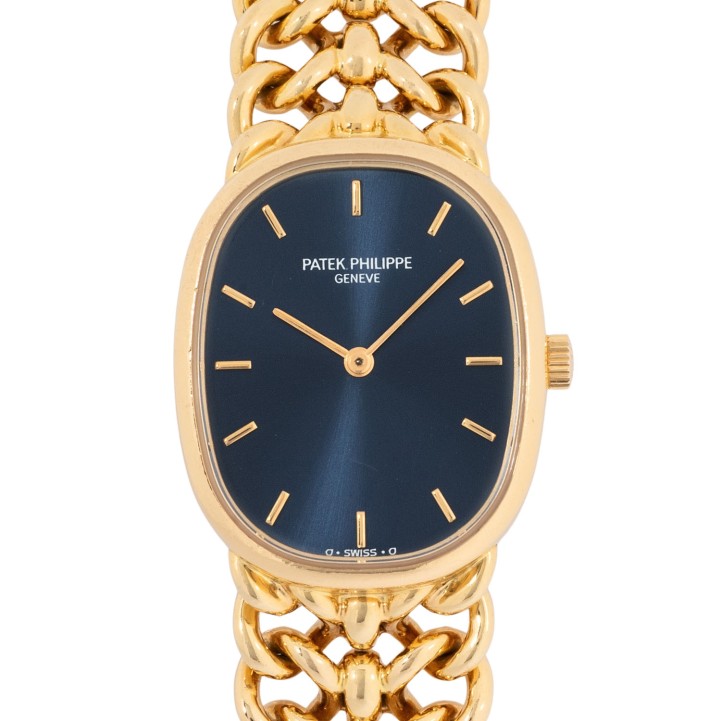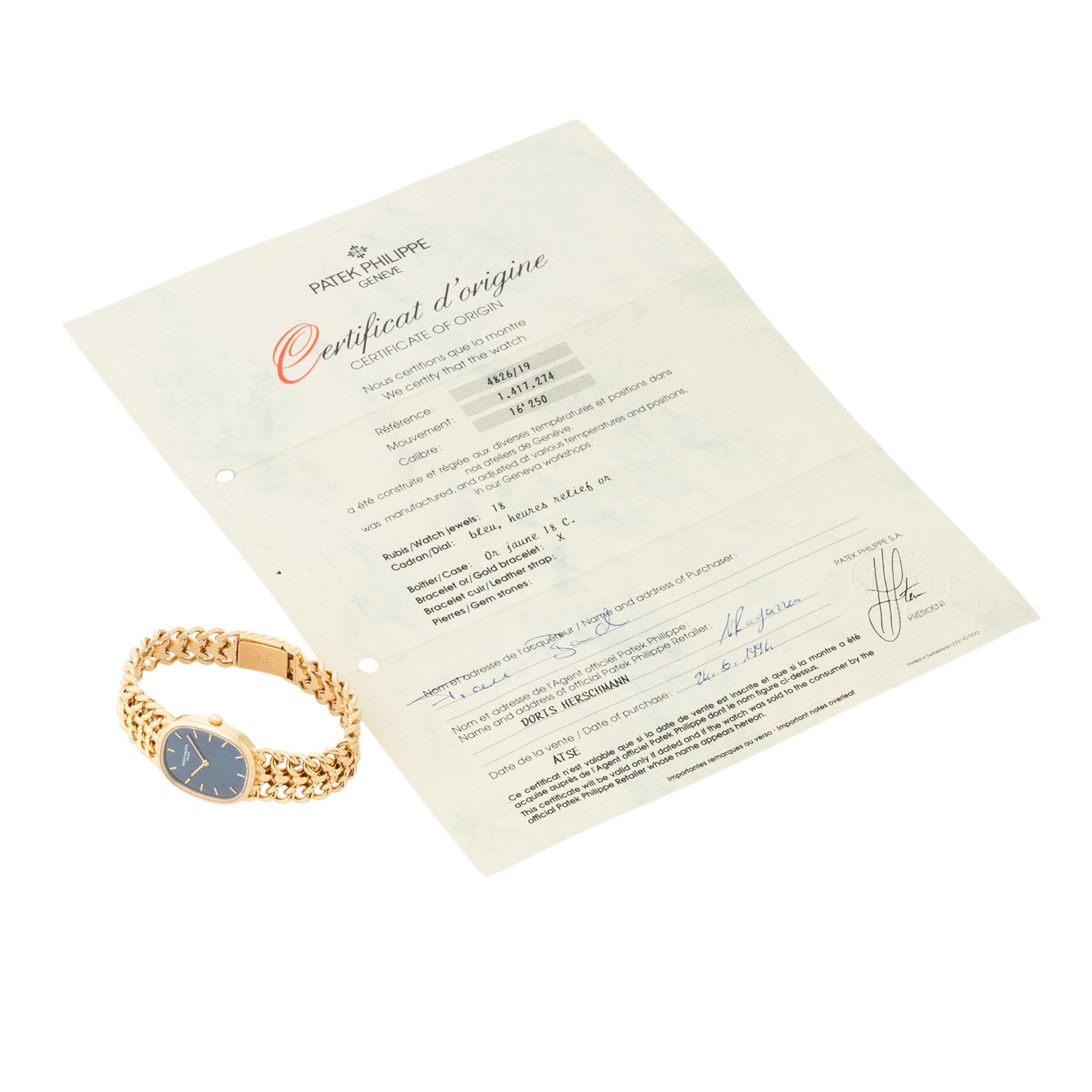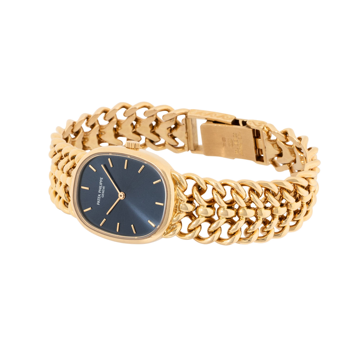 PATEK PHILIPPE Ellipse Ref 4826 'Sigma Dial' ladies' watch from 1994 with papers. 18K yellow gold. Movement no. 1417274. Hand-wound movement cal. 16-250 with very good performance (+6 s/d. 263° amplitude). Blue Sigma dial with baton indices. Patek Philippe bracelet in 18K yellow gold with folding clasp. Good condition with signs of wear. Certificate of authenticity from Patek Philippe included. The watch was purchased in June 1994 from jeweler Doris Herschmann in Ascona (Switzerland). Diameter approx. 23 mm (measured without crown). Suitable for wrist size up to approx. 17 cm.