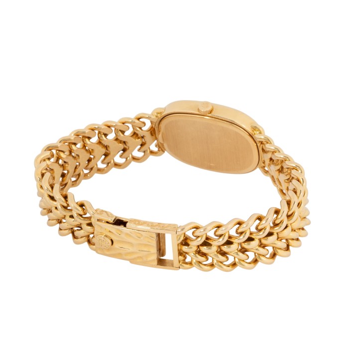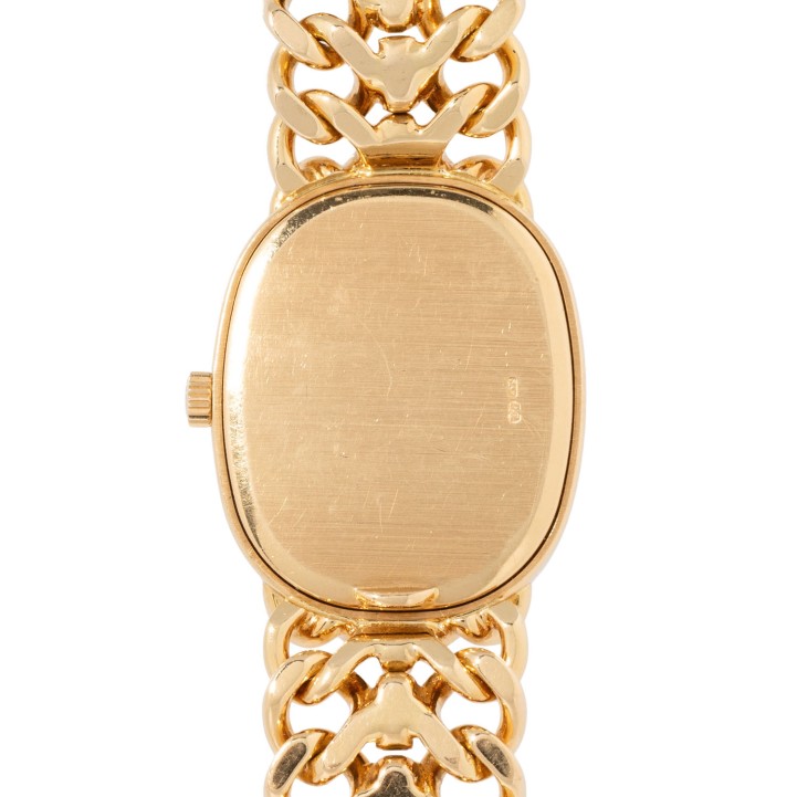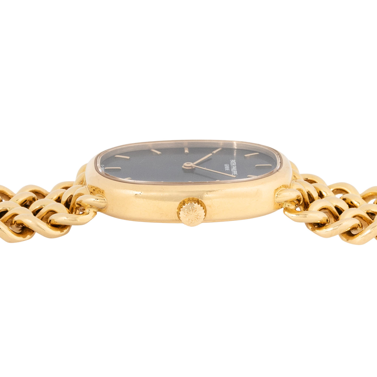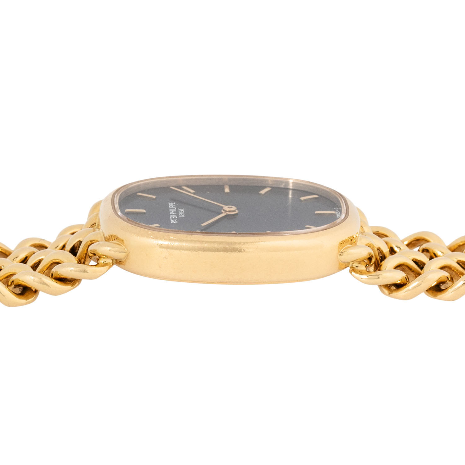 PATEK PHILIPPE Ellipse Ref 4826 'Sigma Dial' ladies' watch from 1994 with papers. 18K yellow gold. Movement no. 1417274. Hand-wound movement cal. 16-250 with very good performance (+6 s/d. 263° amplitude). Blue Sigma dial with baton indices. Patek Philippe bracelet in 18K yellow gold with folding clasp. Good condition with signs of wear. Certificate of authenticity from Patek Philippe included. The watch was purchased in June 1994 from jeweler Doris Herschmann in Ascona (Switzerland). Diameter approx. 23 mm (measured without crown). Suitable for wrist size up to approx. 17 cm.
