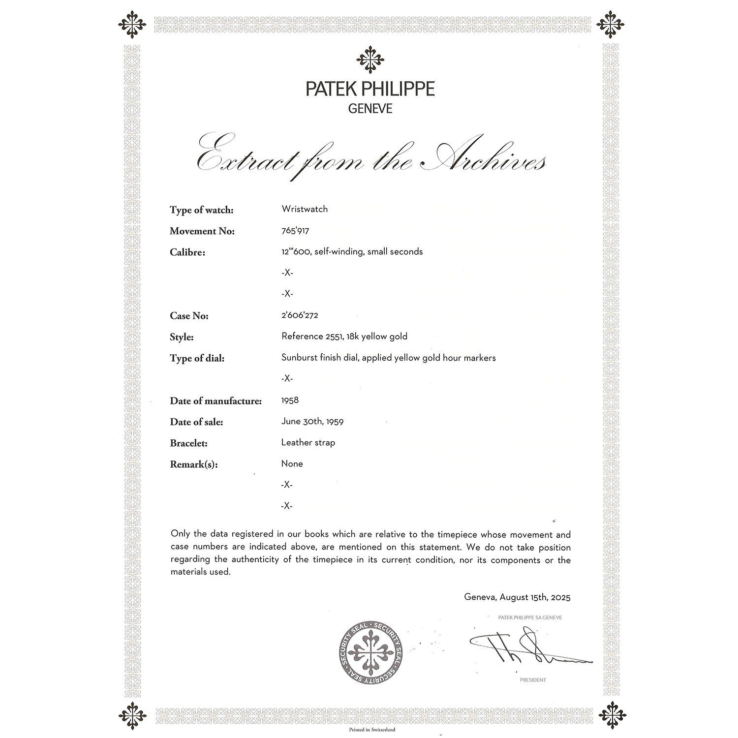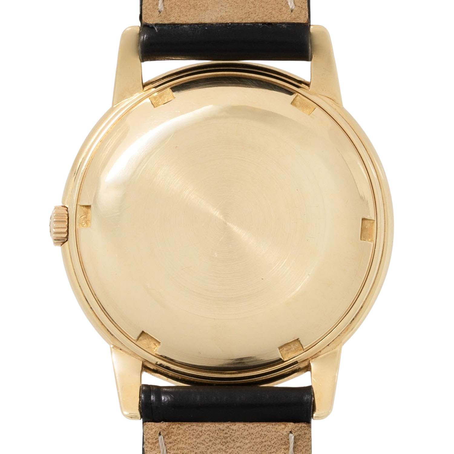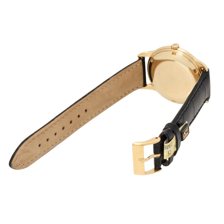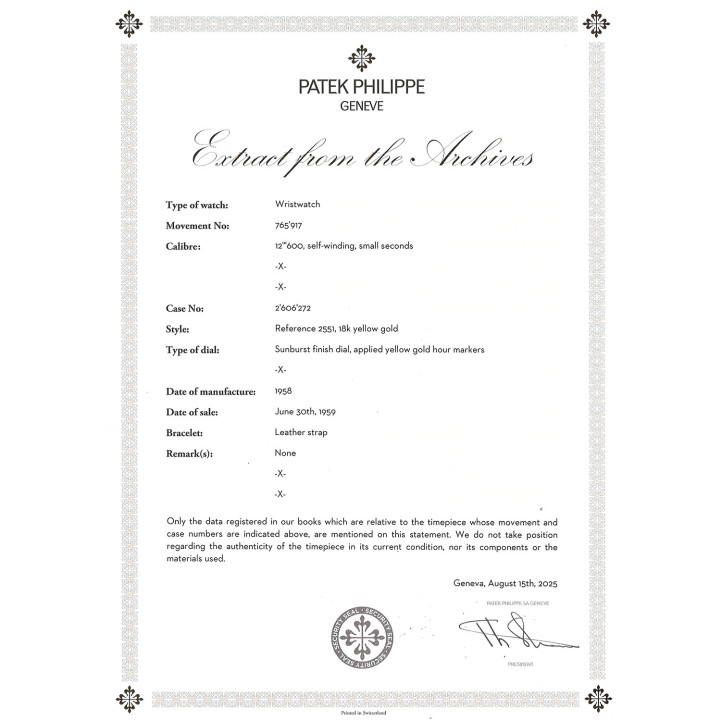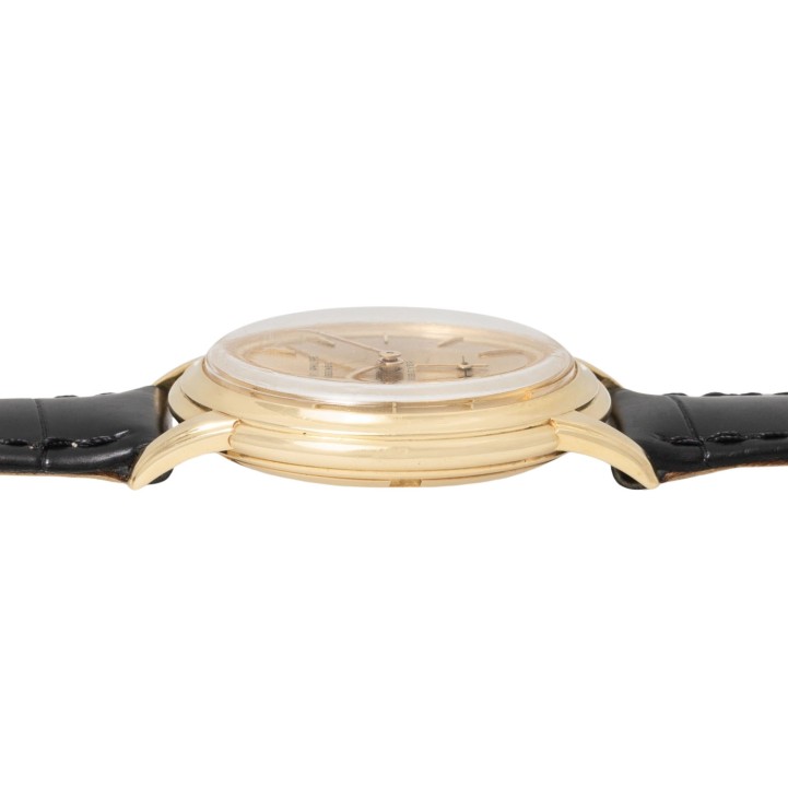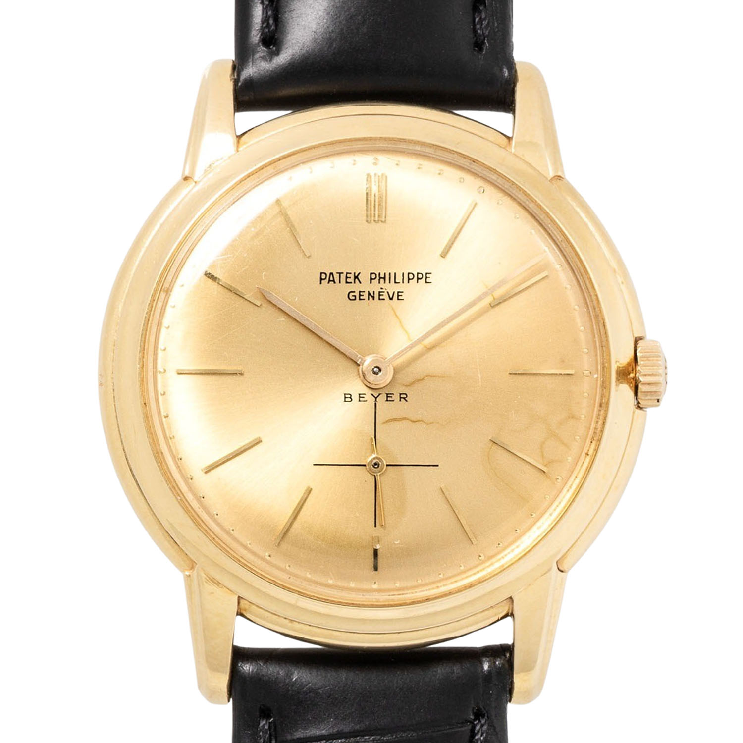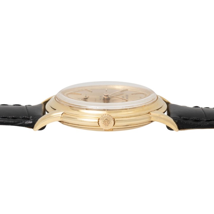 PATEK PHILIPPE Vintage historical important Calatrava Disco Volante 'BEYER', ref. 2551. Yellow gold 18K, screwed caseback. First PP automatic caliber 12-600AT (introduced 1953 in ref. 2526), only 7.099 units produced until 1960, oscillating weight made from solid gold 18K, very good working order (-1s/day, 263° amplitude). Golden colored dial with applied baton indices and baton hands in gold, double signed with dealer signature 'BEYER' above 6 o'clock. New black croco leather strap with gold-plated pin buckle. Visible signs of wear on the case, dial with light discoloration/changes on the dial laquer. Patek Philippe Extract from the Archives from 08/2025 enclosed. Diameter approx. 36mm measured without crown.