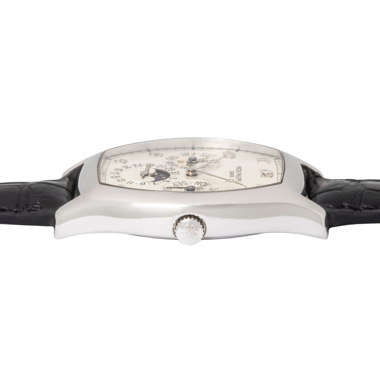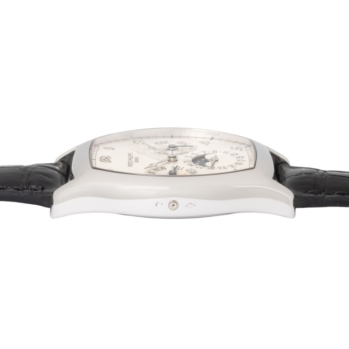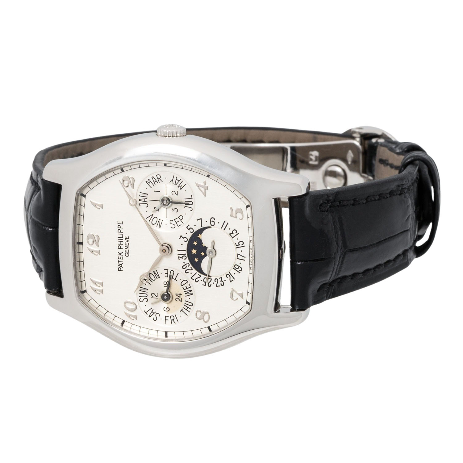 PATEK PHILIPPE rare Neo-Vintage Complications 'Perpetual Calendar' Men's watch, ref. 5040P-014. From 1998. Platinum 950. Automatic movement cal. 240 Q in good working order (+13s/day, 280° amplitude). Silver colored sigma dial with applied Breguet numerals in white gold and railroad minute track, perpetual calendar with display of weekday, pointer date, month, leap year, 24 hours and moonphase, Breguet hands in white gold. First Perpetual Calendar by Patek Philippe that features both Breguet numerals and Breguet hands. Original Patek Philippe leather strap with folding clasp in platinum 950. Good condition with signs of wear on case and strap, caseback with scratches, hands for weekday and month with light patina, dial replace in 1998 according Extract document. Original Patek Philippe travel case and Extract from the Archives from 07/2025 enclosed. Diameter approx. 35mm measured without crown.
