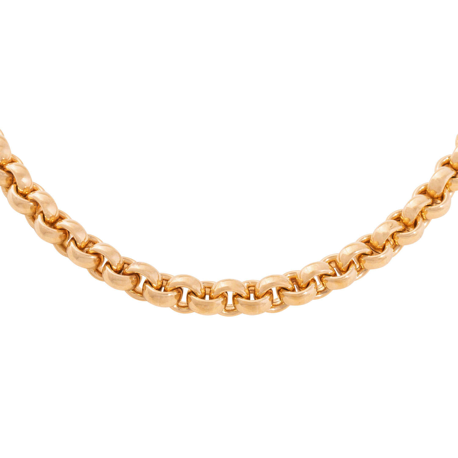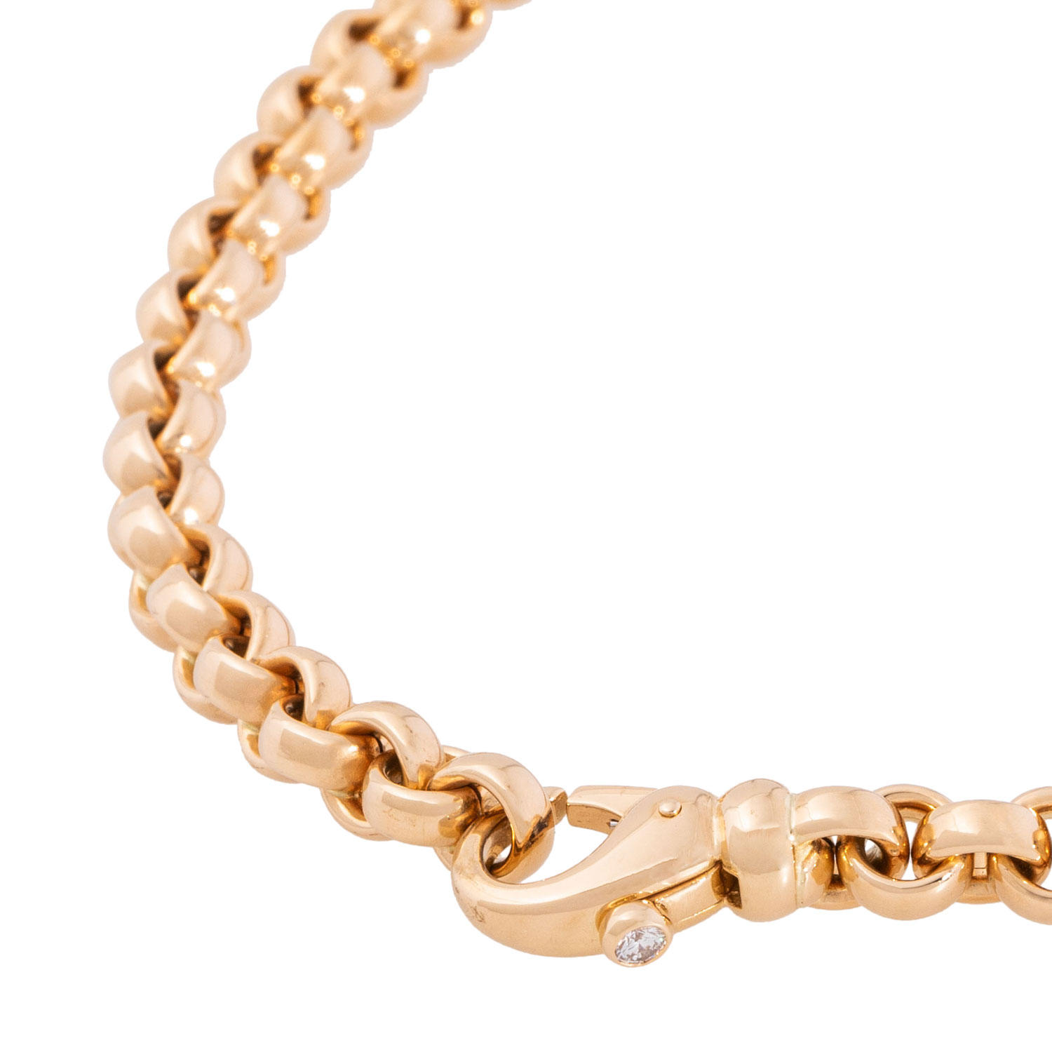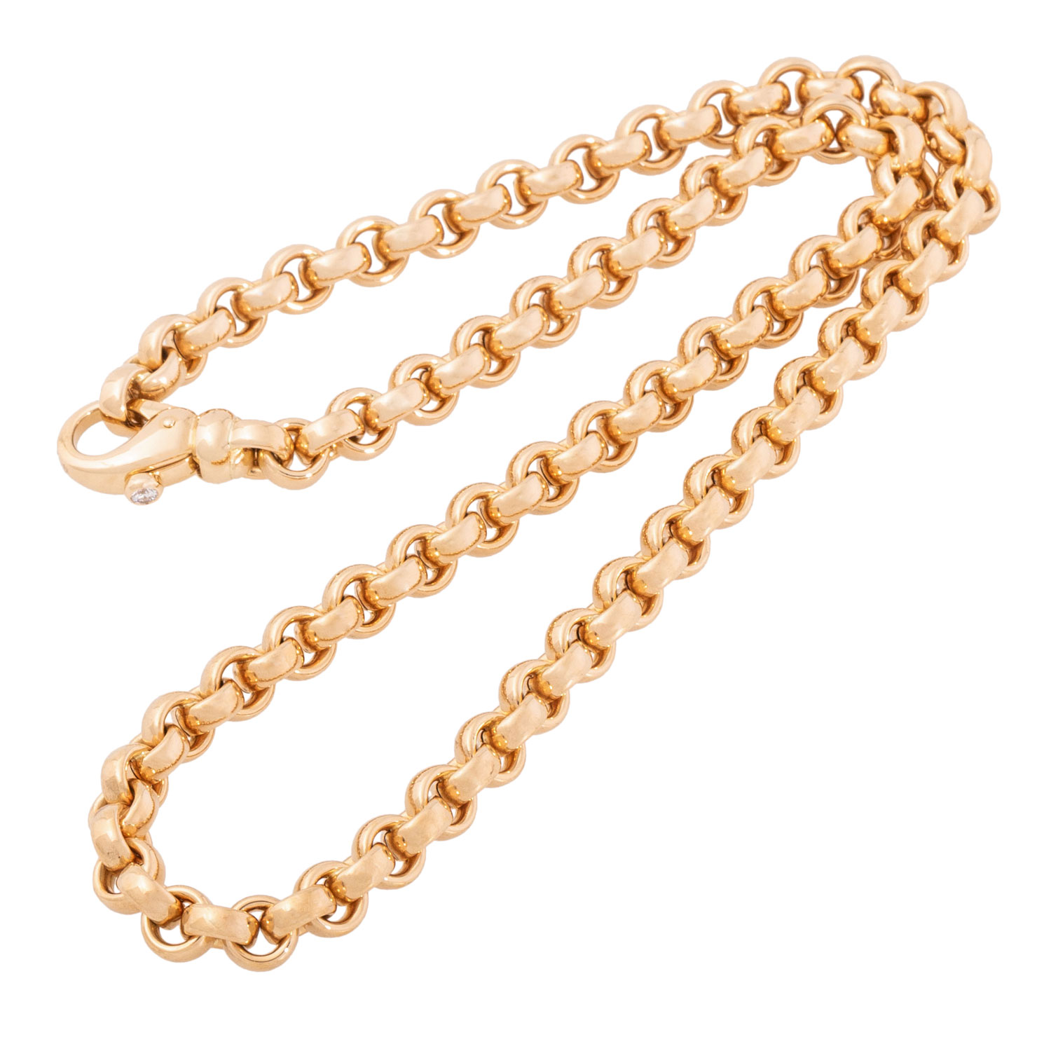 Heirloom chain with carabiner clasp, set with one brilliant cut diamond, ap. 0.08 ct, good colour and clarity, 18K yellow gold, 48.9 g, L: 43.5 cm, W: 6.6 cm, 20th/21st century, minimal signs of wear.