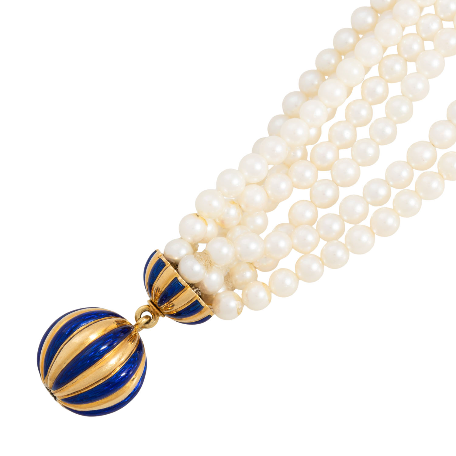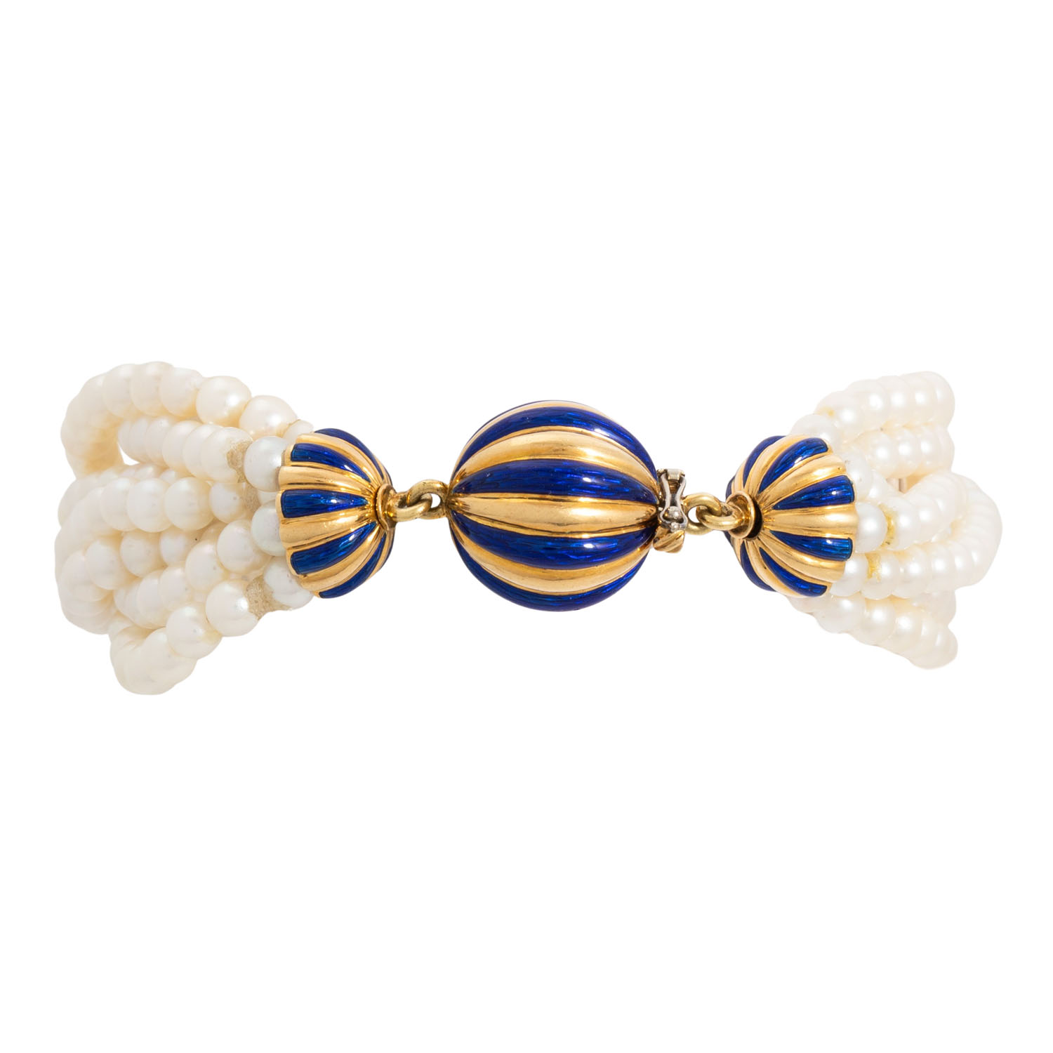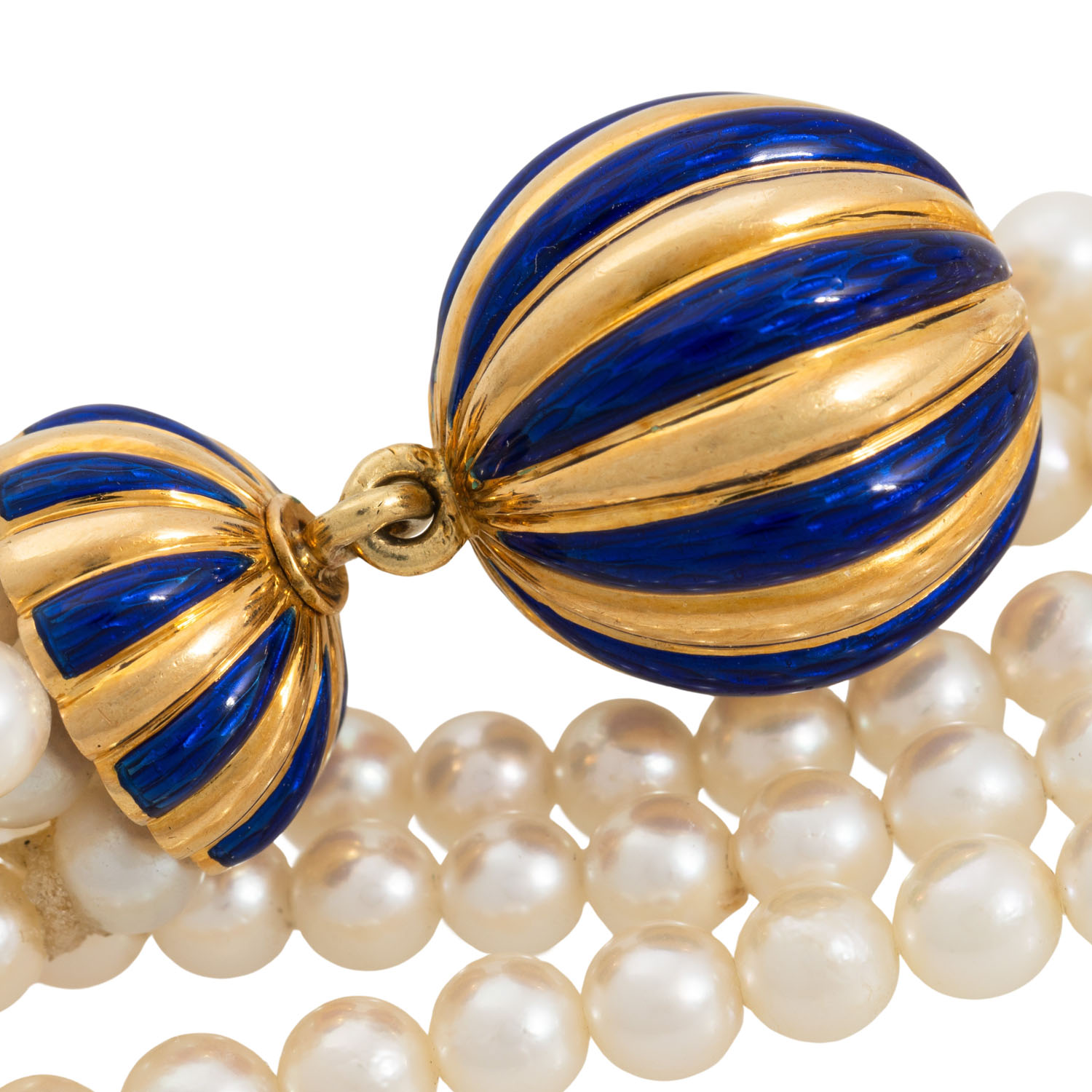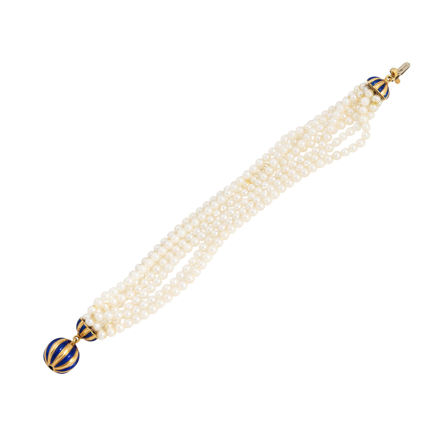 Bracelet, 7-row pearls, 296 cultured white Akoya pearls, D: ap. 4.2 mm, good lustre, ball clasp in 18K yellow gold with blue enamel, D: 16 mm, totalling 47.4 g, L: 21.5 cm, late 20th century, minor signs of wear.