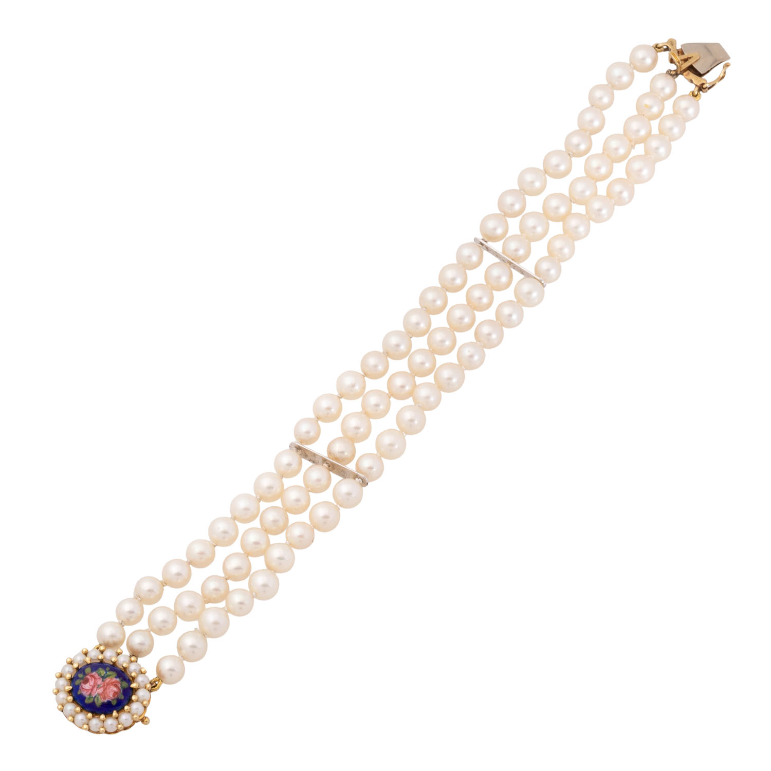 Bracelet with 81 cultured Akoya pearls, white-cream, D: ap. 5 - 5.5 mm, good lustre, box clasp 18K yellow gold, set with 16 pearls, D: ap. 2.5 mm, enamel with roses, totalling 24.2 g, L: 18 cm, pearls knoted, 2 bars, 2nd half of 20th century, minor signs of wear.