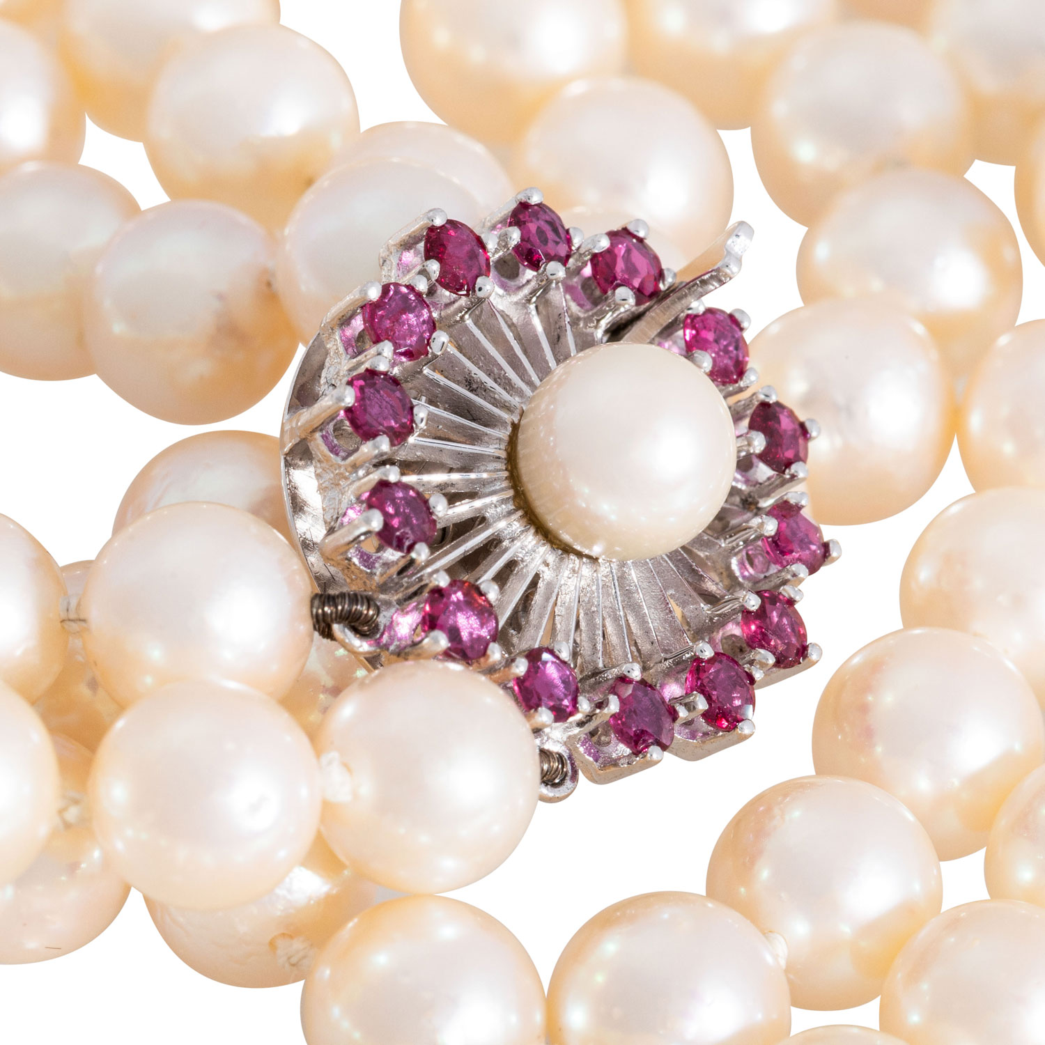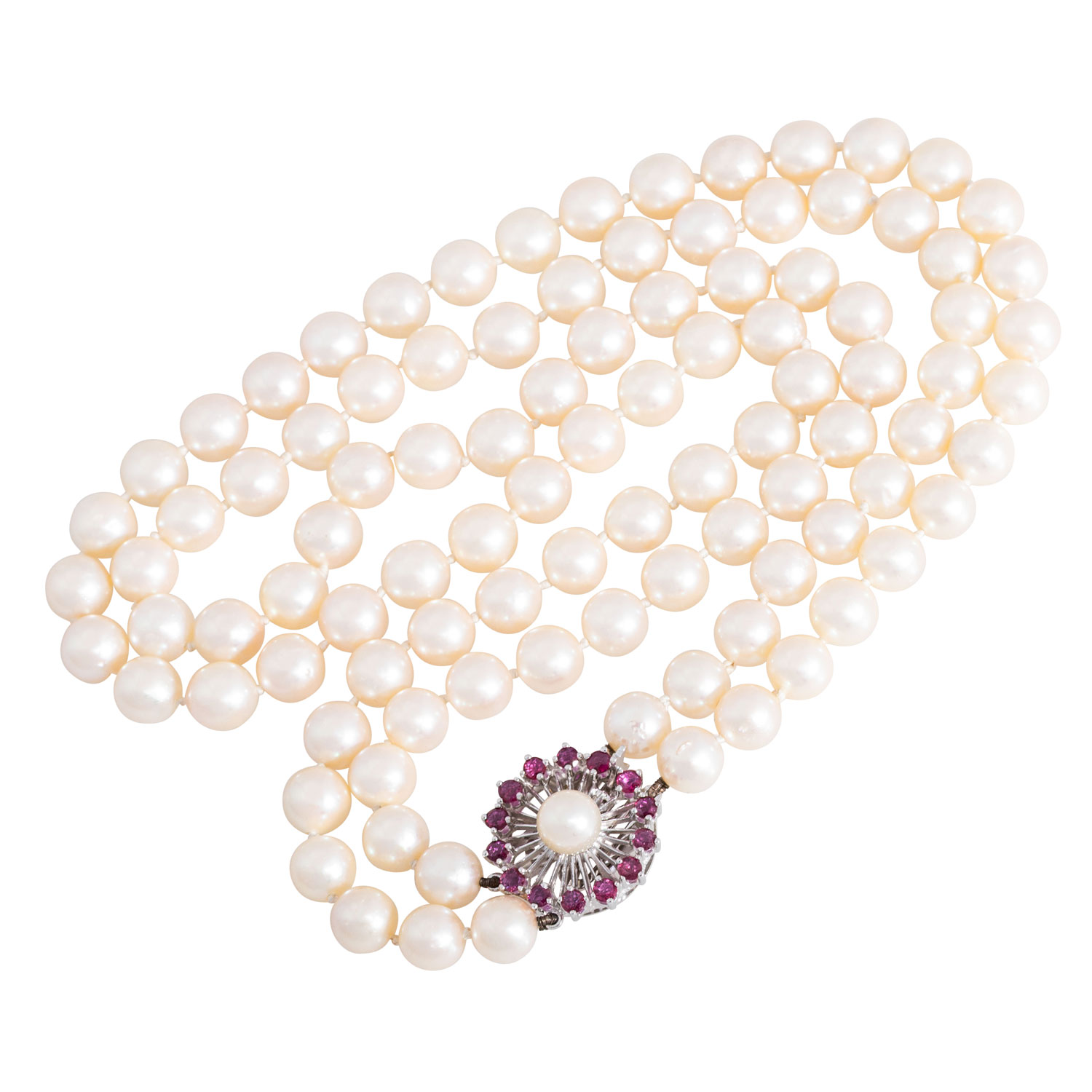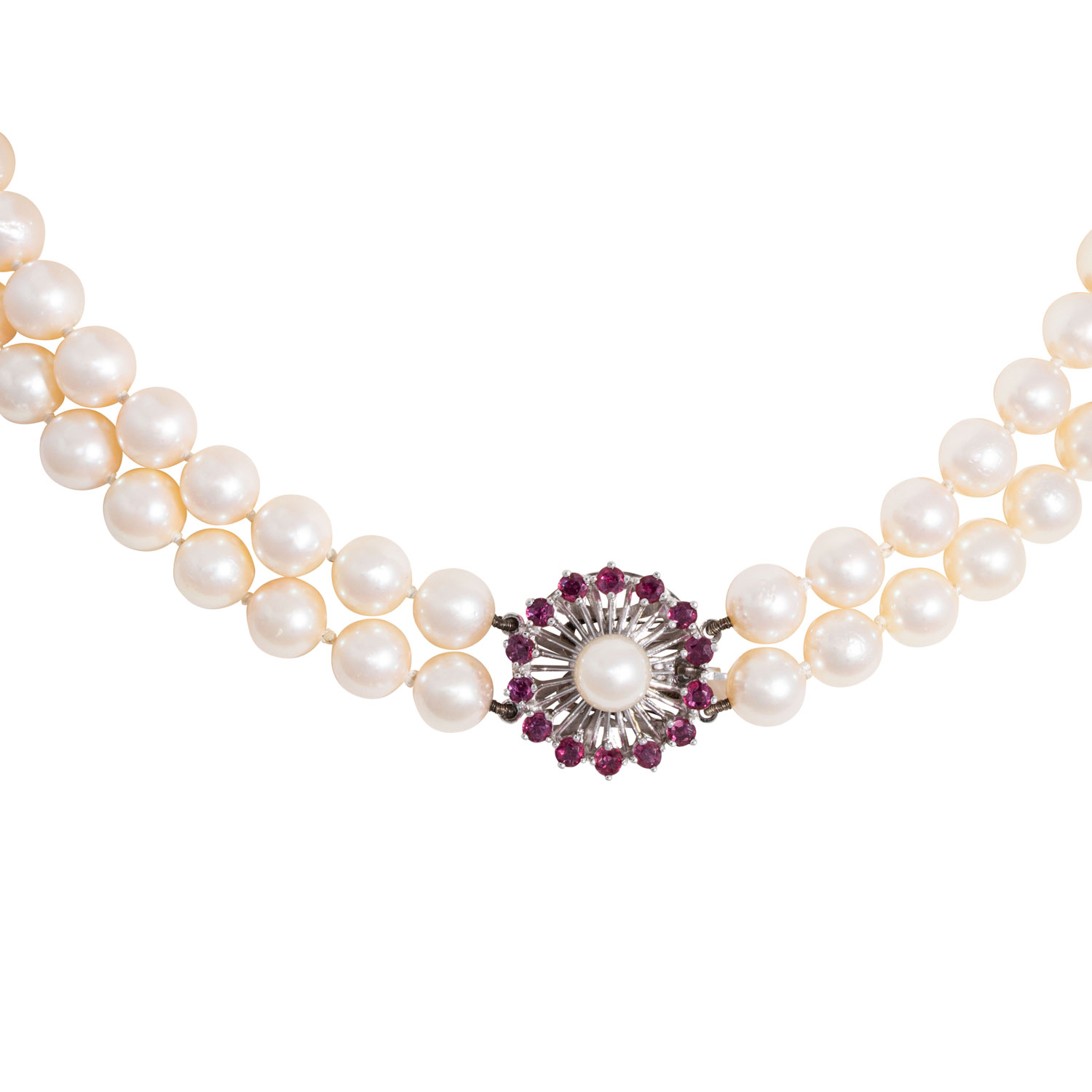 Necklace with 100 cultured Akoya pearls, 2 rows, knotted, D: ca. 7.5 - 8 mm, cream - rose, good lustre, clasp 14K white gold, 14 rubies, round fac., D: ca. 2,5 mm, 1 Akoya pearl, D: ca. 7 mm, 73 g, L: 45 cm, mid to late 20th century, minimal signs of wear.