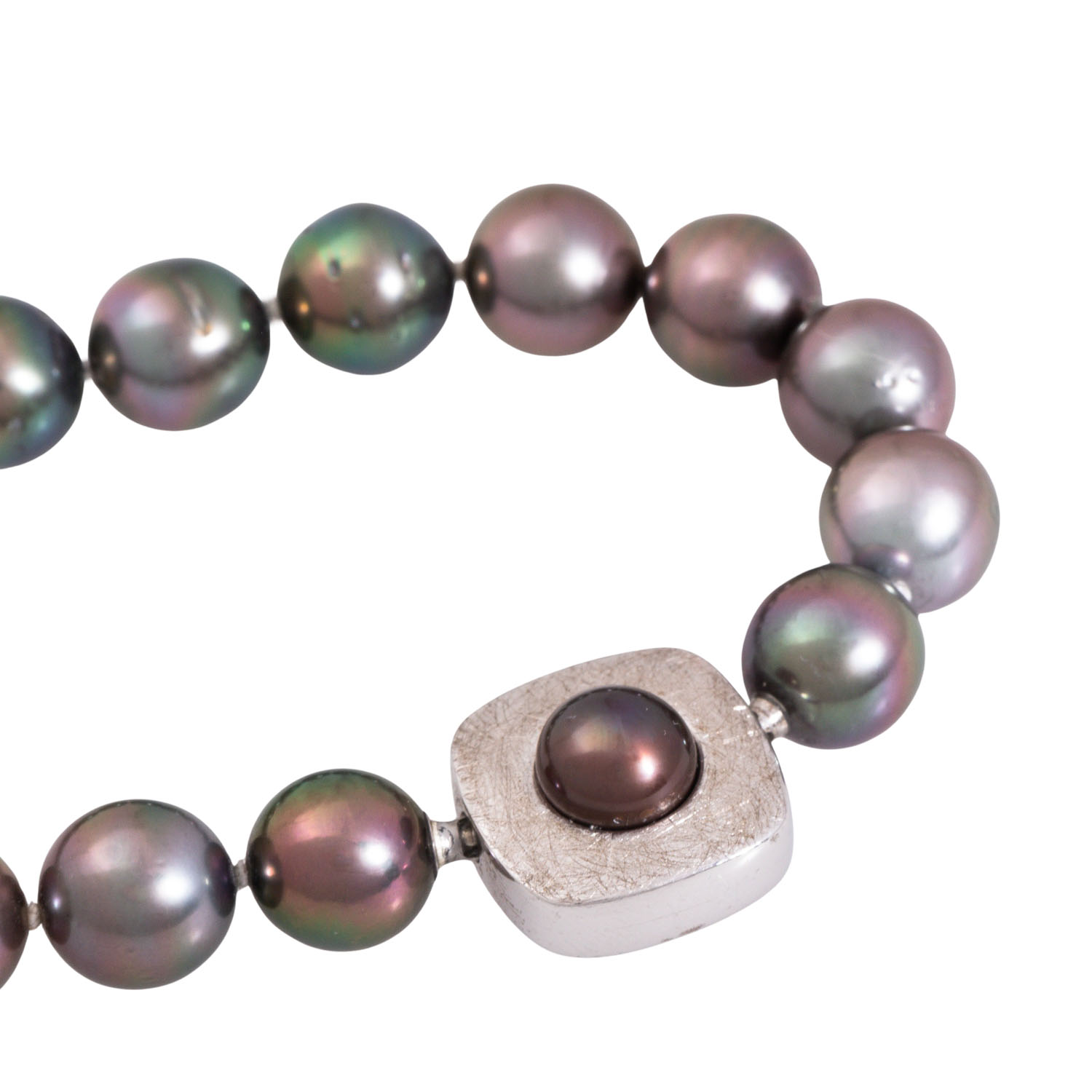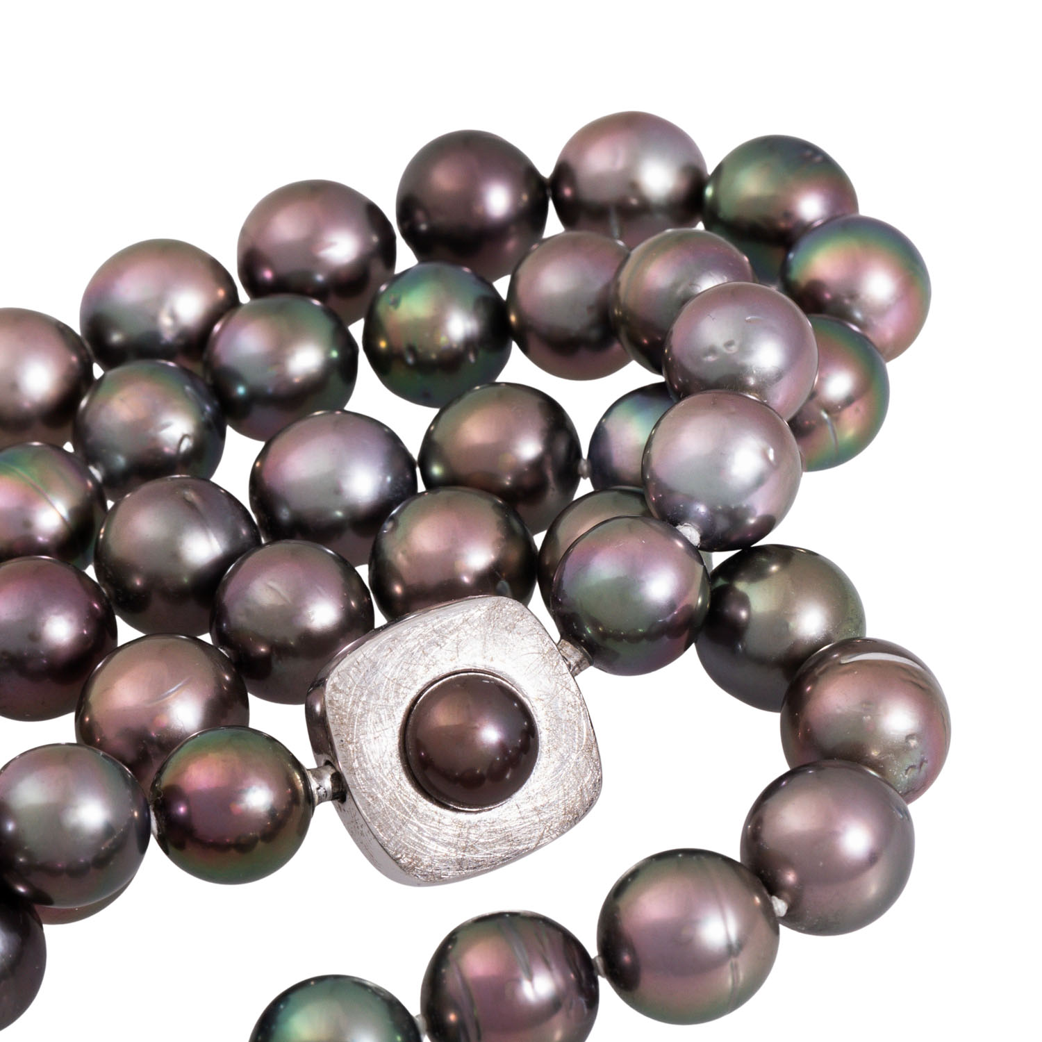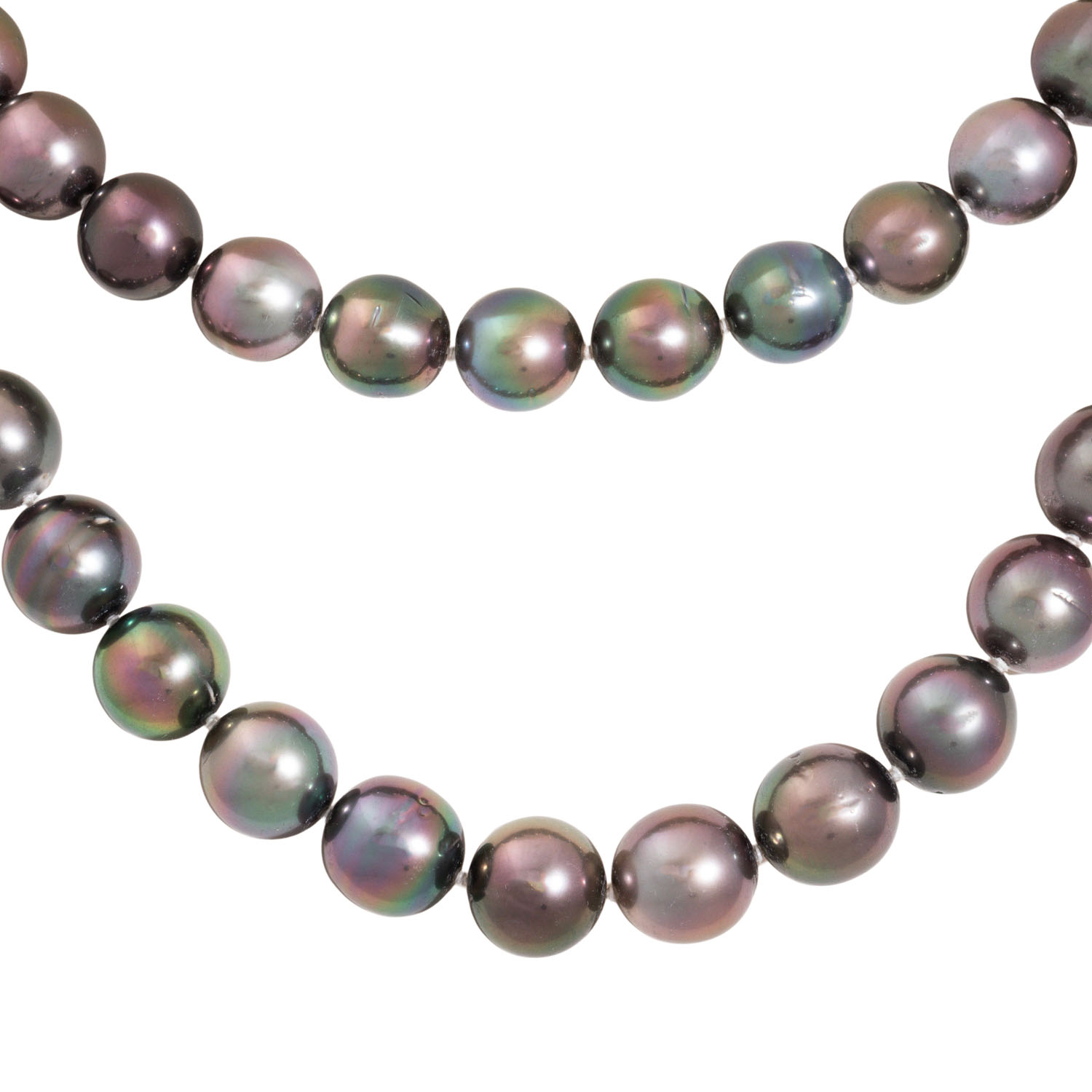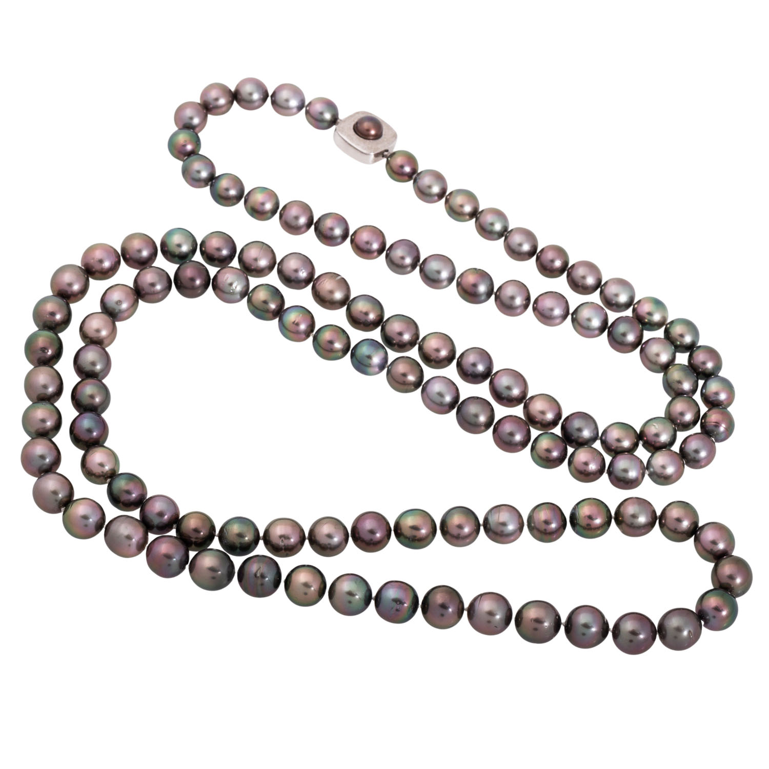 Pearl necklace with 111 Tahiti pearls, cultured pearls iridescent purple-green-gray, round, in size D: approx. 10 - 11.8 mm, beautiful luster, with natural signs of growth, 213.9 g, L: approx. 133.5 cm, knotted through, bayonet clasp in 925 silver, satin finished, with hallmark 'SRS', end of 20th century, minor signs of wear.