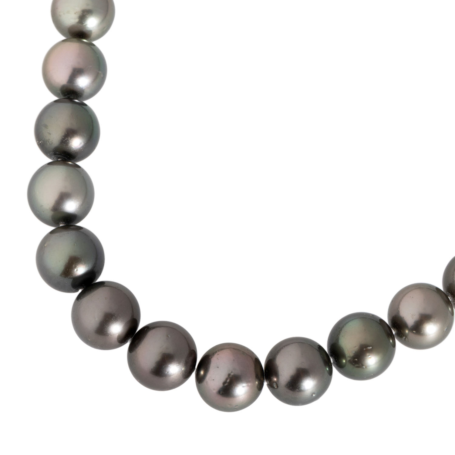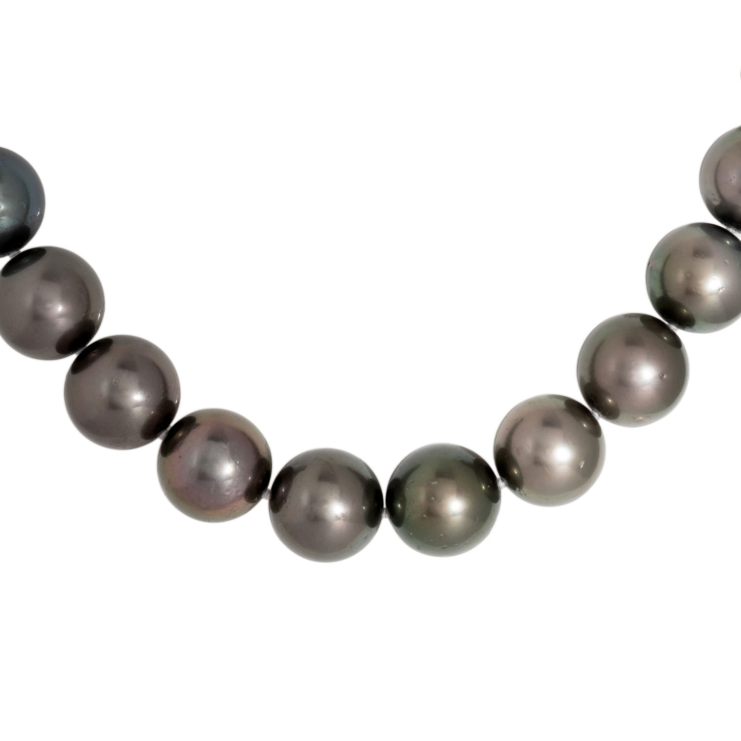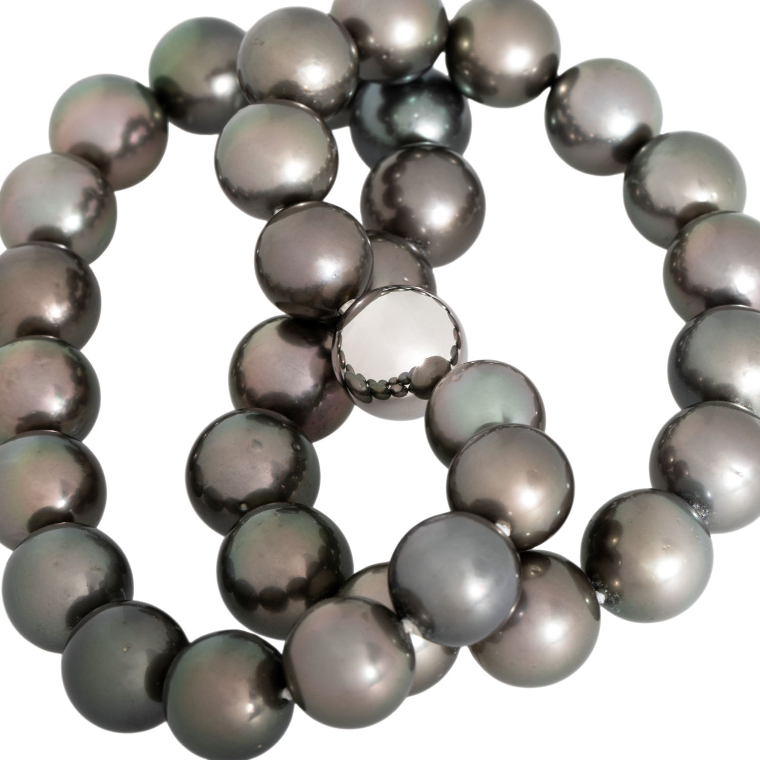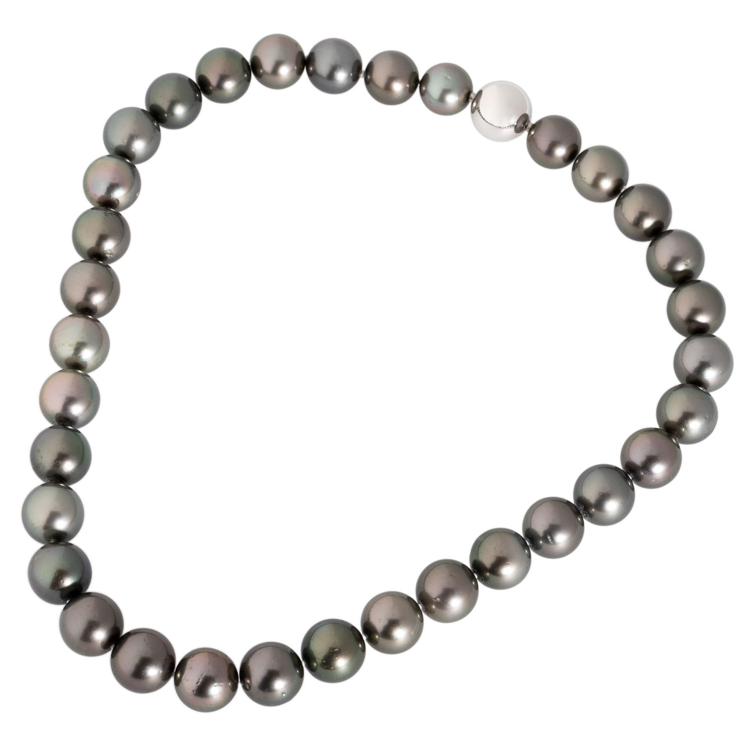 Necklace with 33 black Tahiti pearsl, D: 14,5 mm, very good lustre, Ball clasp with bayonet catch, 18K white gold, D: 16 mm, totalling 147,7 g, L: 50 cm, 21st century, minimal signs of wear, accessories: JACOBI jewelry expertise.