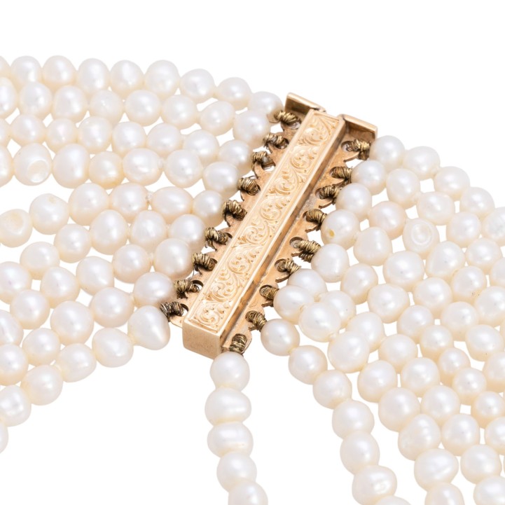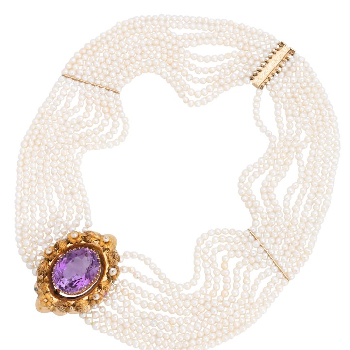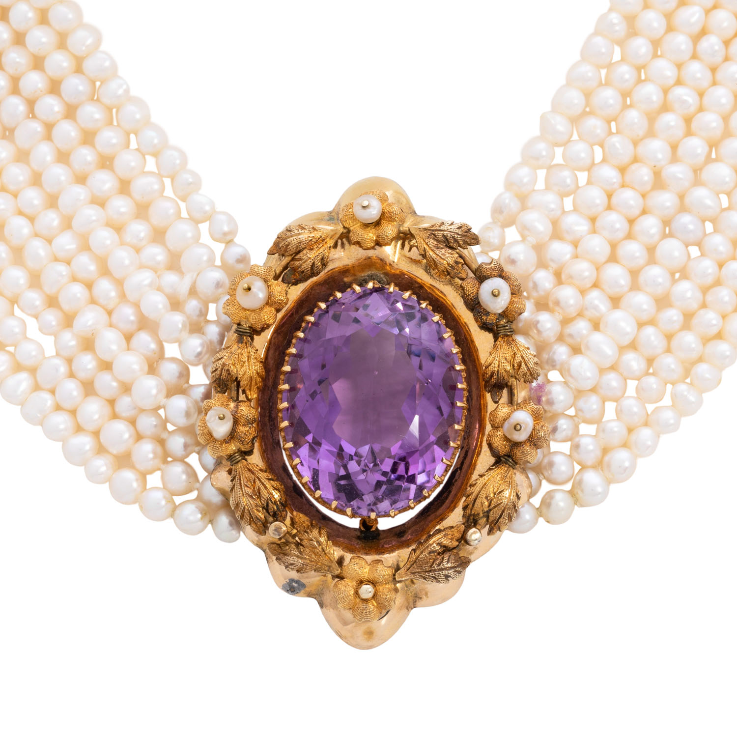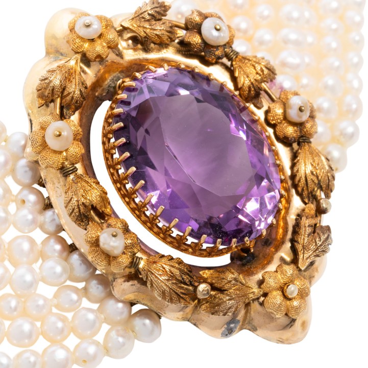9-row necklace of Fresh Water cultured pearls 4x3 mm, L: 42 cm with antique jewel parts, of which centred former pendant/medaillon of 8K yellow gold, fire gilded with amethyst and natural pearls, bars and clasp of 14K yellow gold, floral decorations, 19th/20th/21st century, good condition.