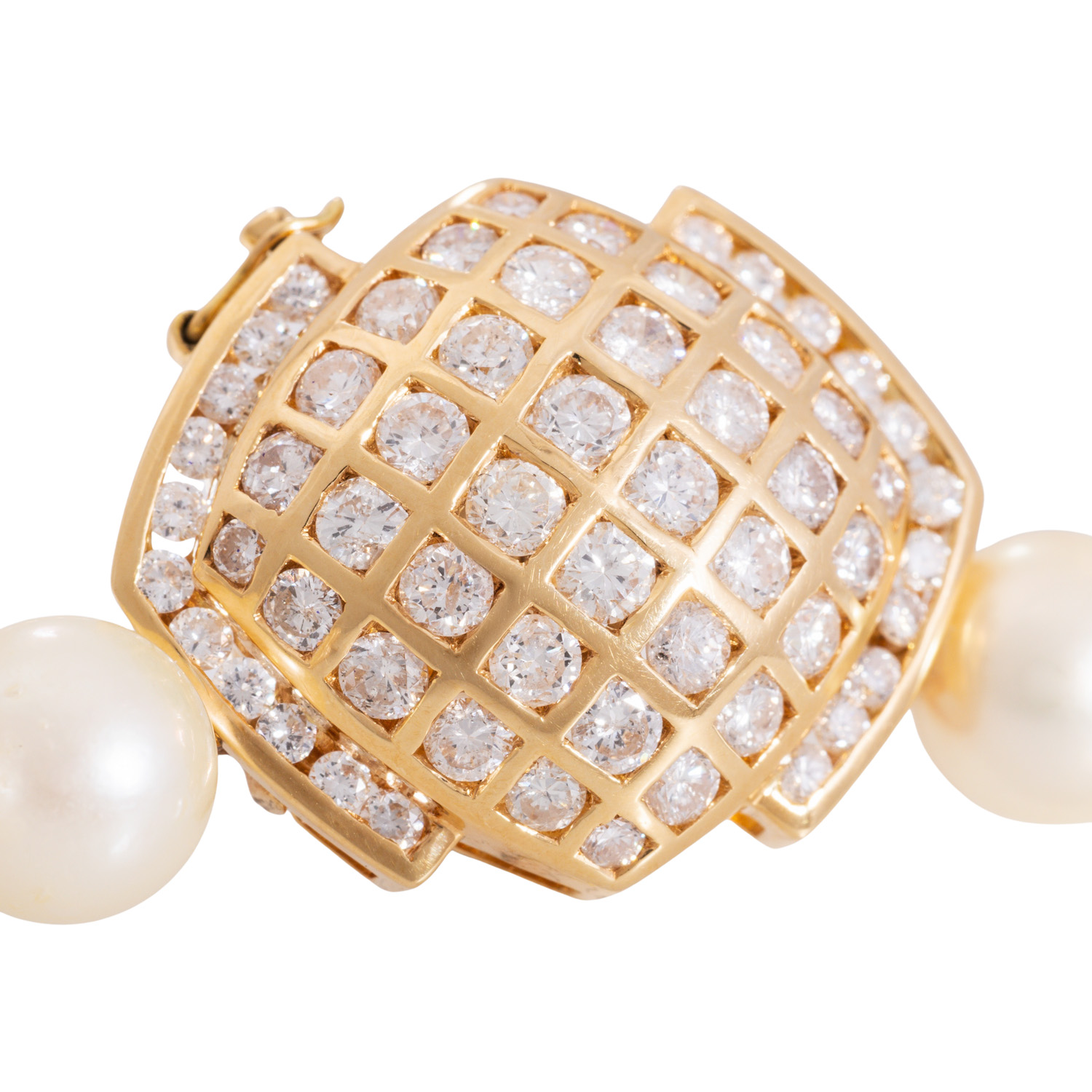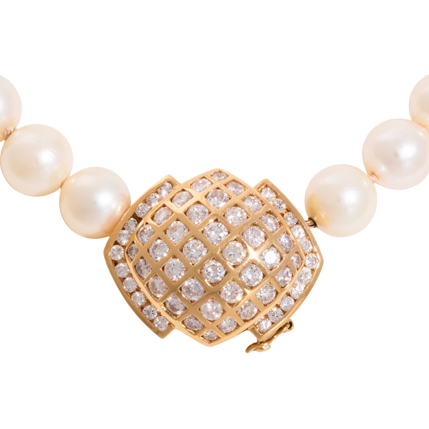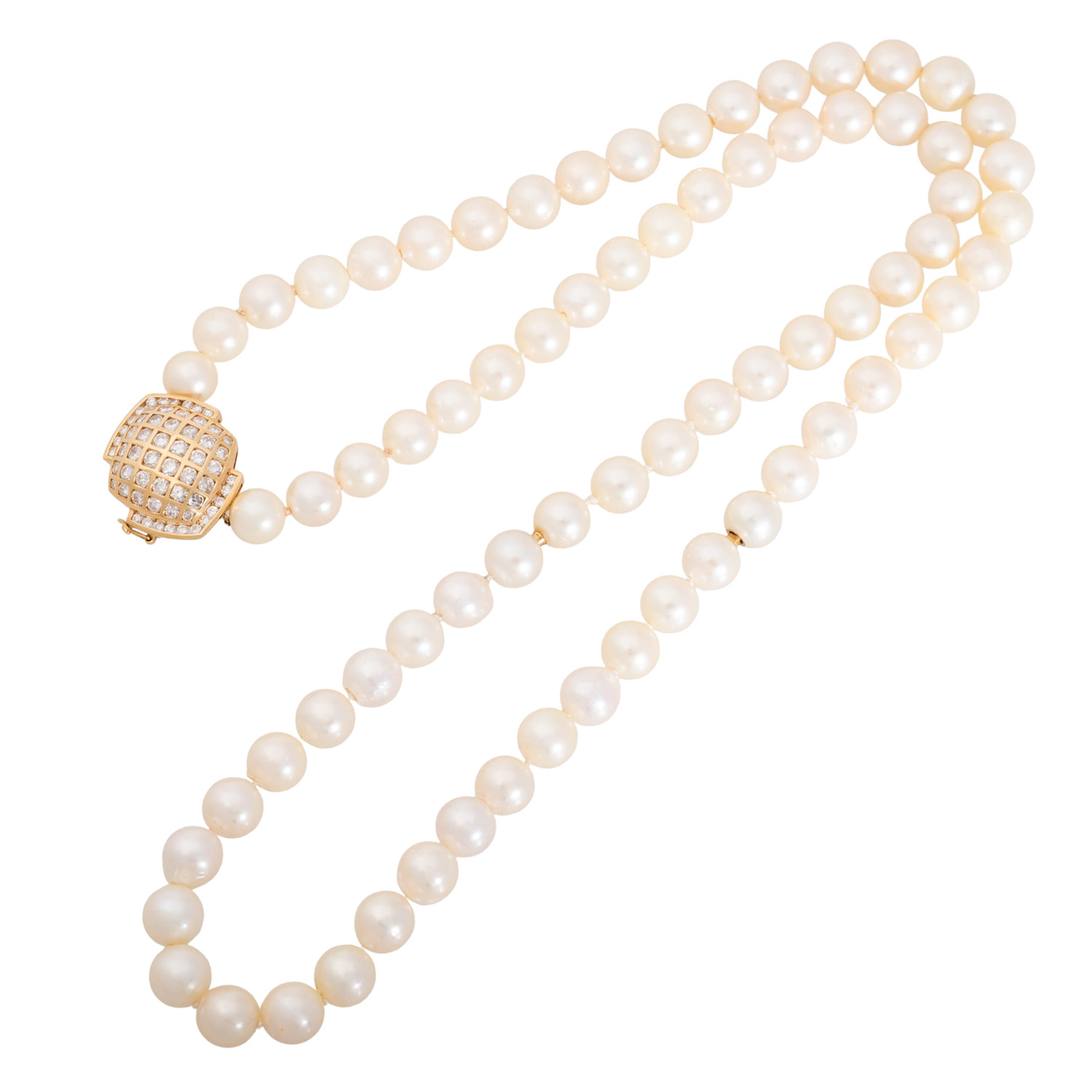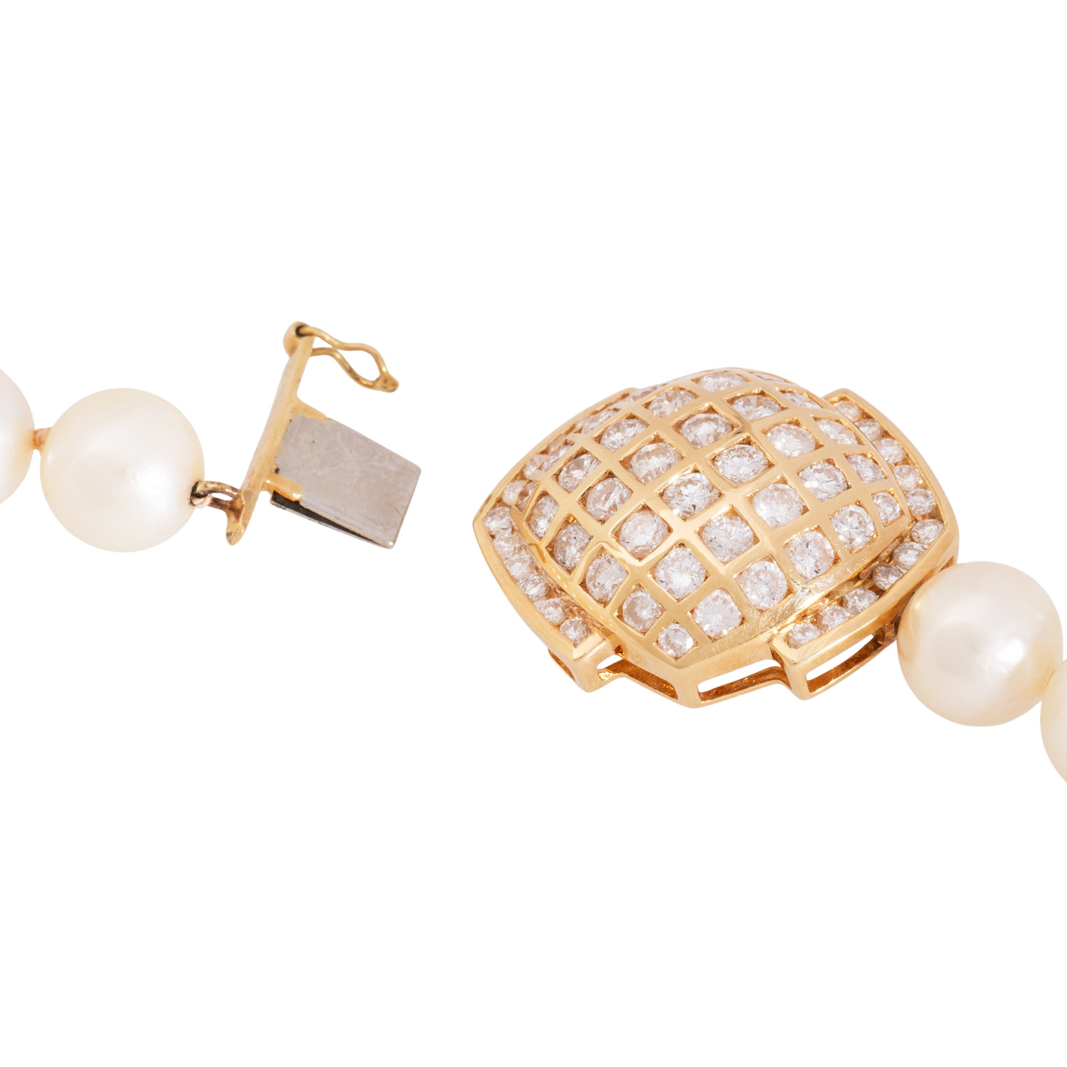 Pearl necklace with brilliant clasp, 74 cultured pearls in cream- and rose- white, D: approx. 8.9 mm, partly baroque perls, with natural signs of growth, beautiful to fine luster, brilliant clasp: with 58 brilliant-cut diamonds totalling approx. 2.29 ct, WHITE (H)/SI-P, 18K yellow gold, L x W: approx. 25.6 x 20.5 mm, total Weight 81 g, L: approx. 50-71 cm, 20./21. century, signs of wear, with hallmark. Nacklace can be shortened by 21 cm and using as a bracelet with the bayonet technique.