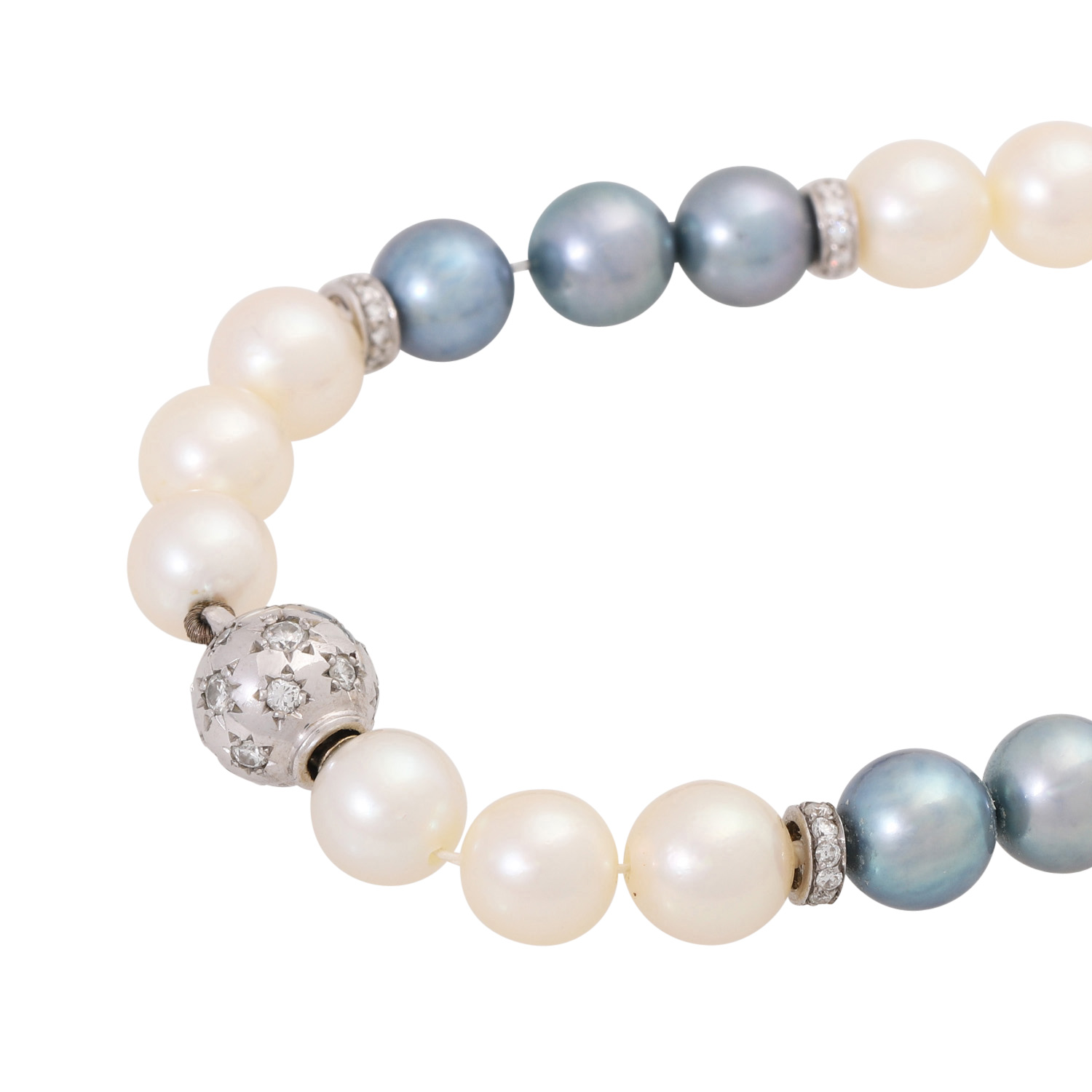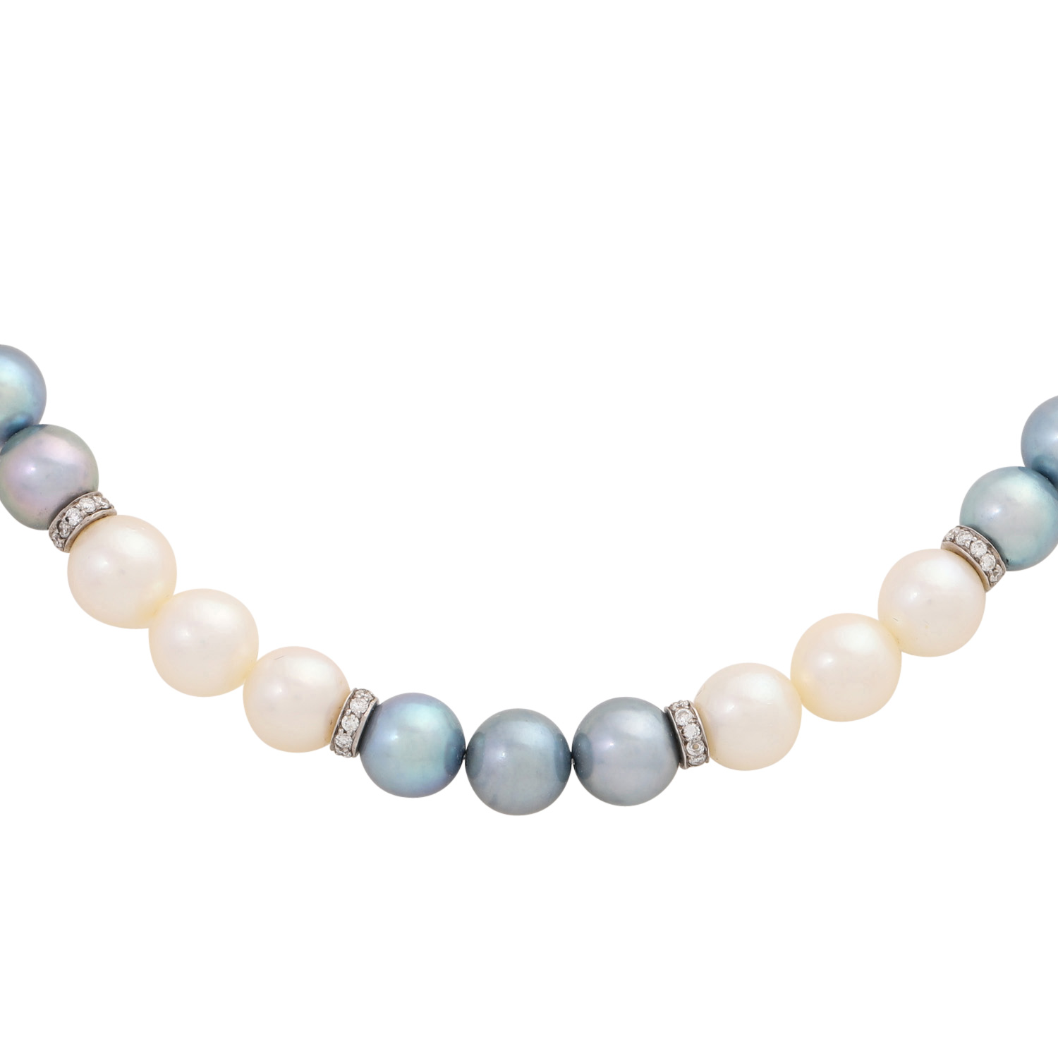 Necklace made of white and grey akoya cultured pearls (dyed), d.: 7 - 7.5 mm, decorative elements set with brilliant-cut diamonds totalling ca. 2.0 ct, WHITE - TIW (H-L)/SI-P2, ball-shaped bayonet clasp, 18K WG, total weight: 39.4 g, l.: 46.5 cm, 20th/21st century, very good condition.