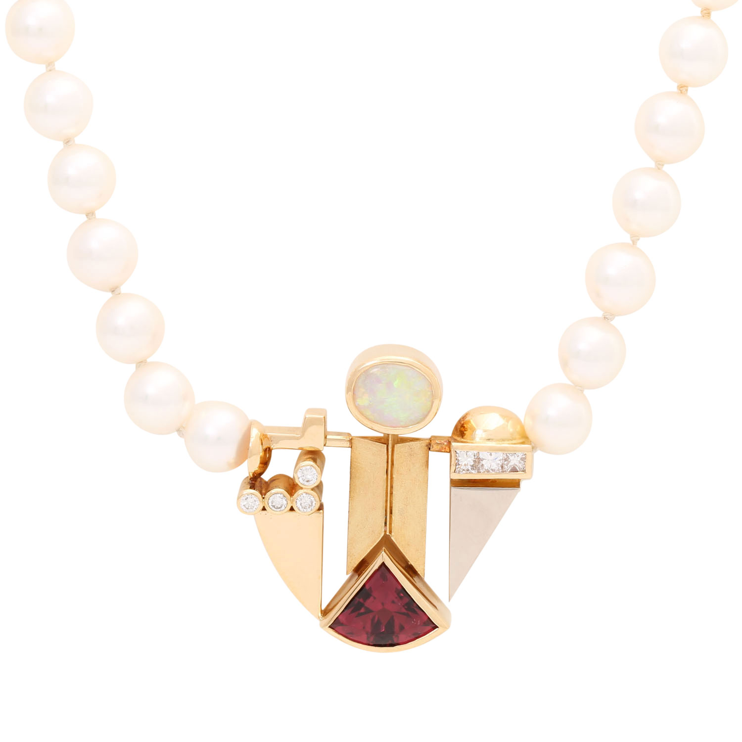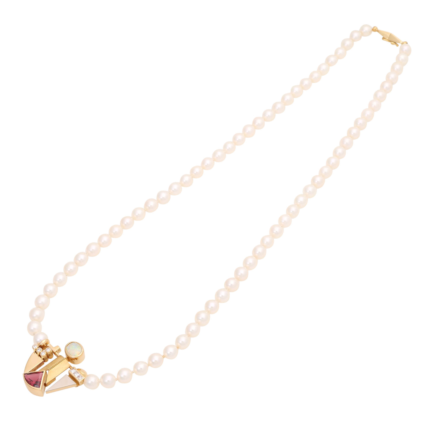Necklace made of white akoya cultured pearls, D: c. 6.5 - 7 mm, fine luster, centerpiece set with pink fac. tourmaline, opal and diamonds of different cuts, totall. c. 0.30 ct, good colour and clarity, YG 18K, totall. 45.0 g, l.: 58 cm, 20th/21st century, tourmalin clearly abraded.