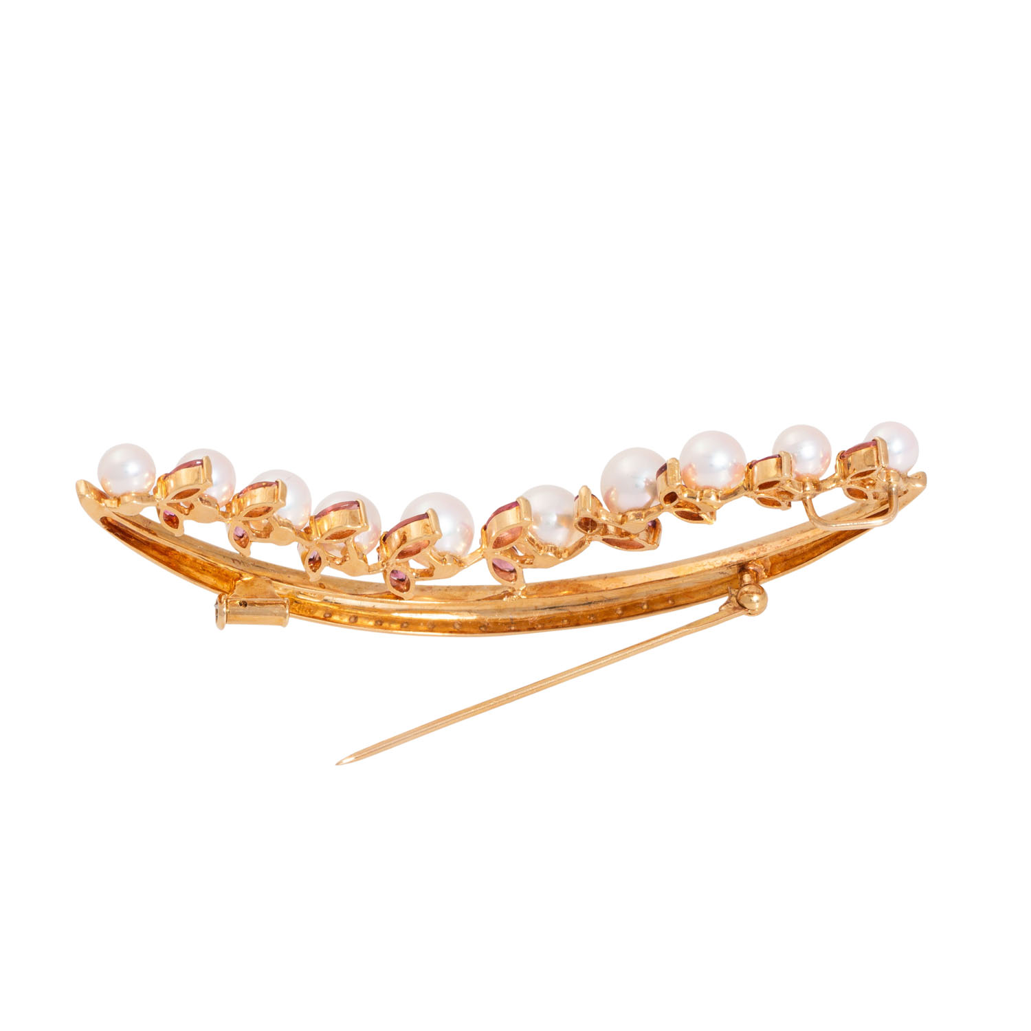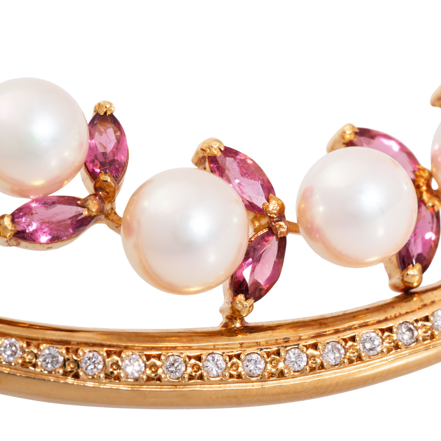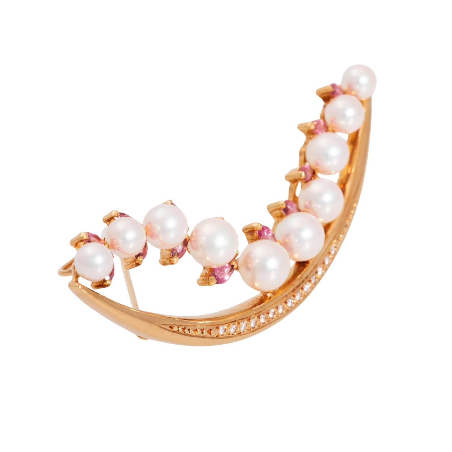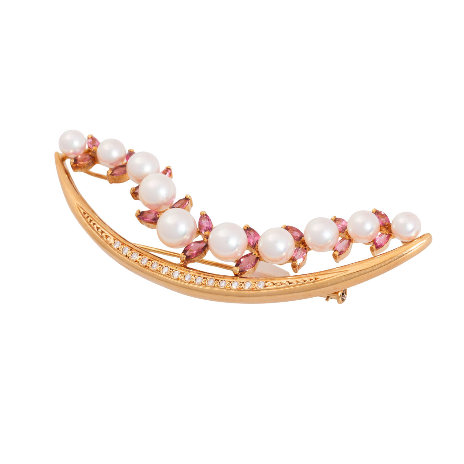 Pendant / Brooch with 10 Akoya pearls, 18 pink sapphires and 14 brilliant-cut diamonds totalling approx. 0.12 ct (marked), approx. RW-WHITE (G-H)/SI, Akoya cultured pearls D: approx. 4.8 - 6.7 mm , very fine luster, round, rose-white, pink sapphires totalling approx. 2.16 ct, faceted navette-cut, yellow gold 18K, 14.2g, L: approx. 7.2 cm, W: approx. 1.4 - 1.8 cm, 21st century, minimal signs of wear.