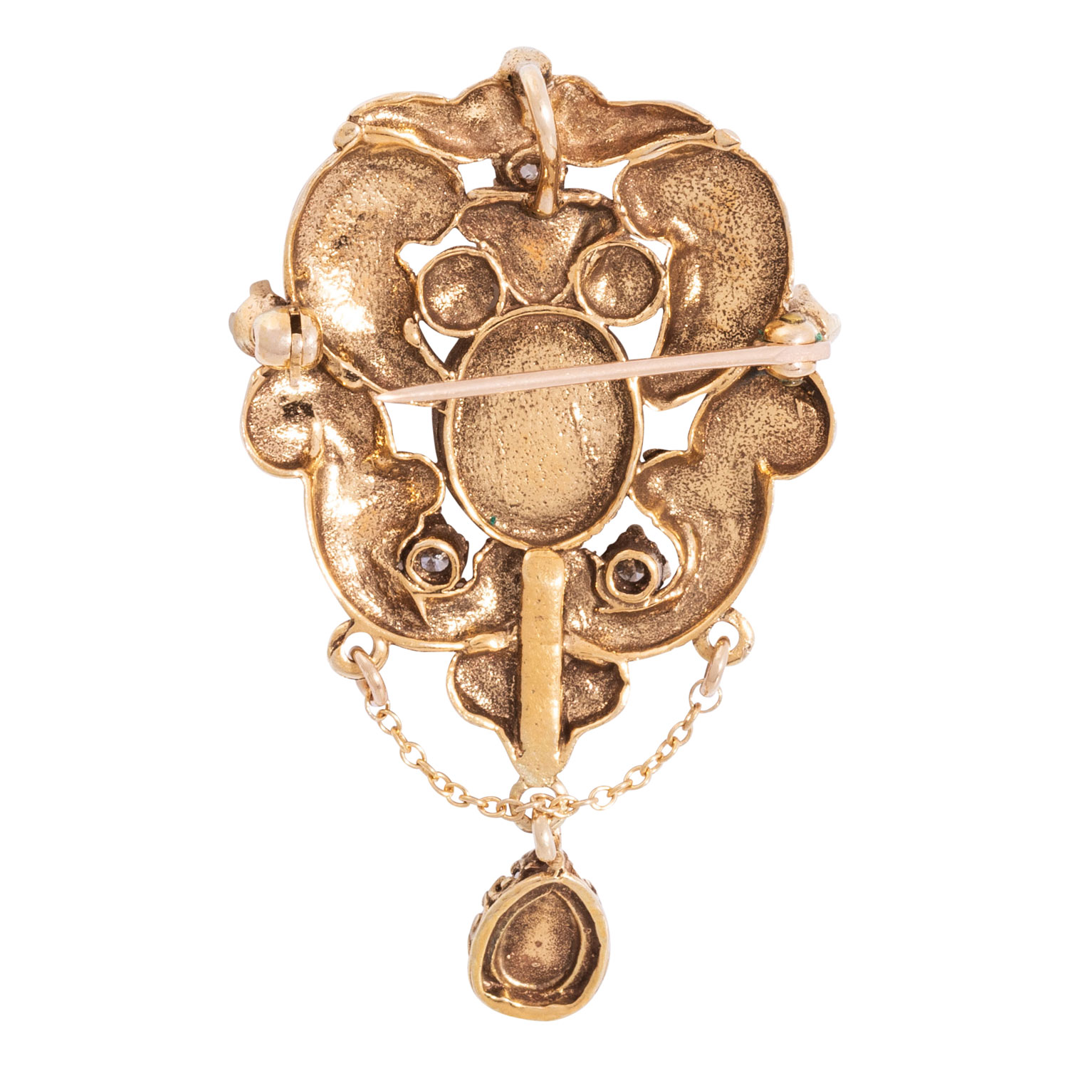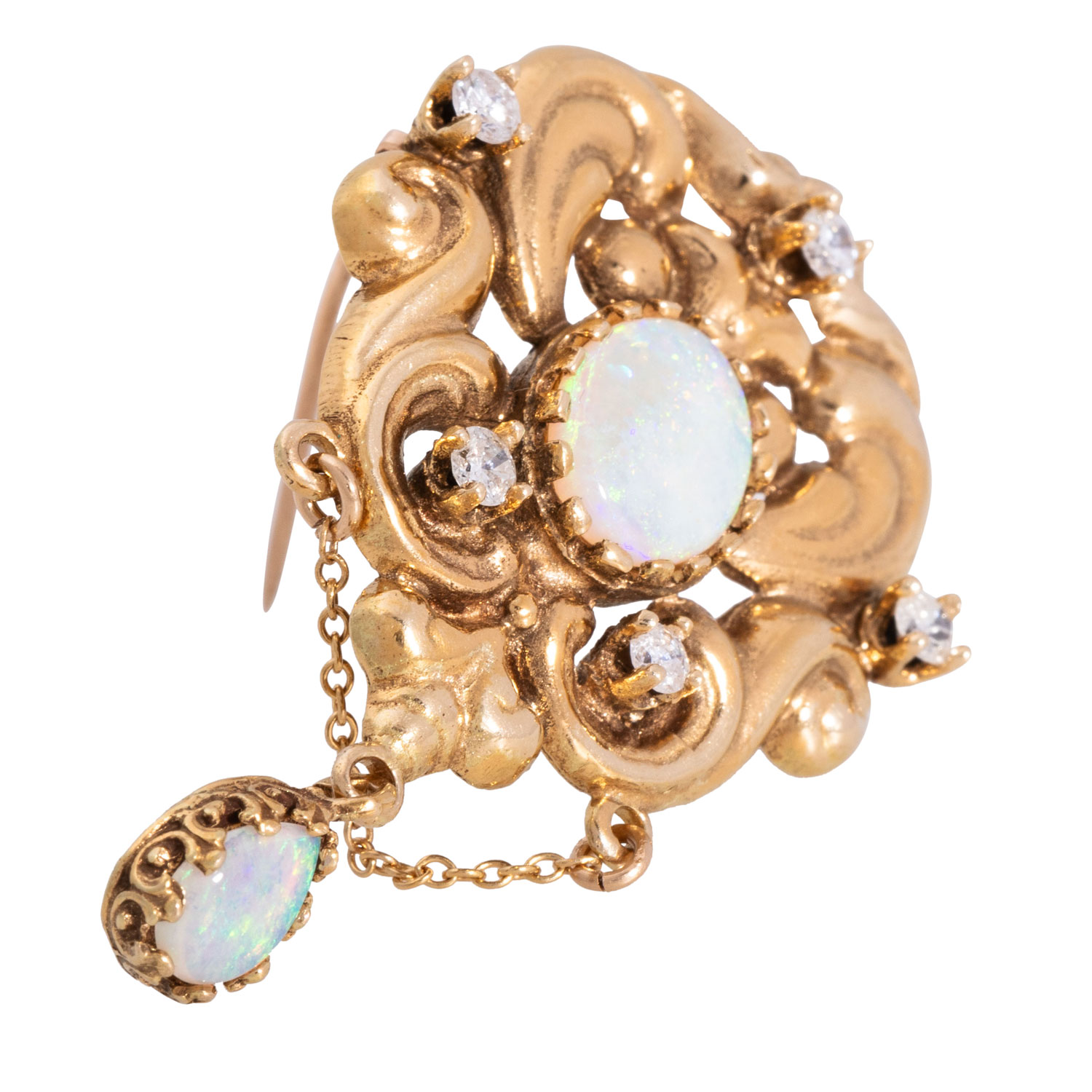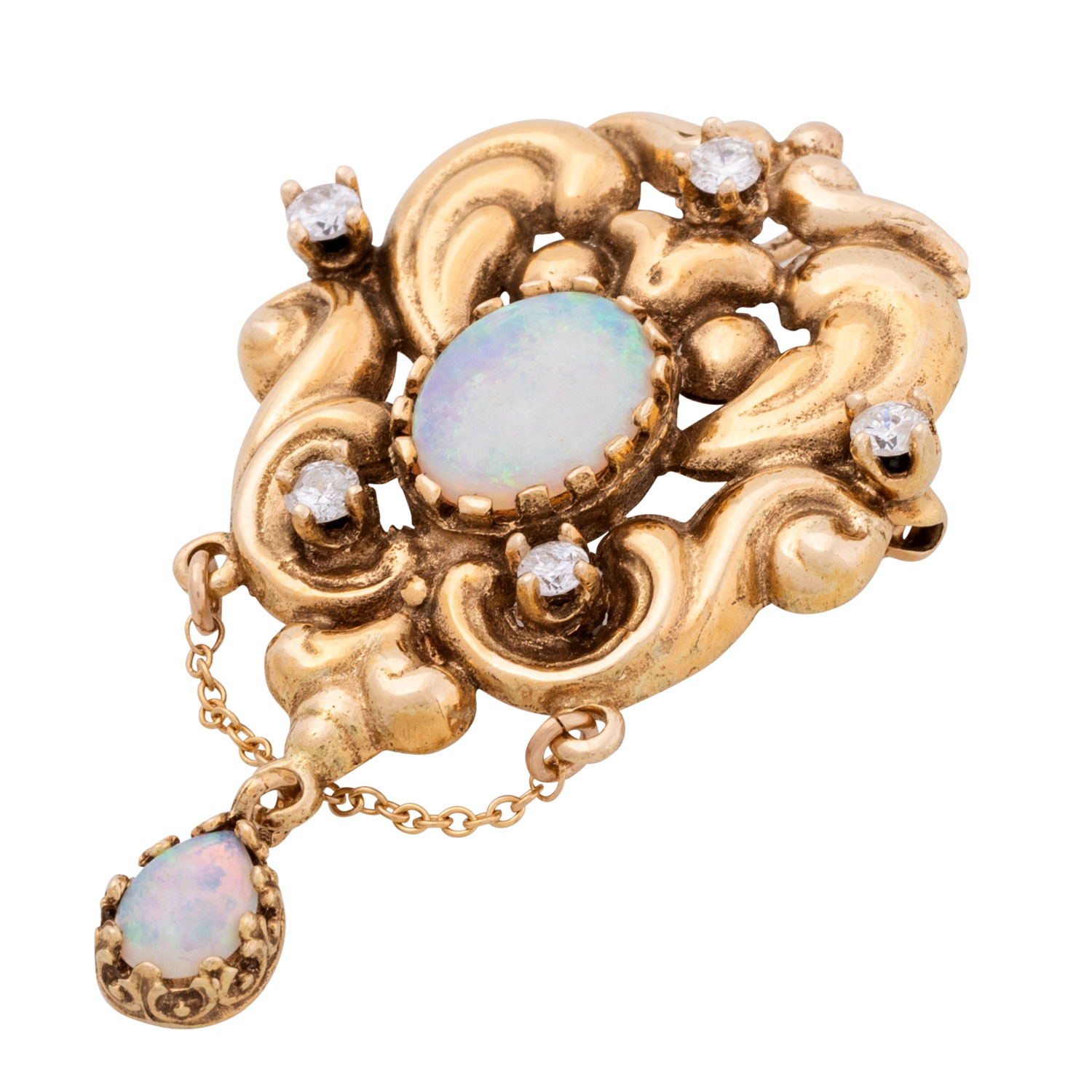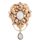 Pendant/brooch with 2 opals and 5 small brilliant-cut diamonds totalling ca. 0.35 ct, low colour and clarity, opals with orang-green colours, 14K yellow gold, 8 g, 4.5x2.8 cm, 20th/21st century, minor signs of wear.
