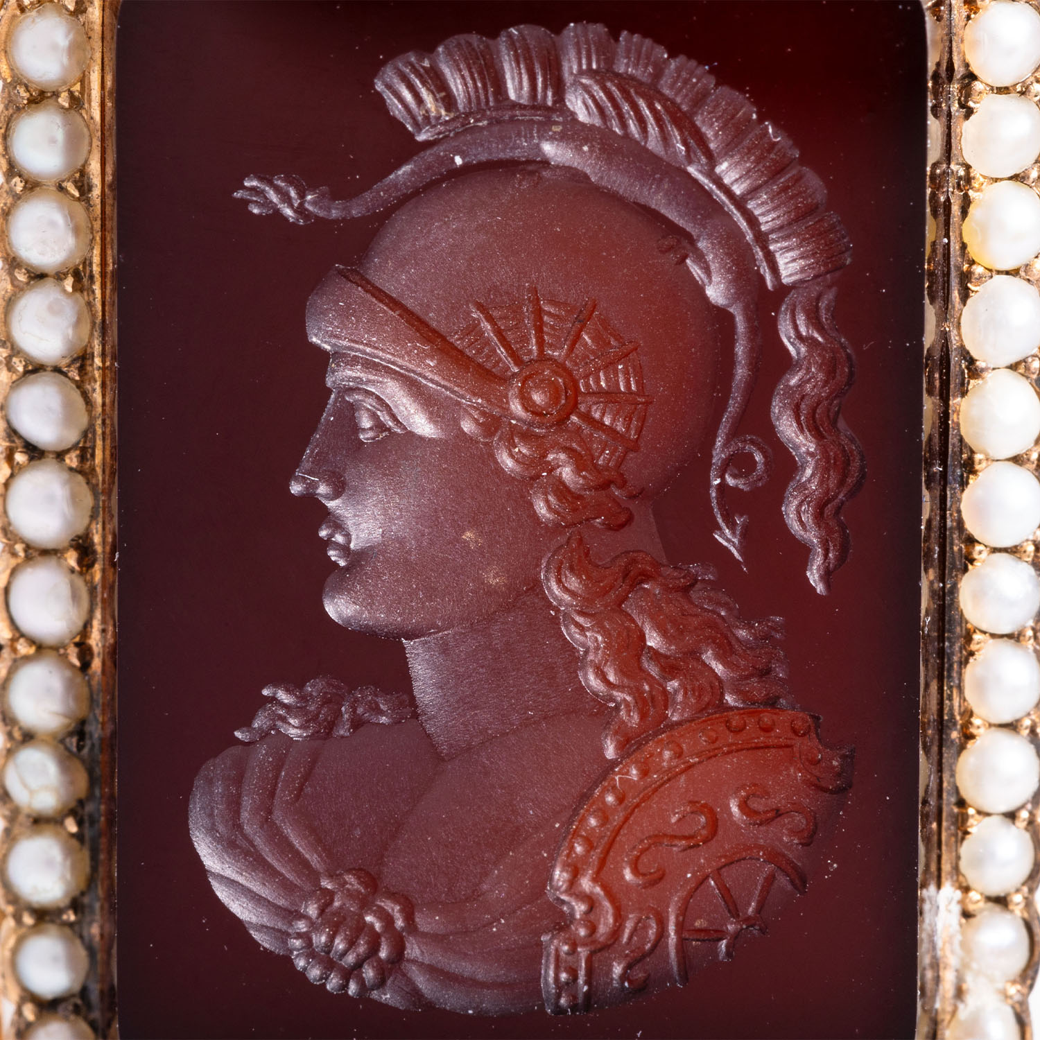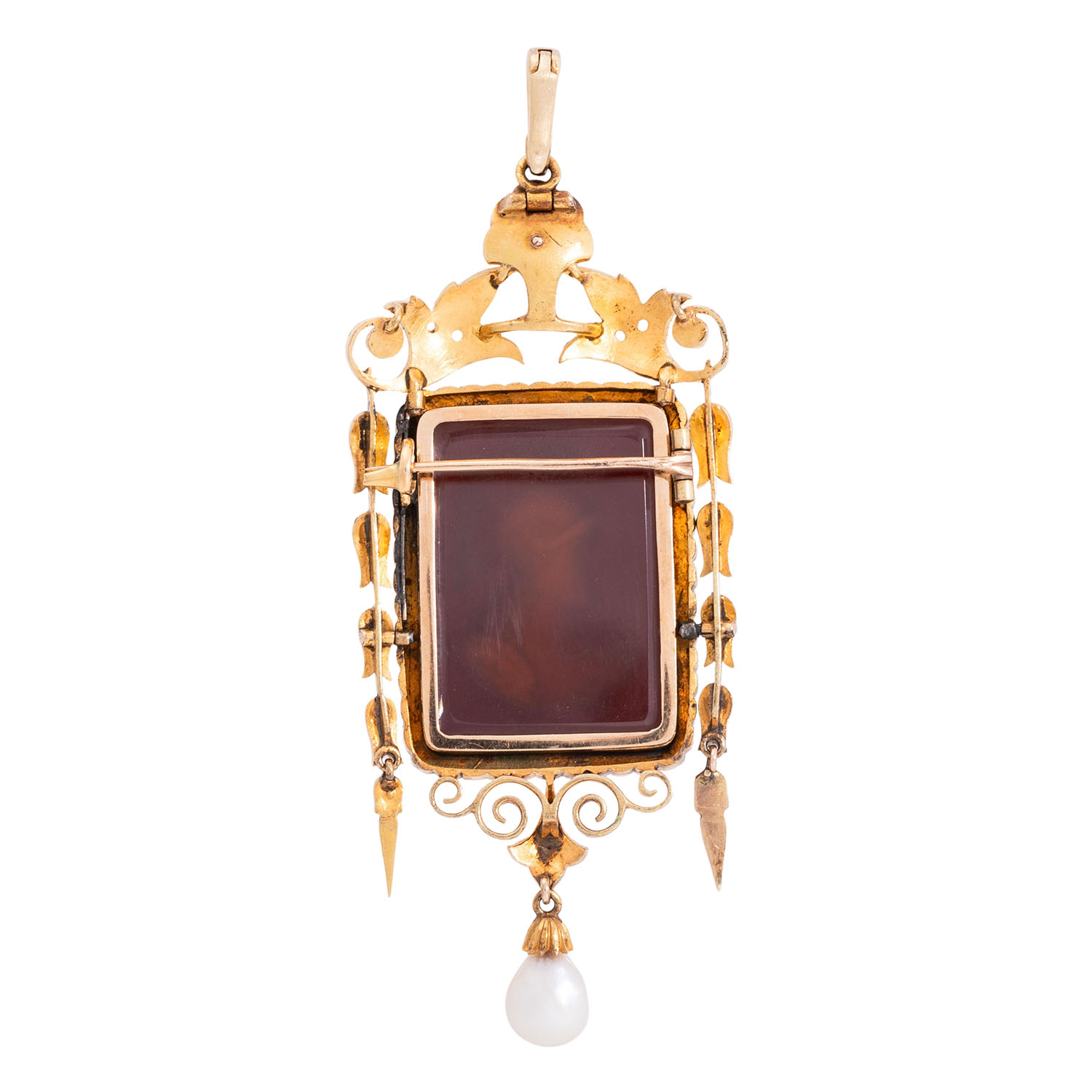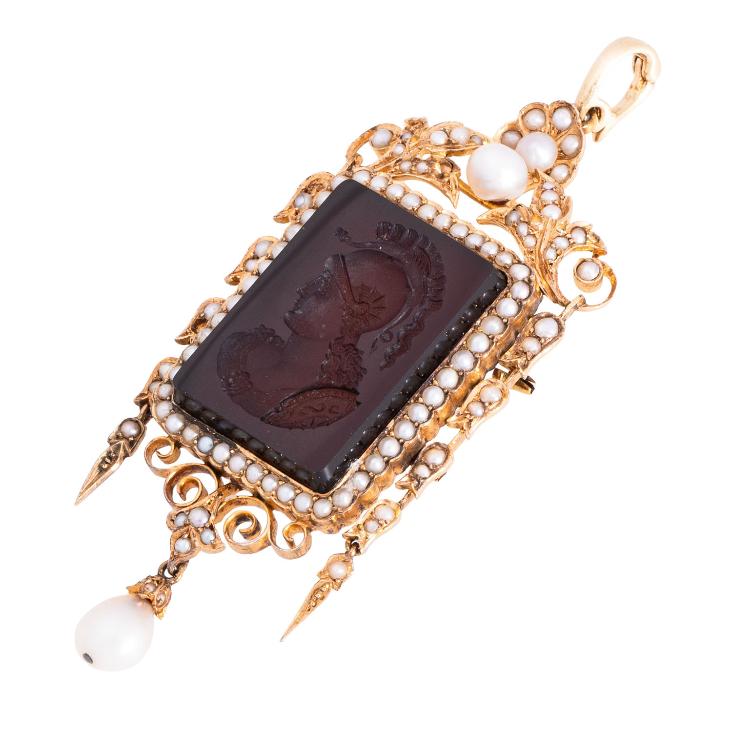 Pendant/brooch with carnelian emblem, framed and decorated with pearls,