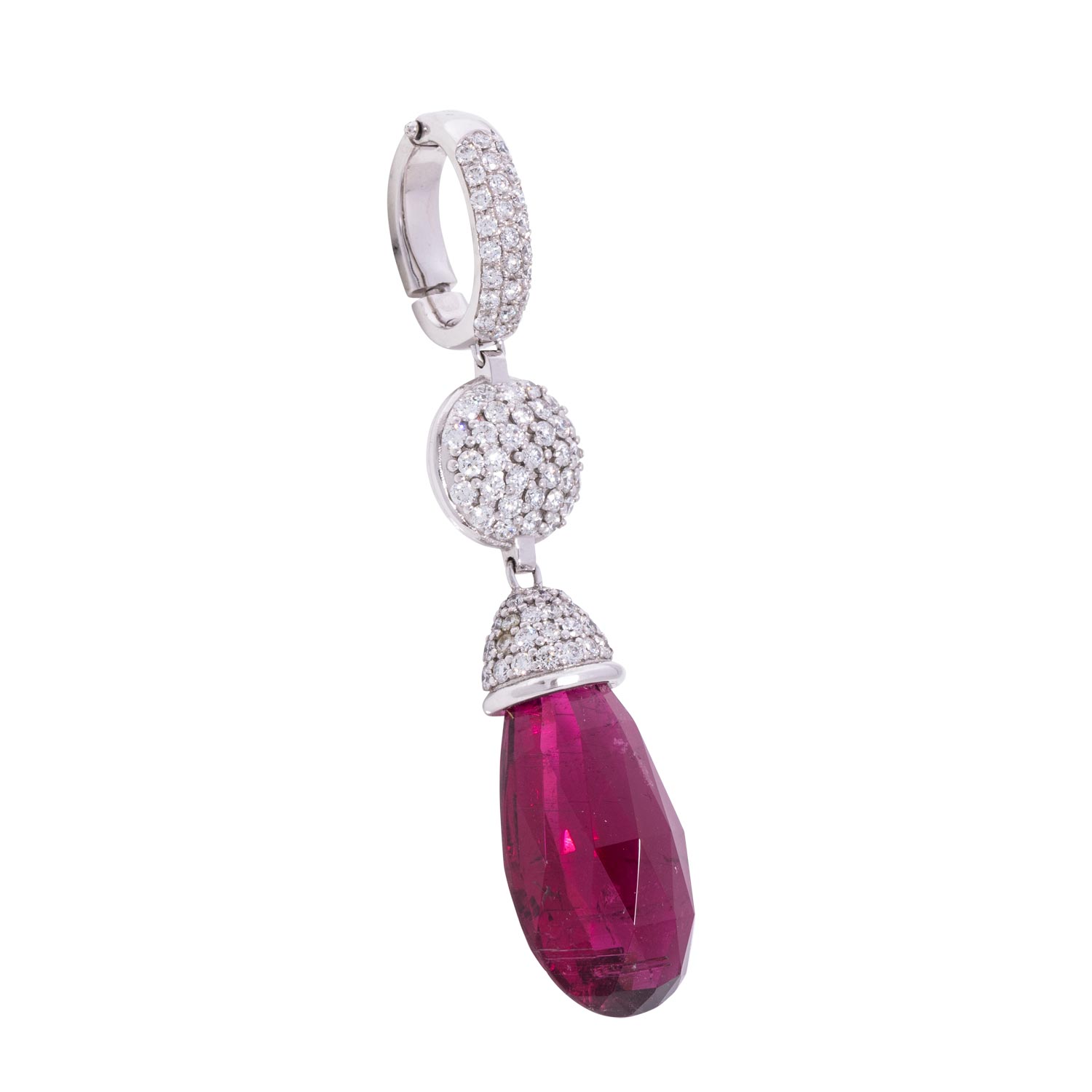 Pendant, set with 1 fine rubellite briolett 16,66 cts. a 92 brill cut diam. tot. 1,14 cts. RIVER D/VSI. WG 18 K/PT, 12,13 g. High quality craftsmenship.