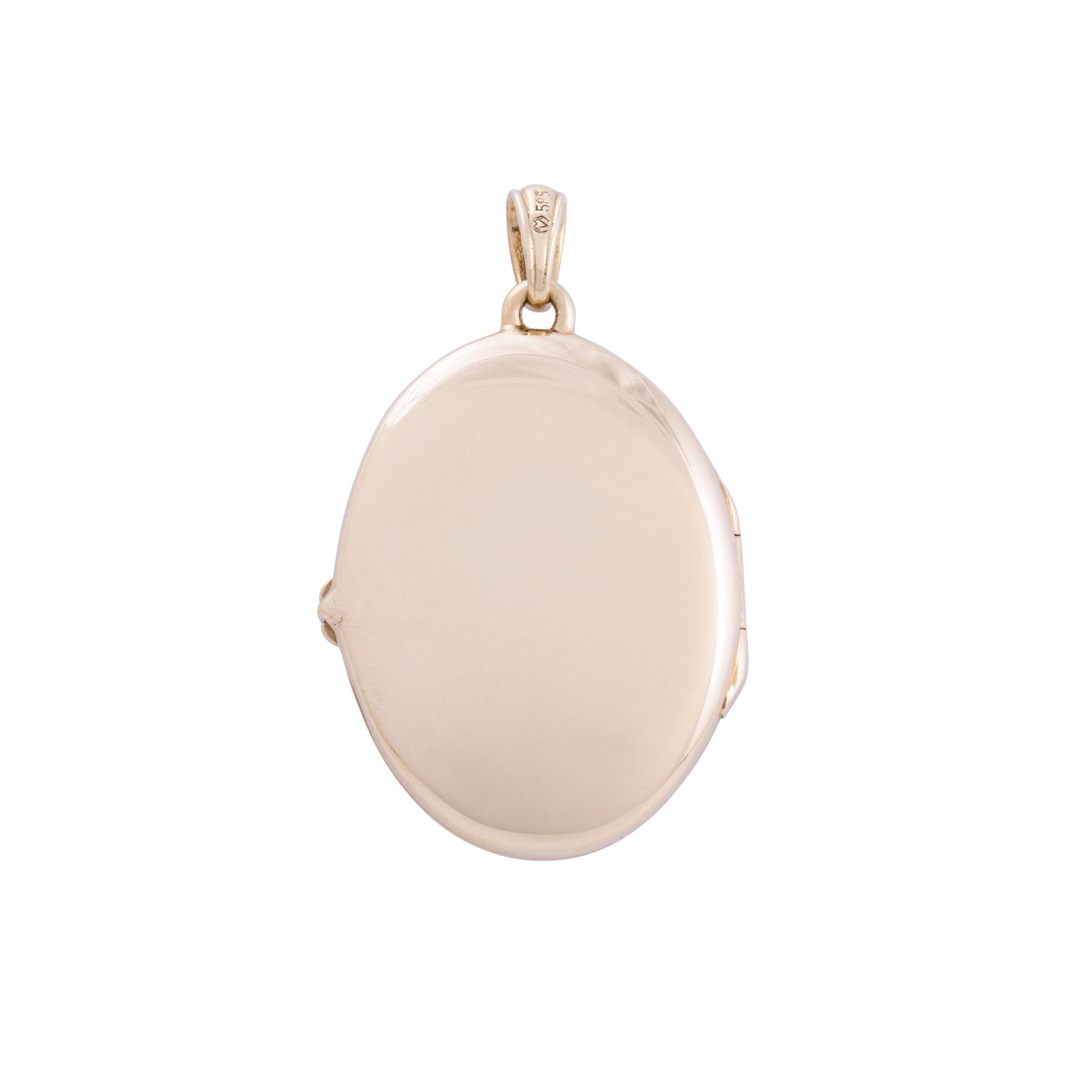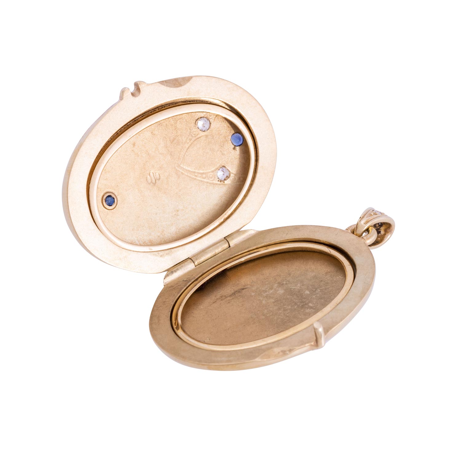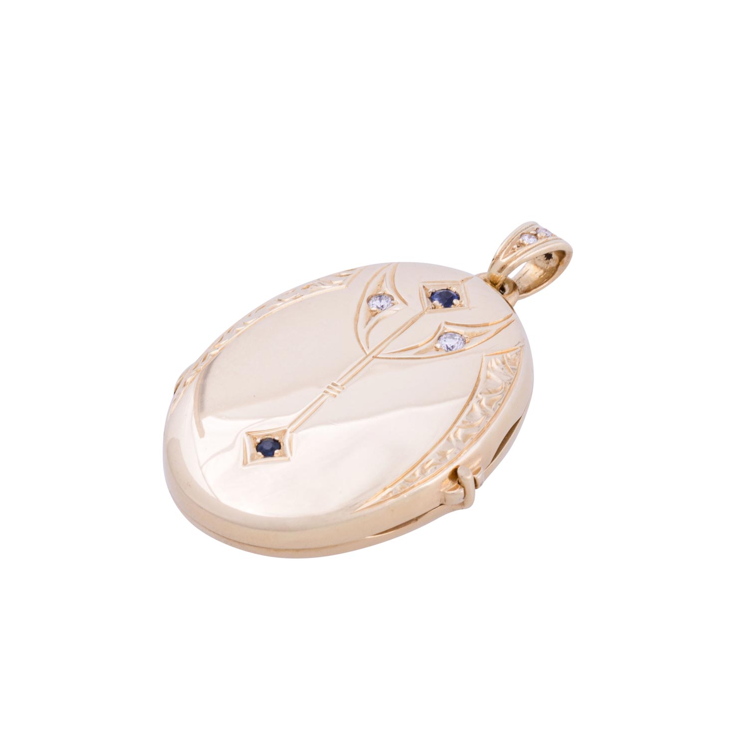 Pendant/Locket, oval, 5 brilliant cut diamonds, totalling ap. 0.08 ct, good colour and clarity, 2 sapphires, round faceted, D: ap. 1.7 mm, 14K yellow gold, 14.8 g, L x W: 40 x 28 mm, 2 picture insert frames, late 20th century, minimal signs of wear.