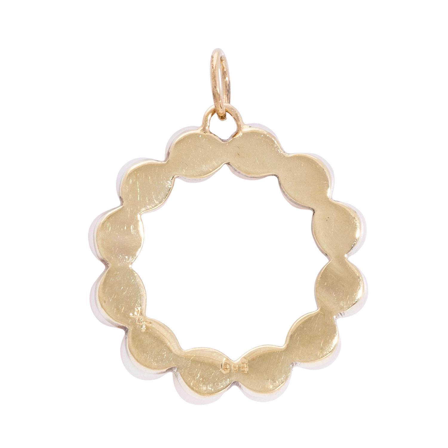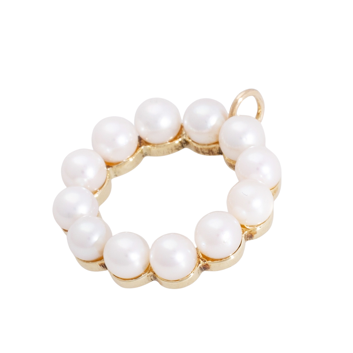 Pendant with 12 cultured Akoya pearls, arranged in a circle, white, D: ap. 4.3 mm, good lustre, 14K yellow gold, 3.4 g, D: ap. 22 mm, late 20th century, minimal signs of wear.
