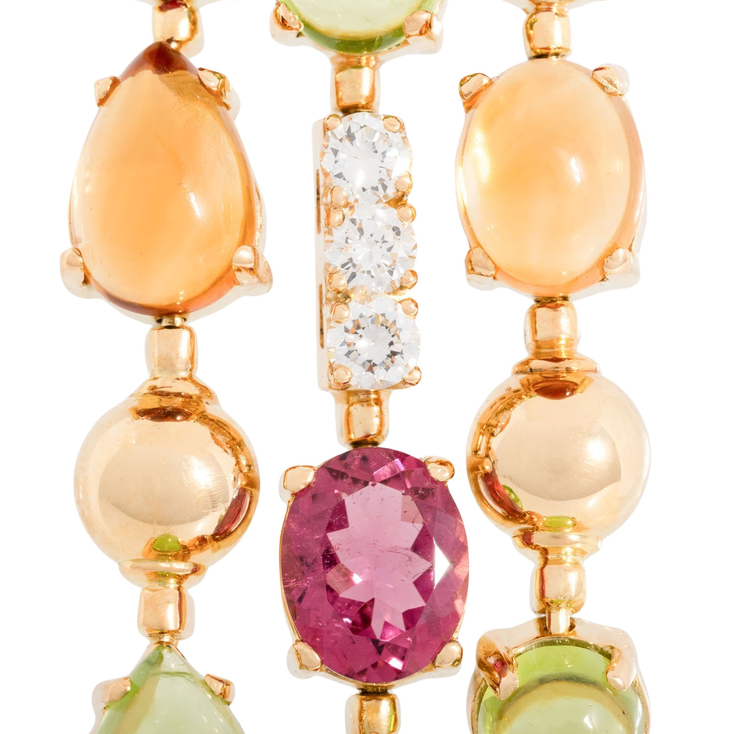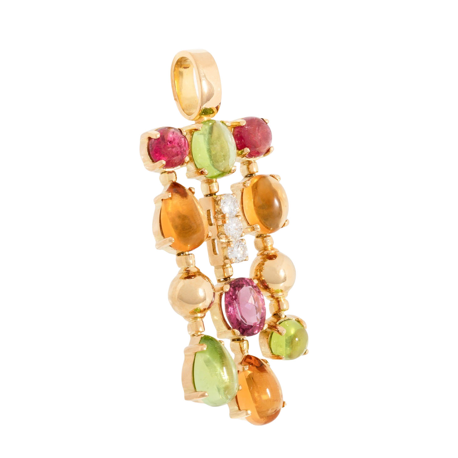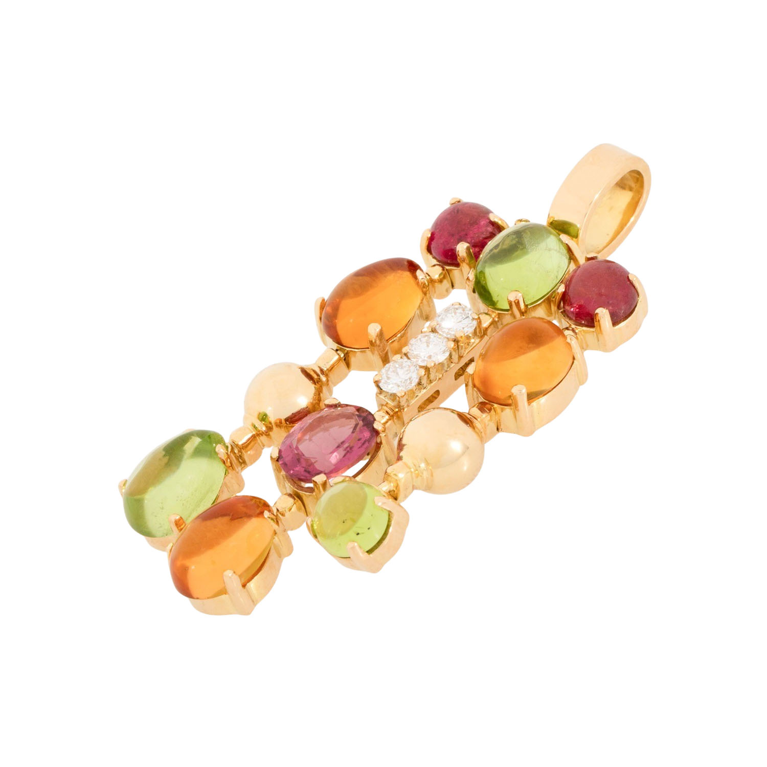 Pendant with 3 brilliant cut diamonds, total. ap. 0.66 ct, WHITE (H)/VS, faceted and smooth-cut coloured gemstones (tourmaline, olivine, citrine), 18K gold, 30.3 g, L x W: ap. 64 x 25 mm, 21st century, minimal signs of wear.