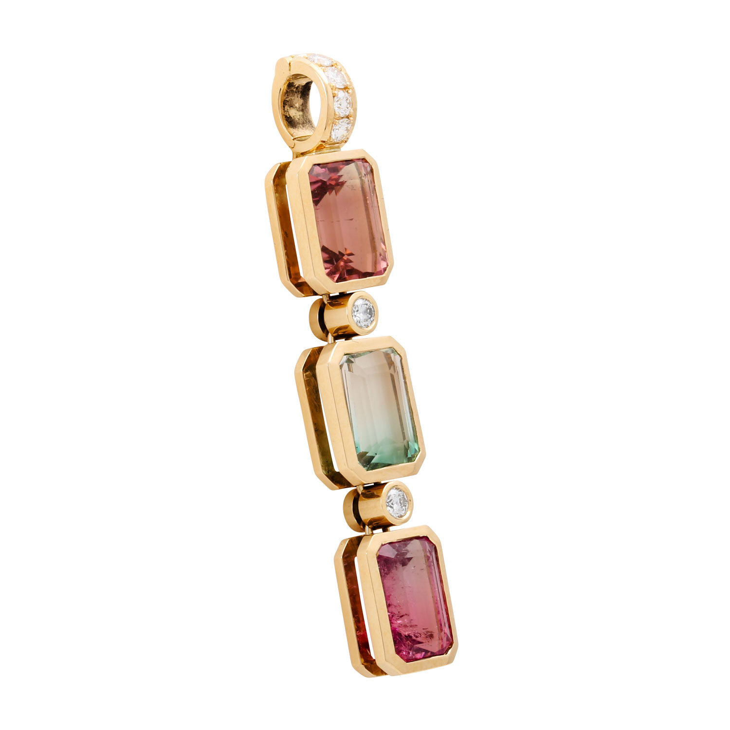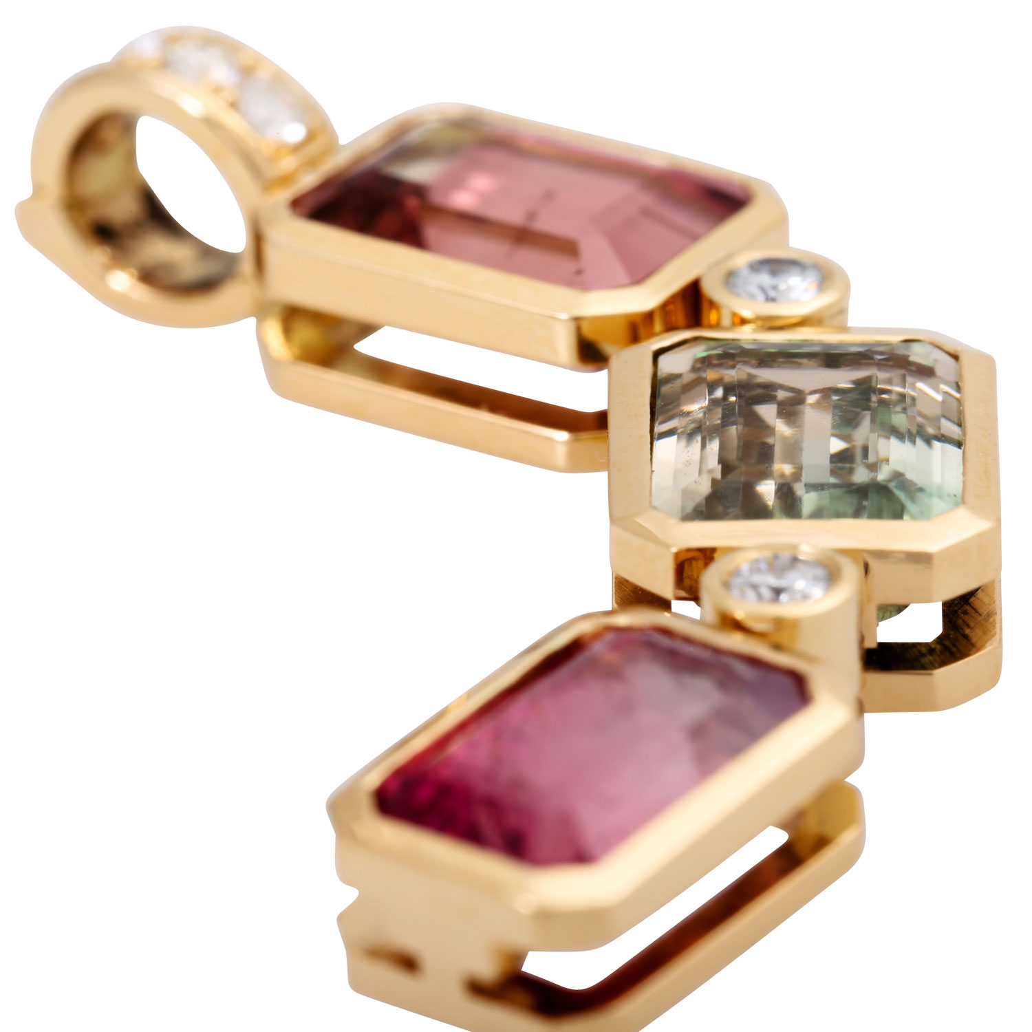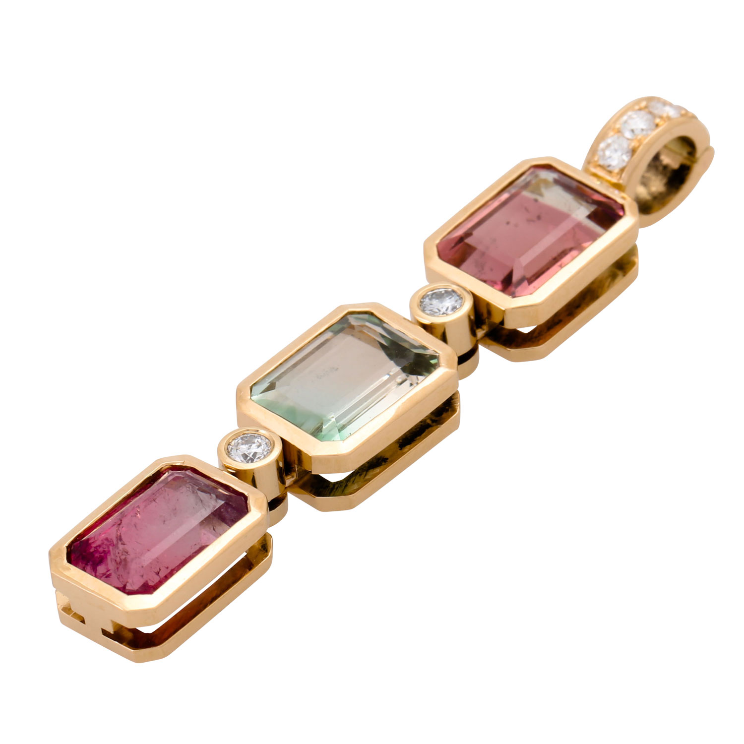 Pendant with 3 tourmalines, total ca. 9.43ct and 6 brilliant-cut diamonds, totalling ca. 0.28 ct RW (G)/VS, YG 18K, 9.5 g, L x W 64 x 8 mm, 21st century, high quality goldsmith's work.
