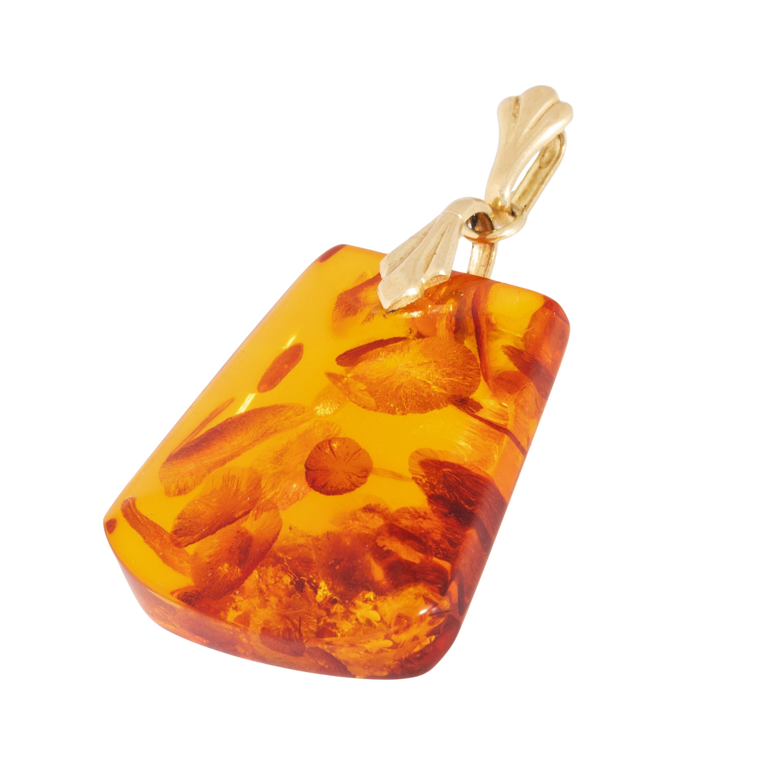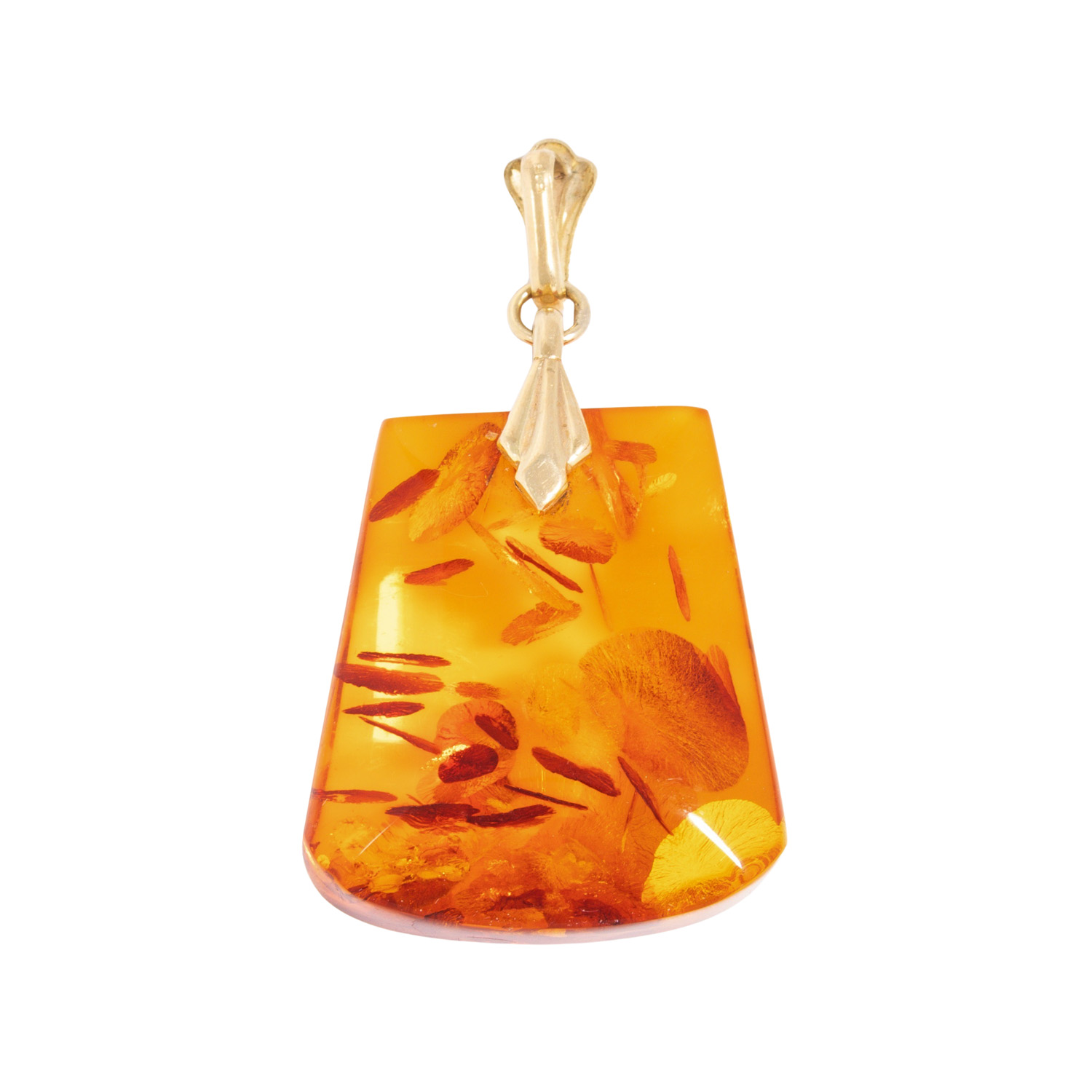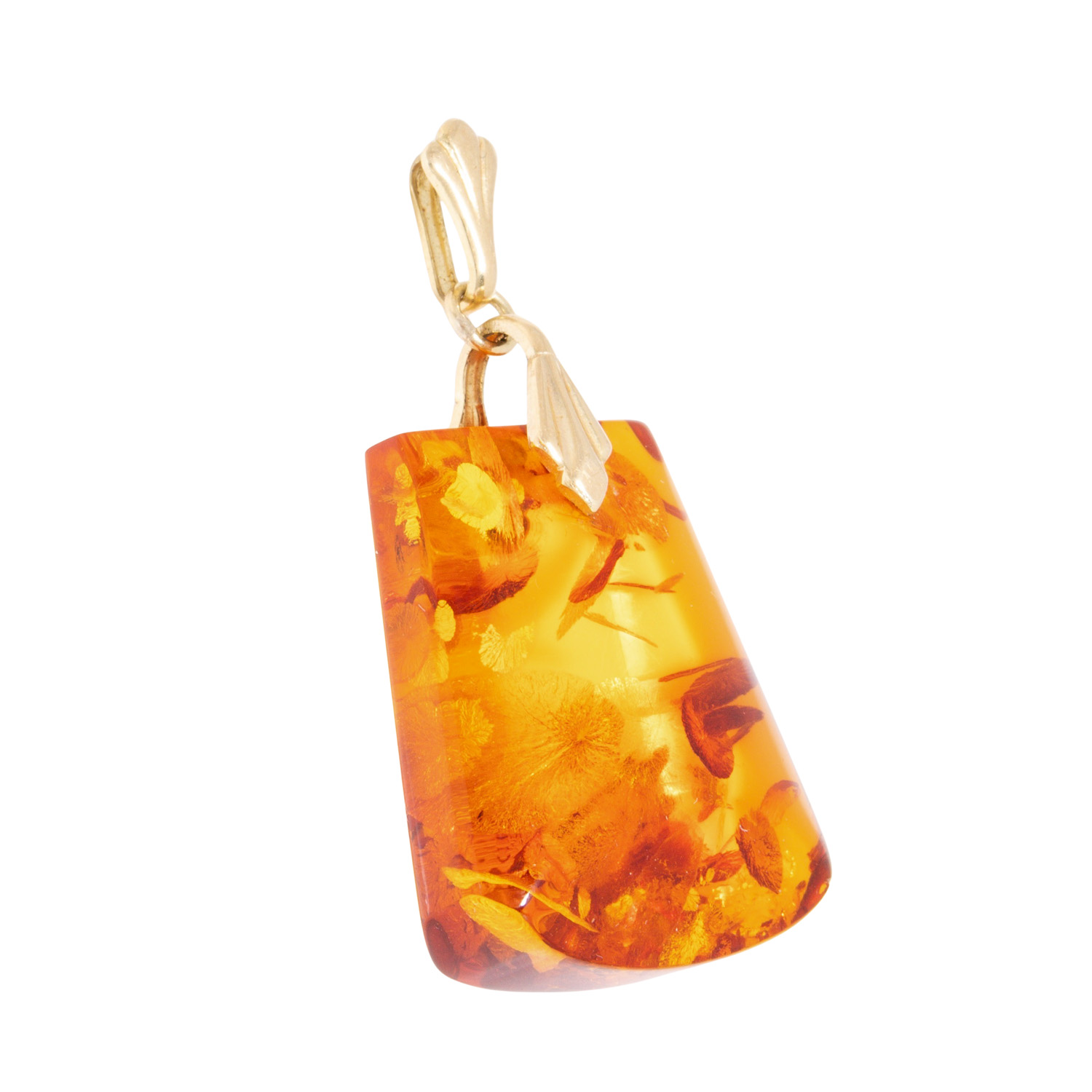 Pendant with amber, YG 14K, 4.8 g. L x W 40 x 28 mm, 21st century, good condition.