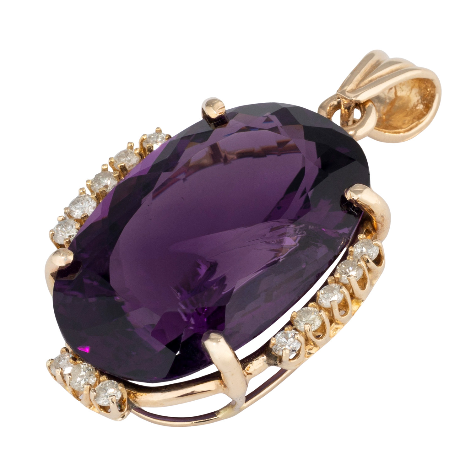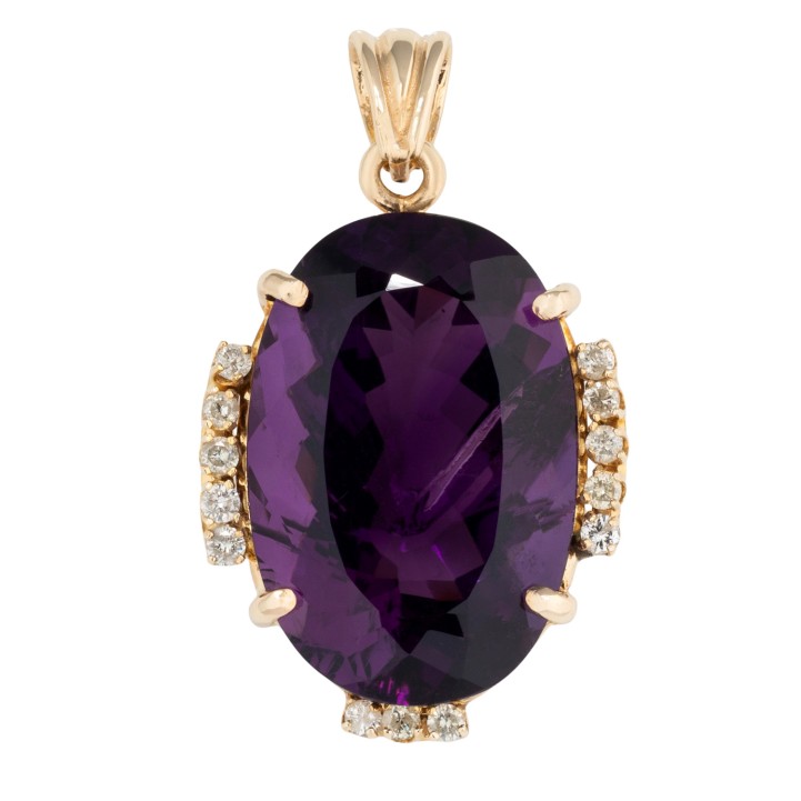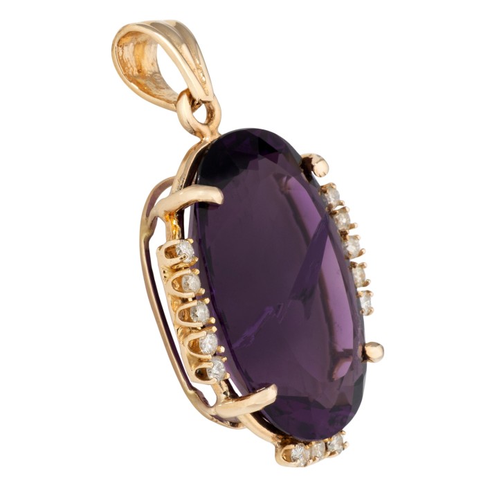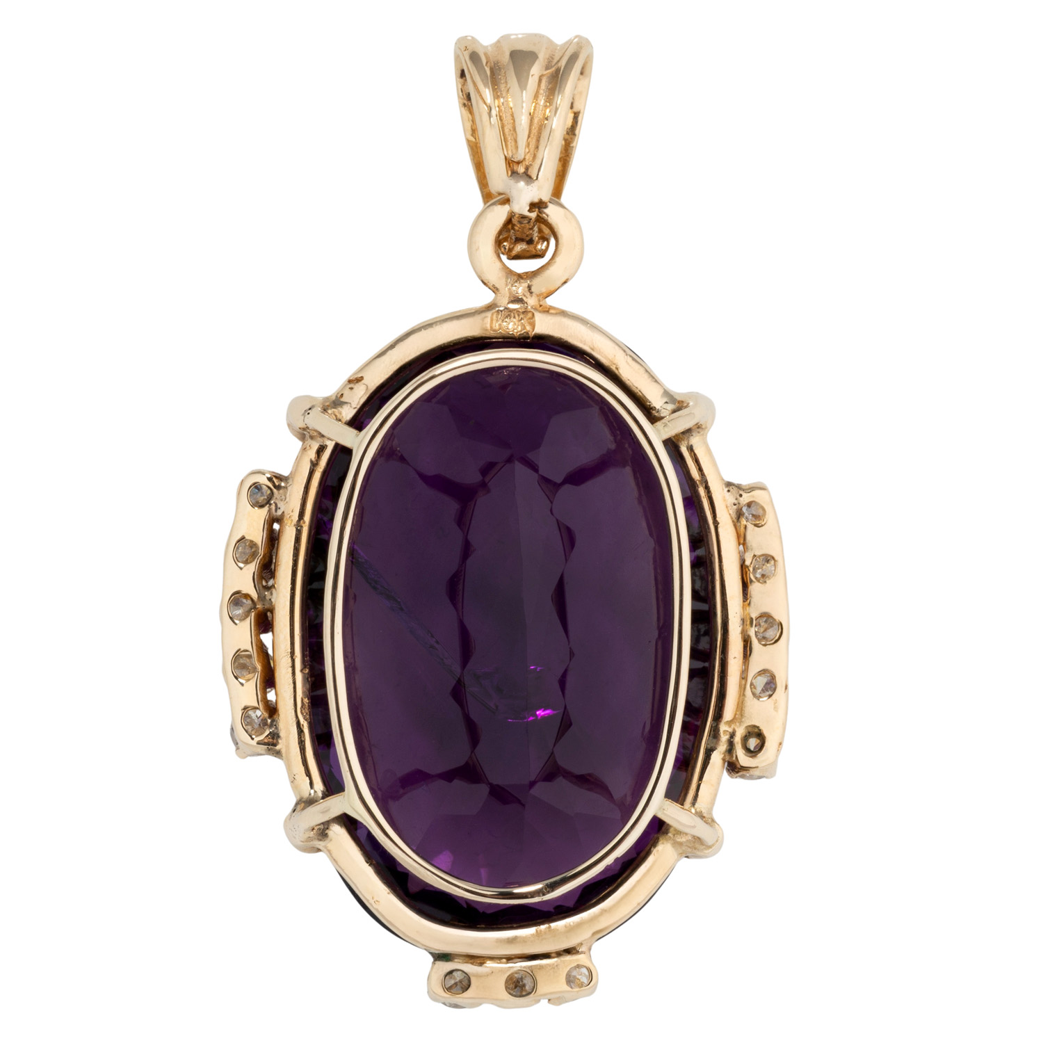 Pendant with oval star-cut amethyste ca. 50 ct, intense colour and brilliant-cut diamonds totalling ca. 0.65 ct, good to medium colour and clarity, 14K yellow gold, 21 g, 5x3 cm, 2nd half of 20th century, good condition, signs of work, handcrafted.